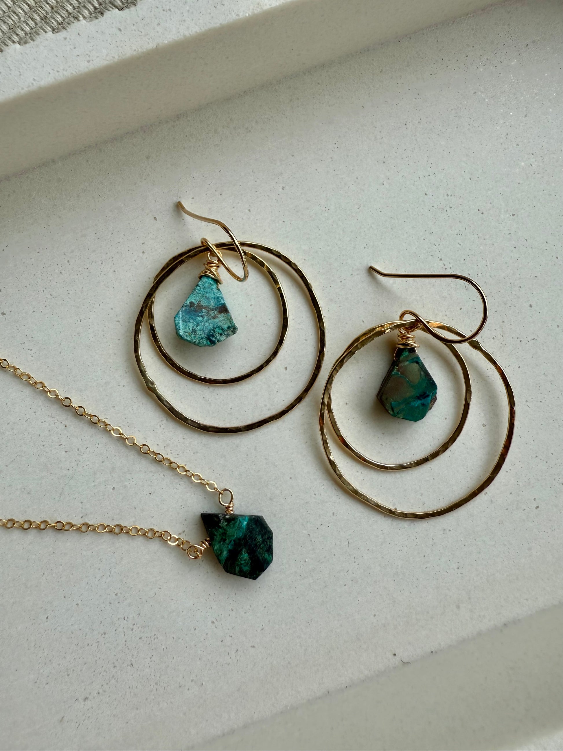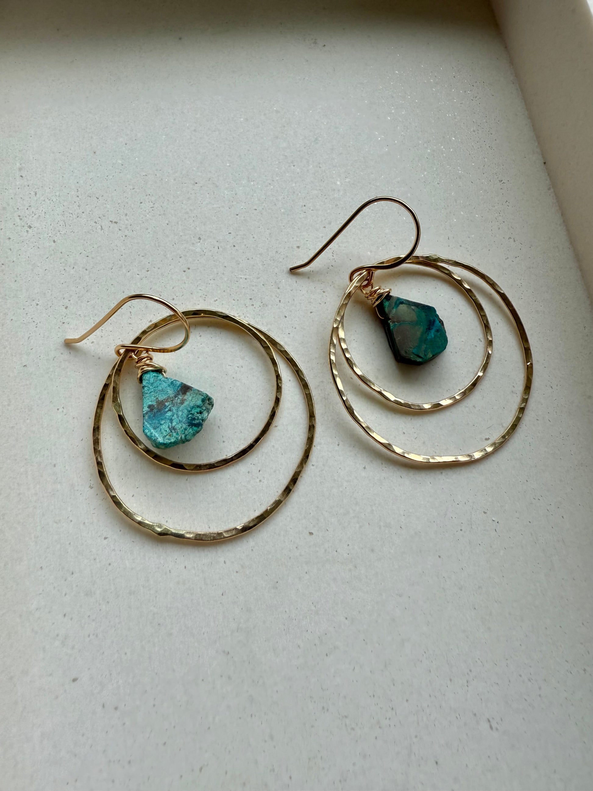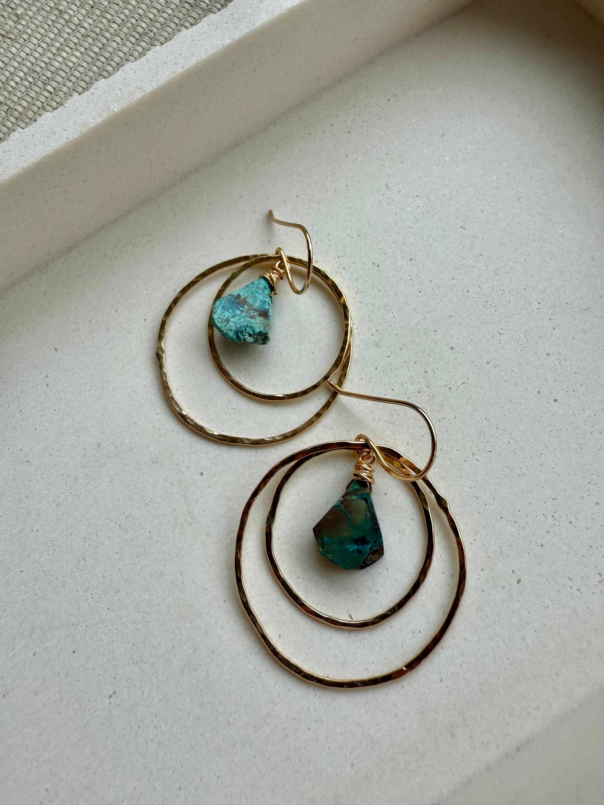 Earthy, bold, and beautifully imperfect—these double hoop earrings feature a raw African turquoise teardrop suspended from hand-forged hammered hoops. Each pair includes one small and one large organic circle, creating layered dimension and movement. The stones vary naturally in shades of green, blue, and brown, making every pair one of a kind.