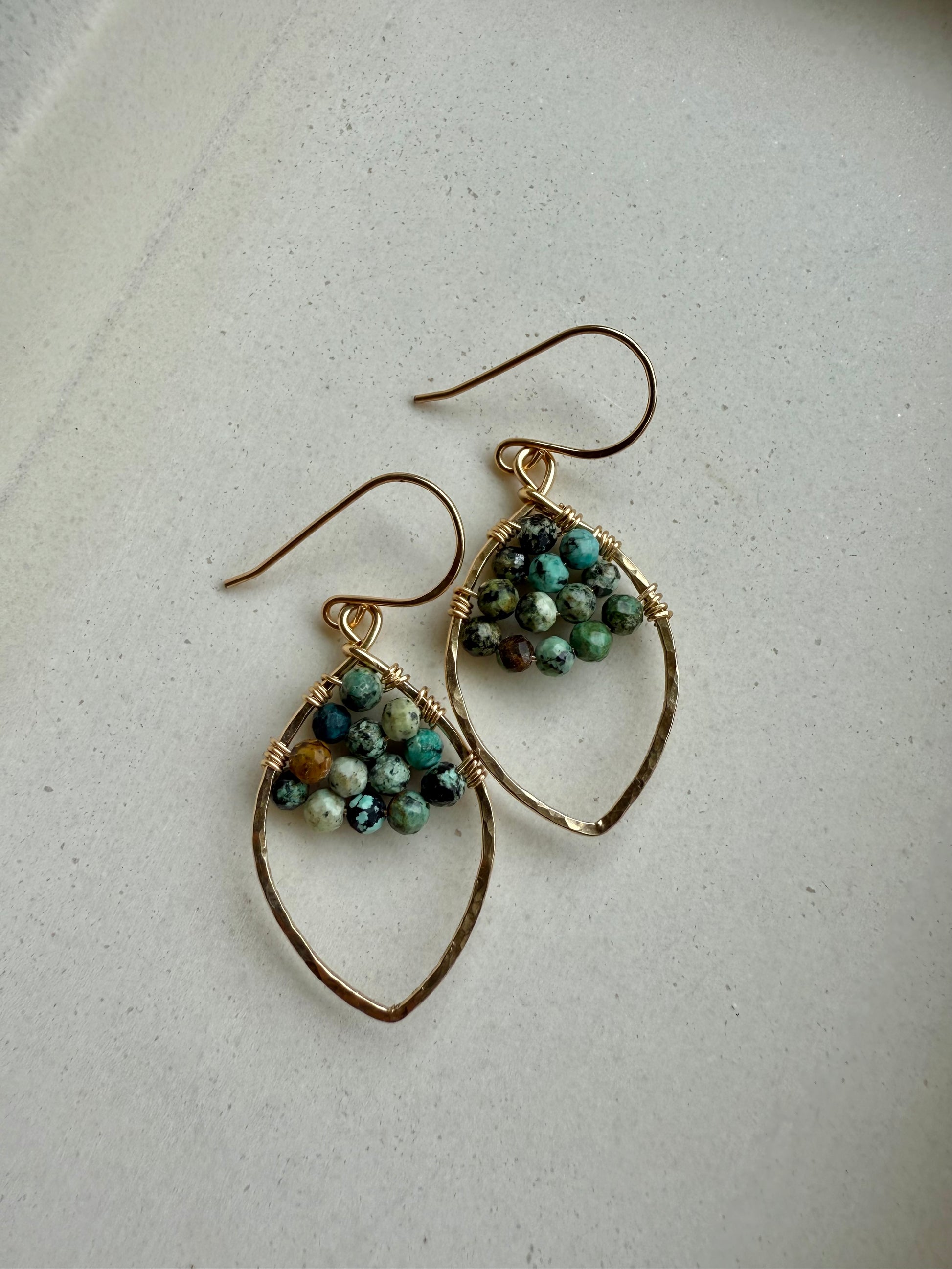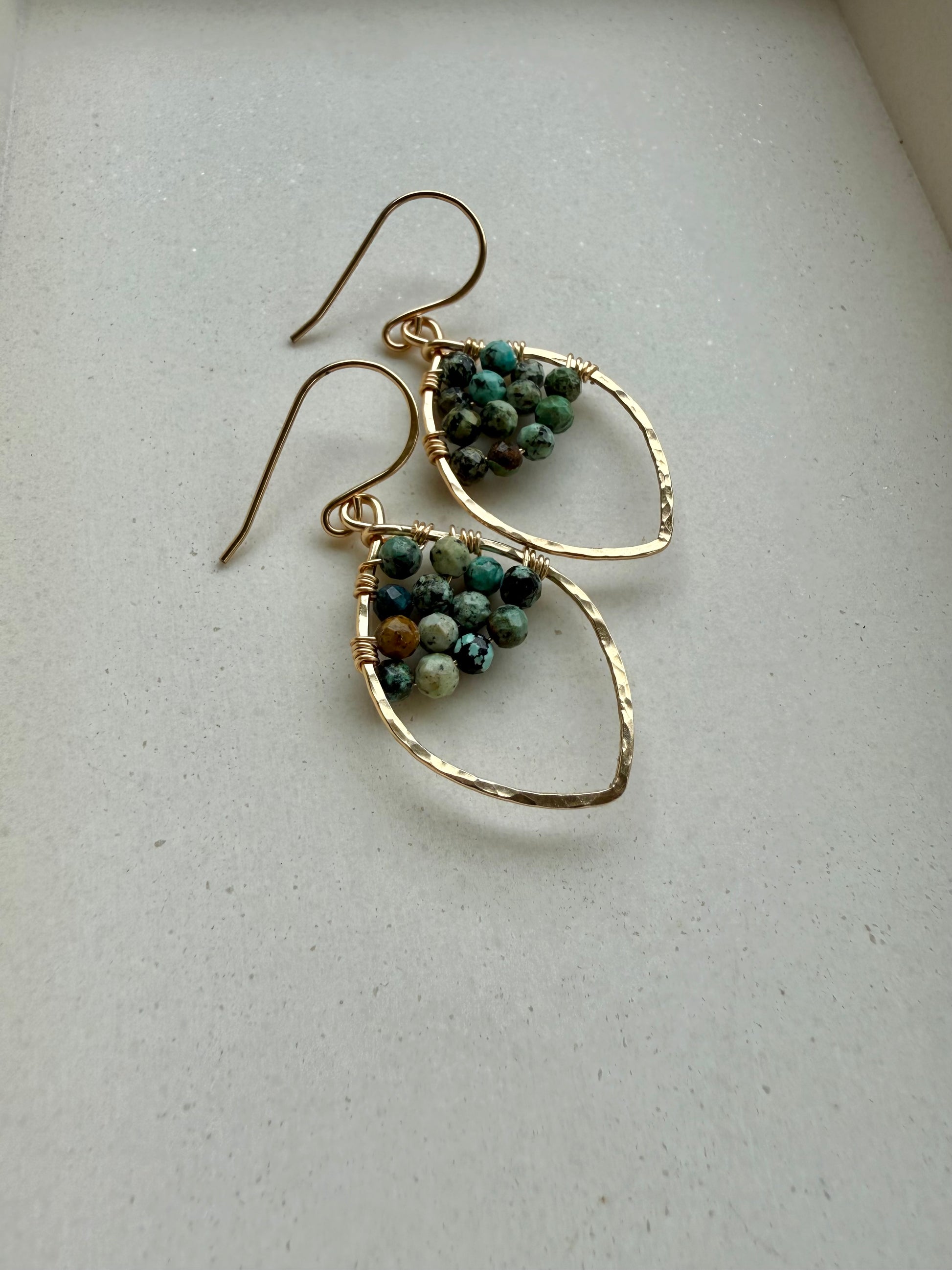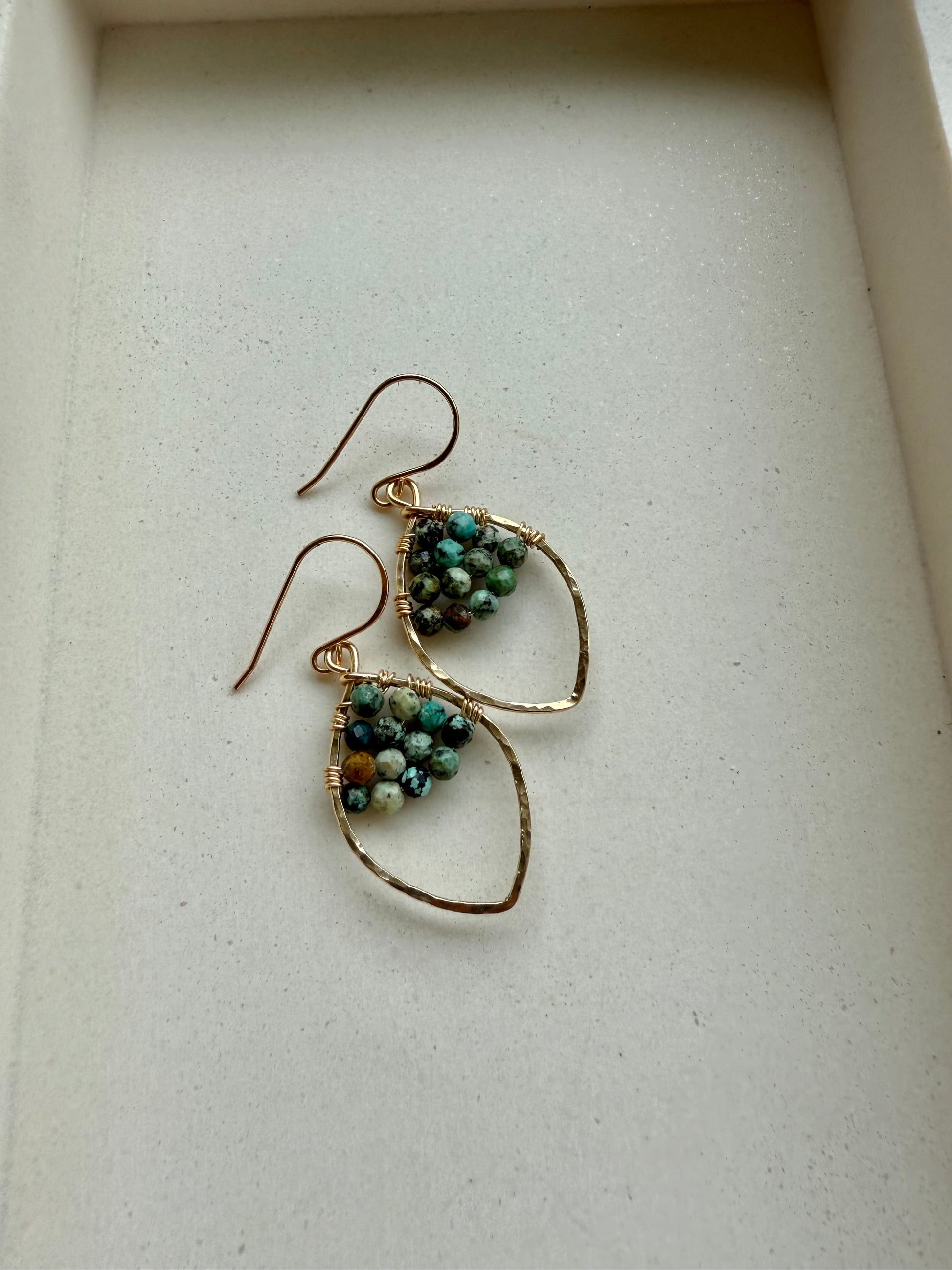 A blend of ocean tones and earthy texture, these hand-forged petal-shaped hoops are wrapped with a cluster of small African turquoise stones. Each stone has its own unique pattern of green, brown, and black, reminiscent of pebbles scattered along the tide line.