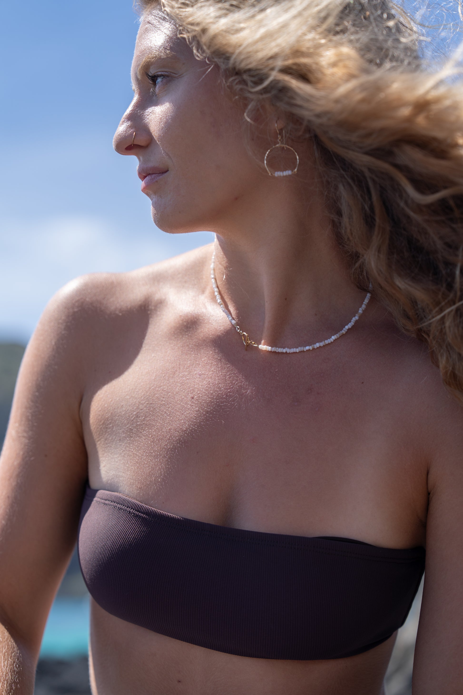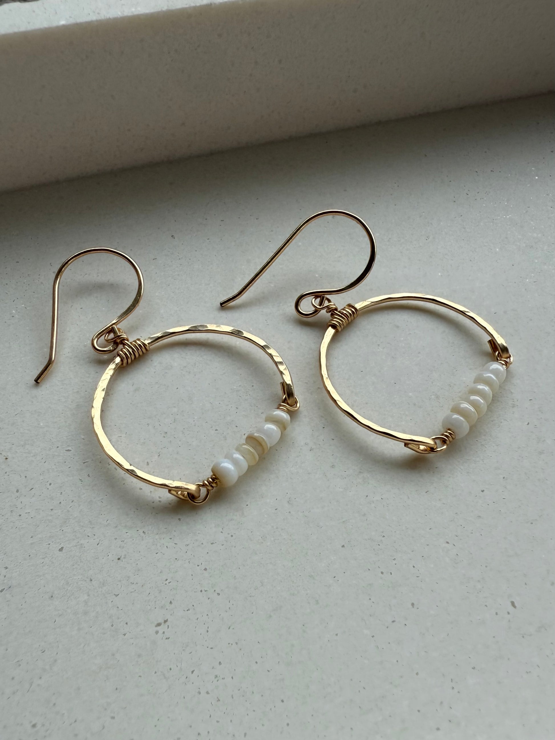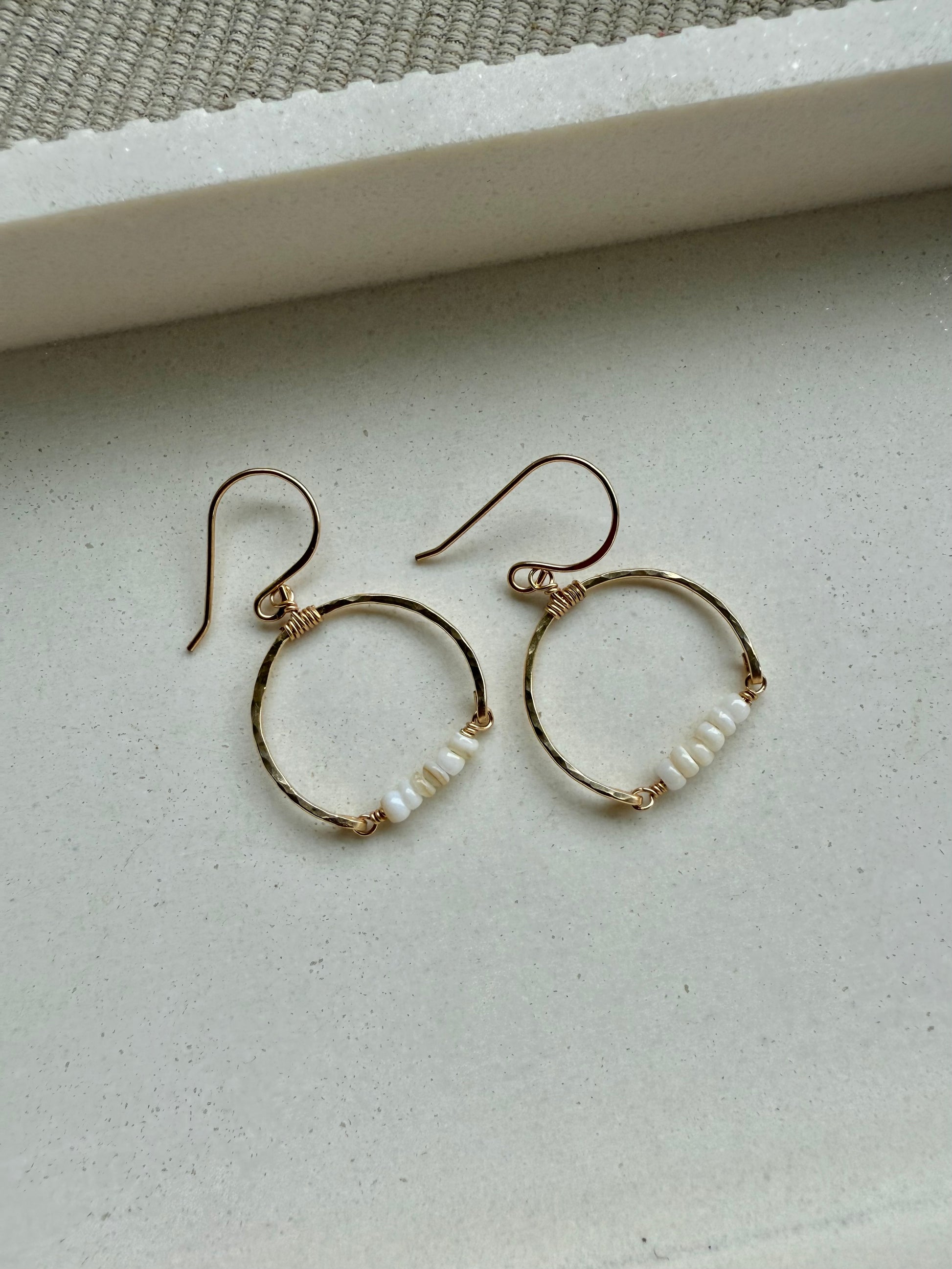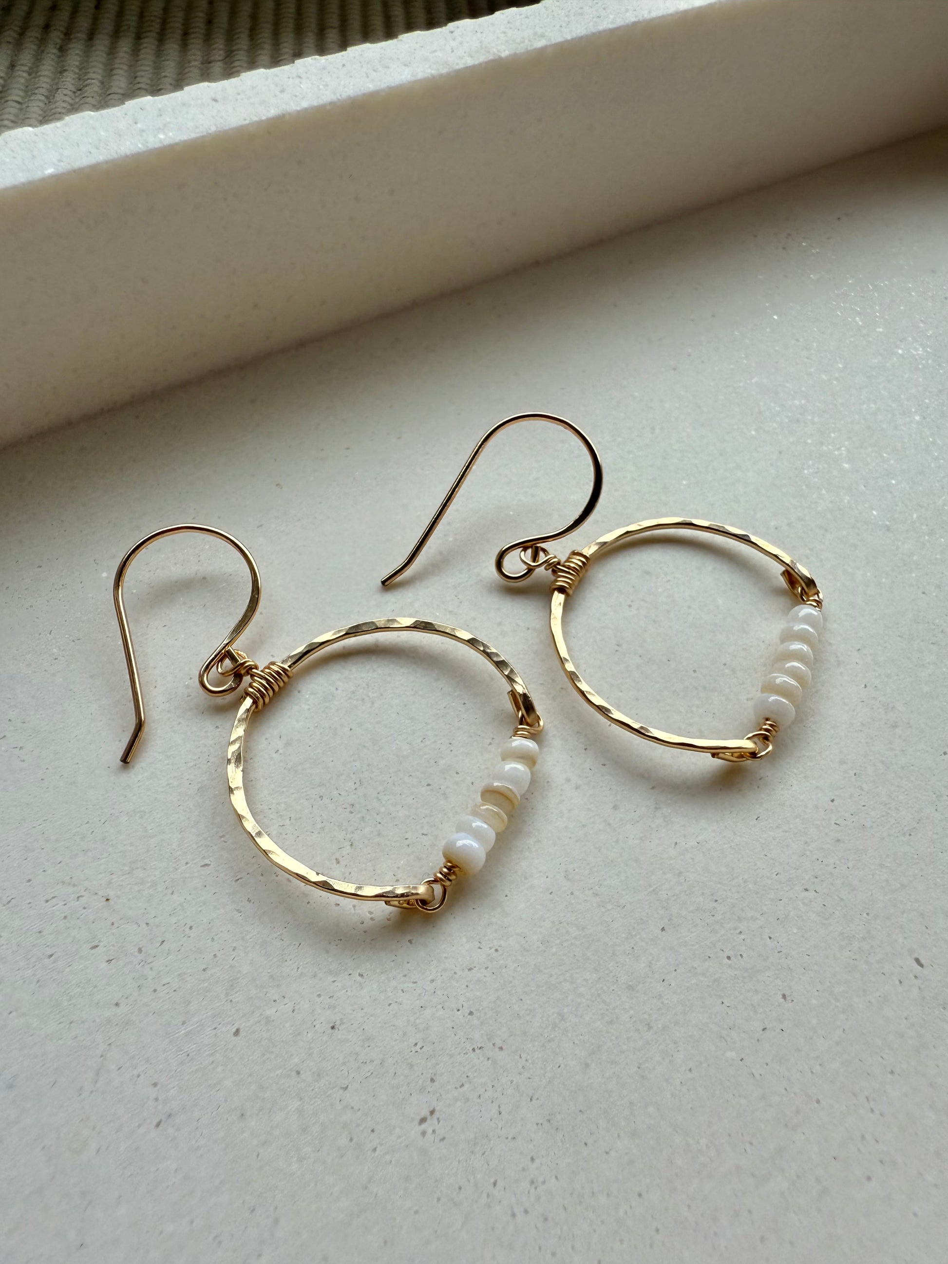 Delicate and breezy, these hammered gold hoops feature naturally sourced freshwater shell beads, dyed to a soft creamy white for a sun-bleached, ocean-worn look. Each pair is hand-formed and wire-wrapped with care, creating an organic yet elevated design that’s perfect for beach days or dressed-up island evenings.