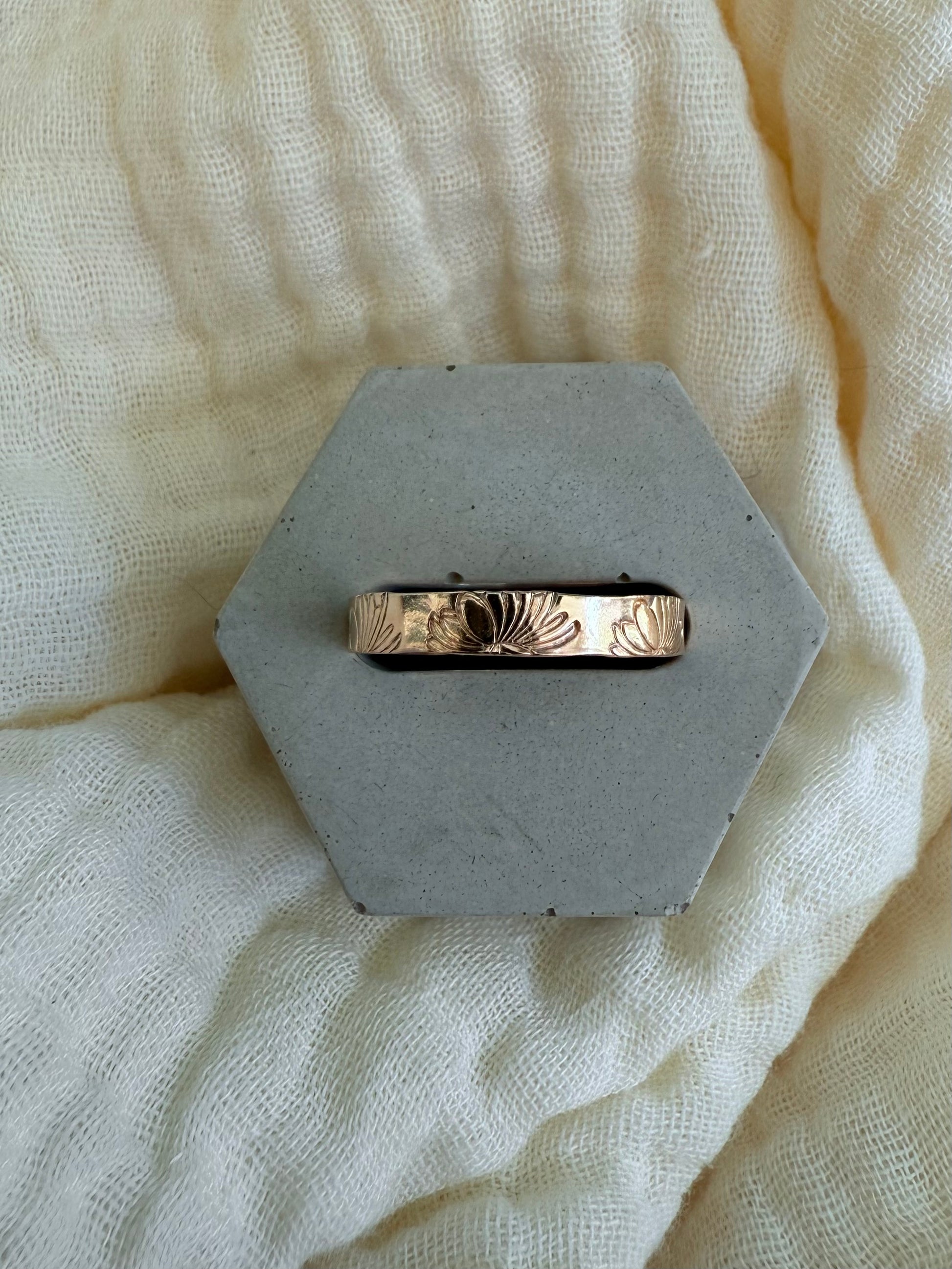 This Birth Flower Ring features unique hand stamping, adding a personal touch to each piece.