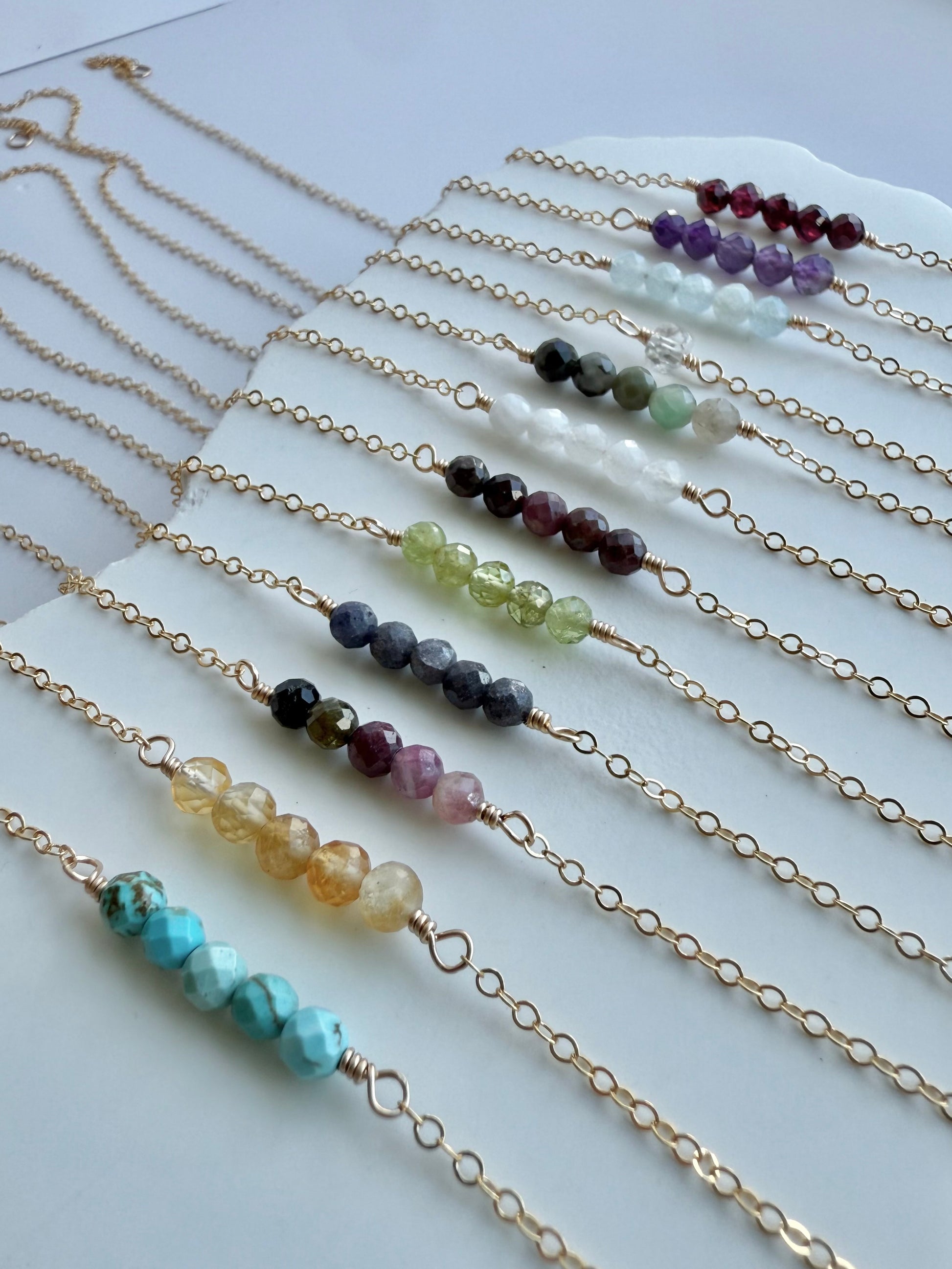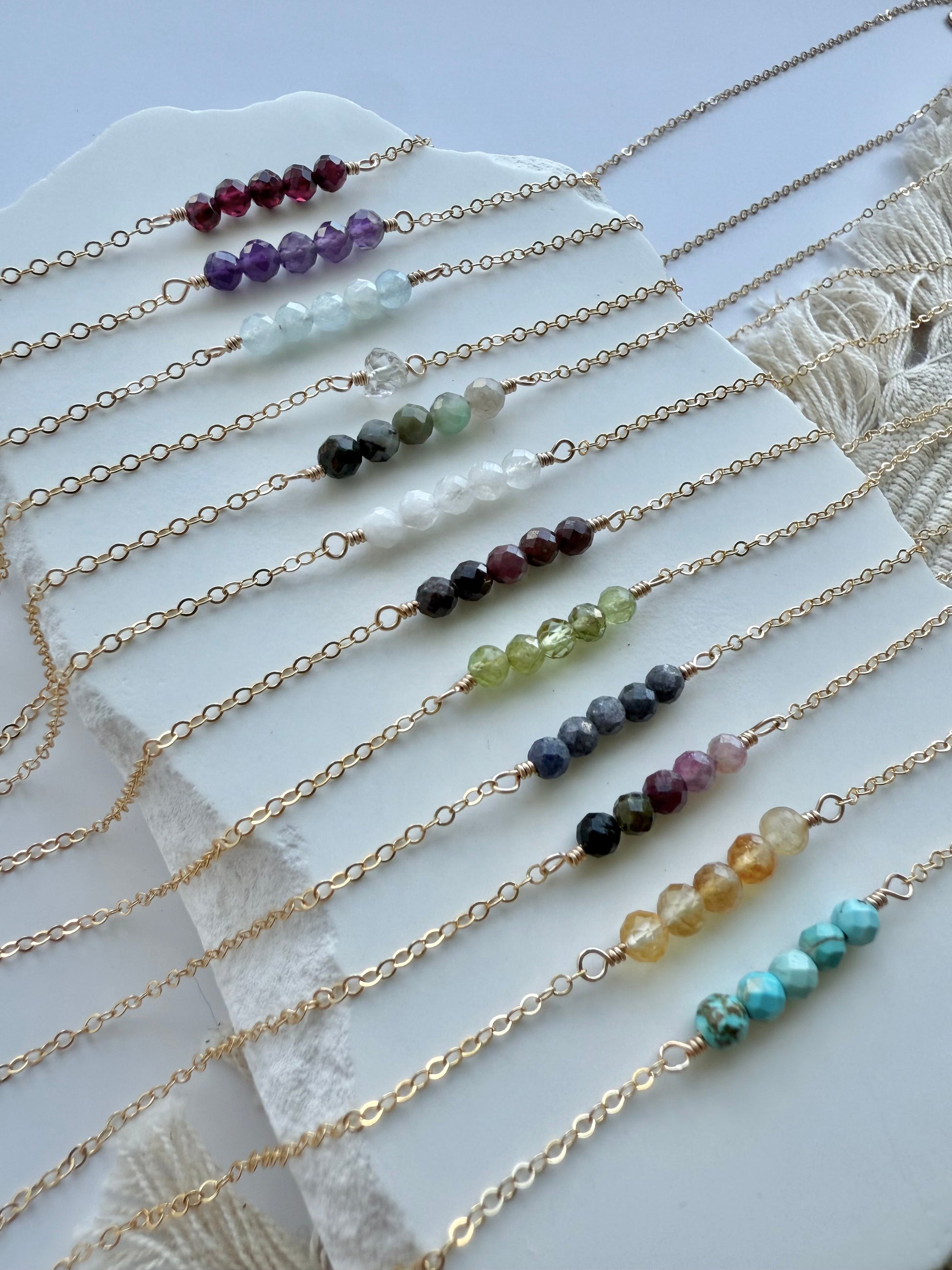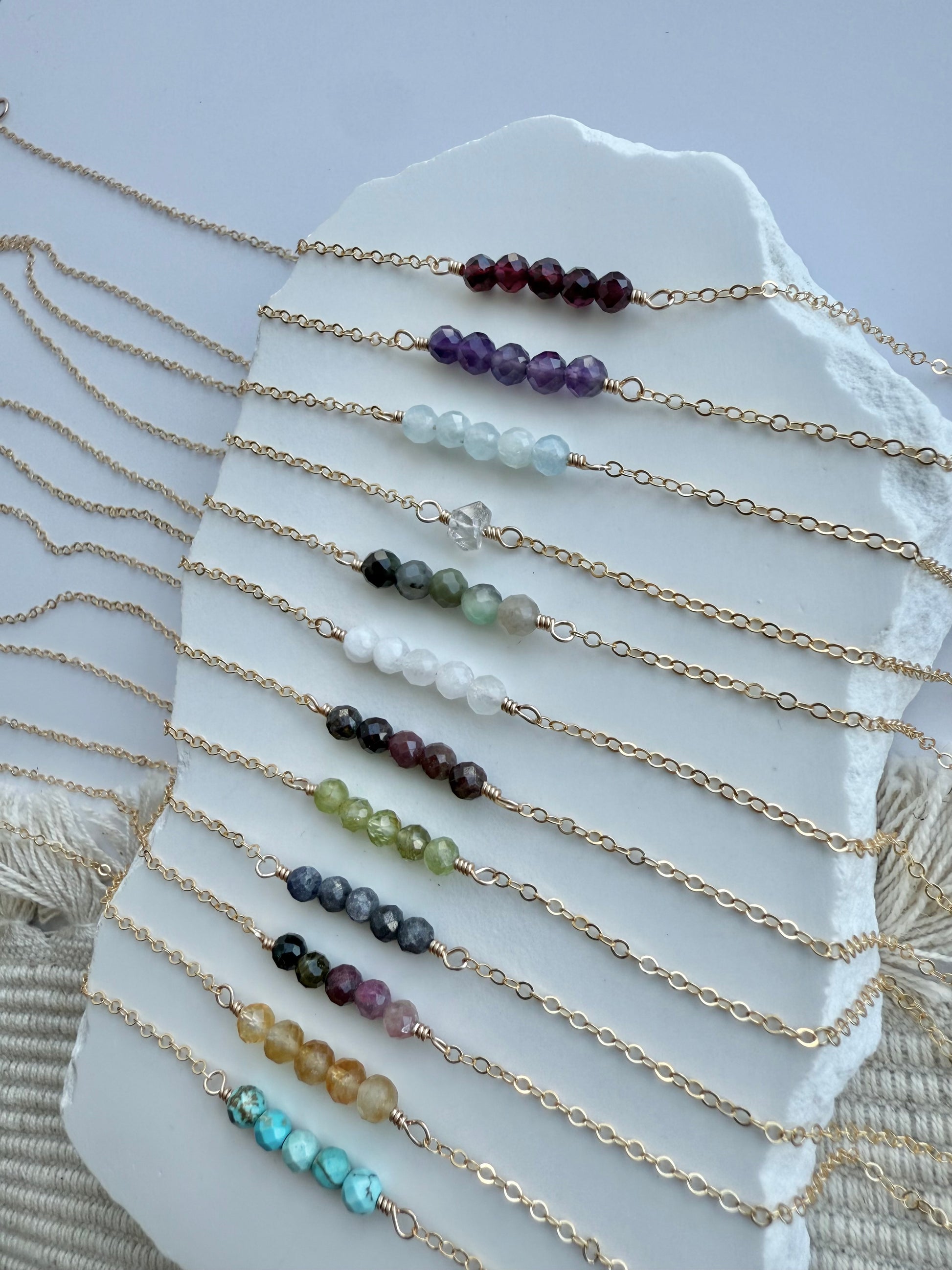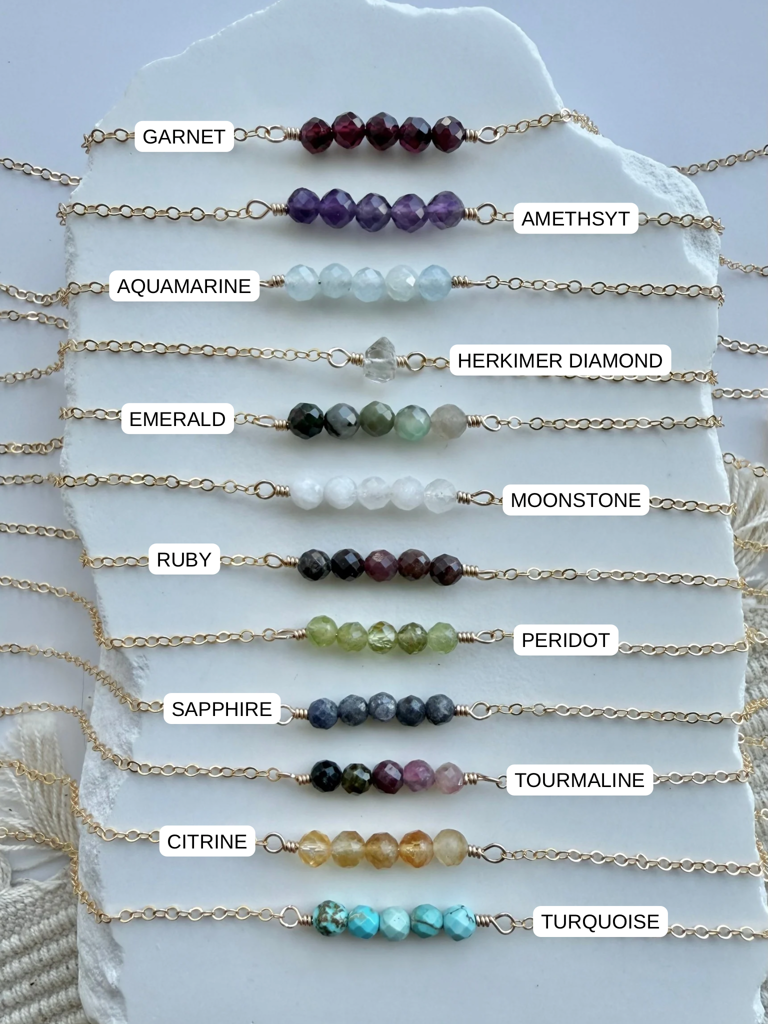 A meaningful, minimalist piece you’ll never want to take off—these birthstone bar necklaces feature five hand-selected, genuine gemstones (except Herkimer Diamond, which comes as a single stone) strung delicately on your choice of 14k gold filled (yellow or rose) or sterling silver chain.
