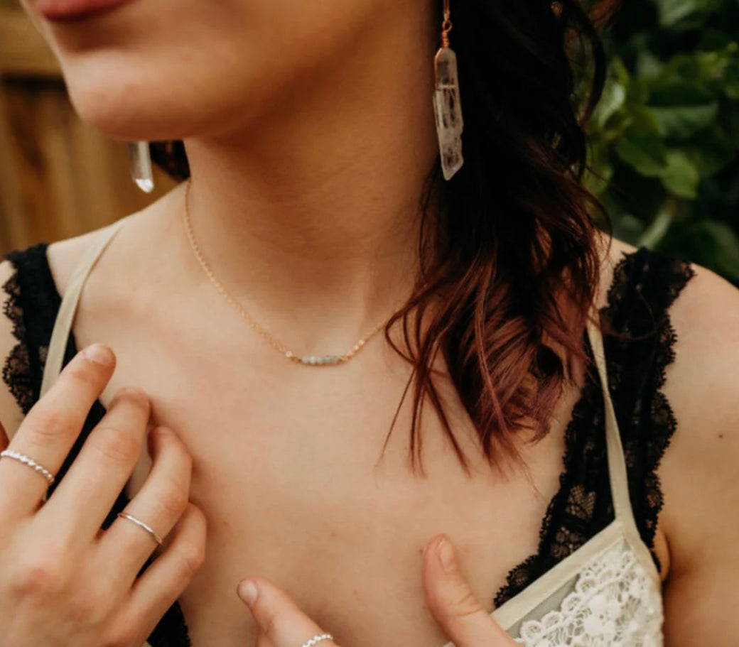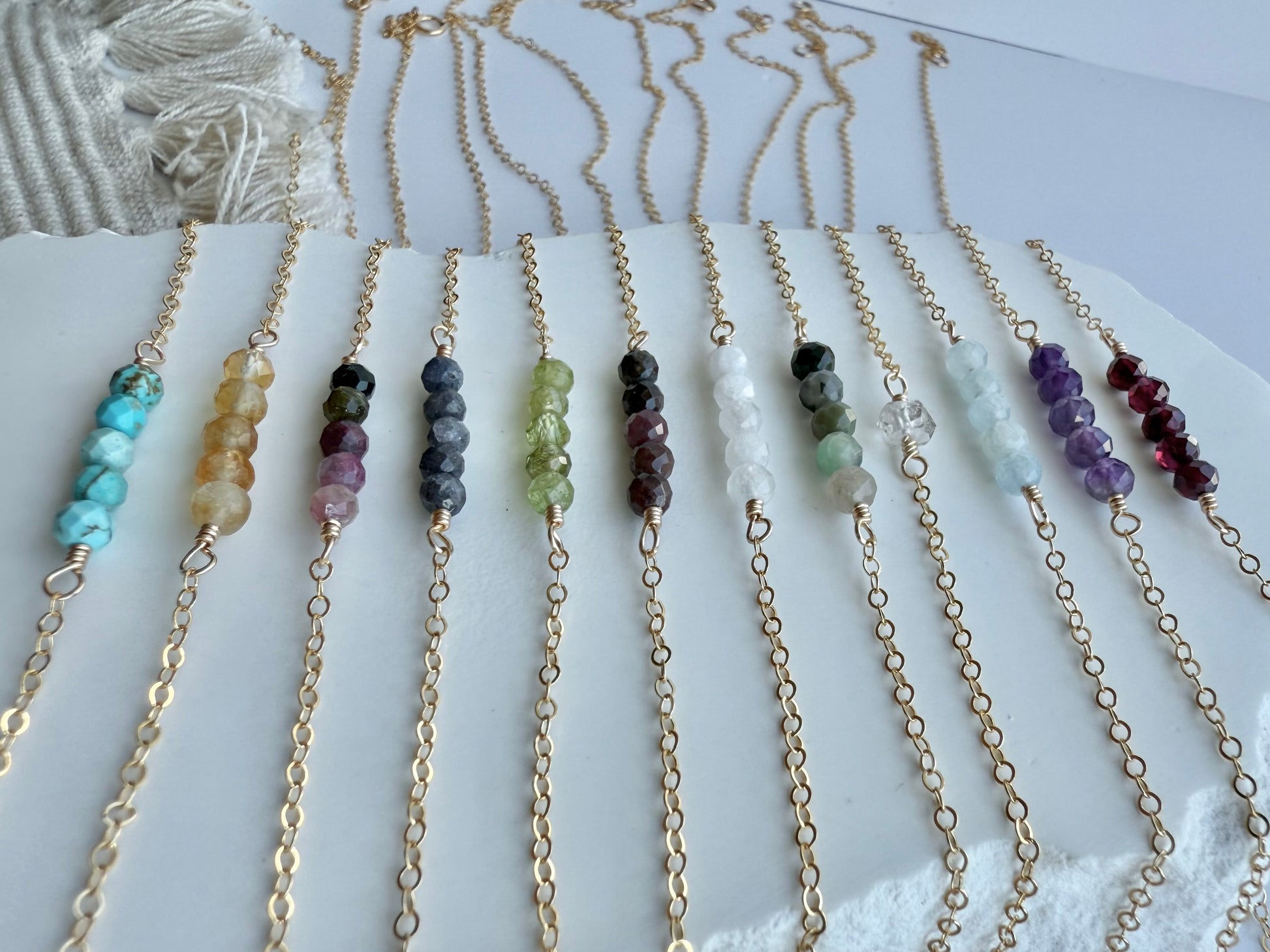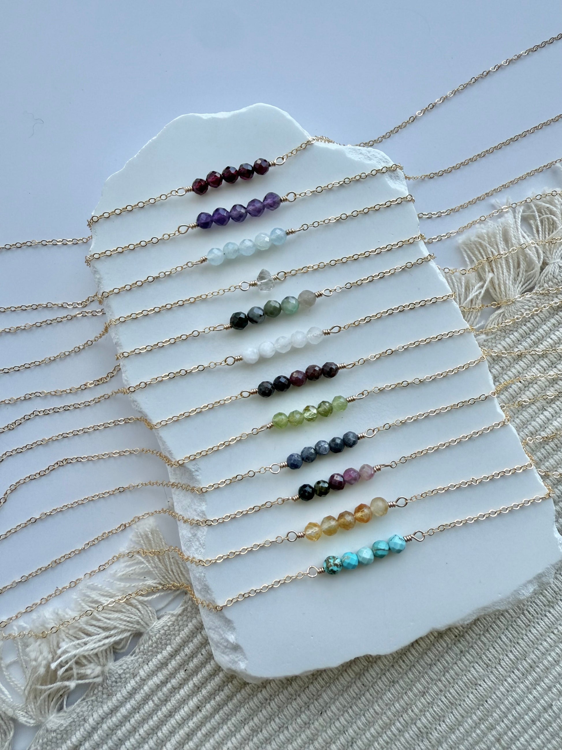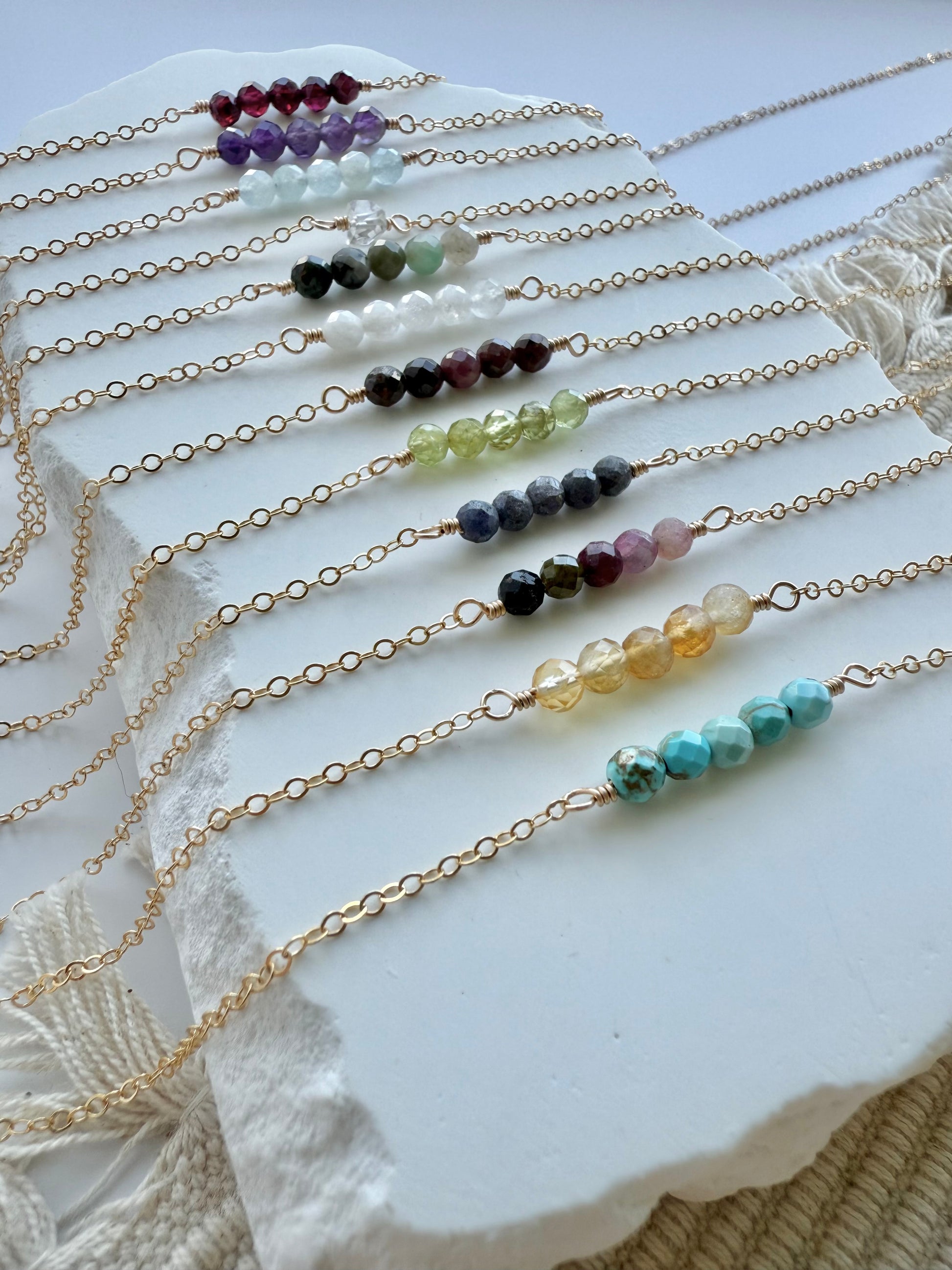 A meaningful, minimalist piece you’ll never want to take off—these birthstone bar necklaces feature five hand-selected, genuine gemstones (except Herkimer Diamond, which comes as a single stone) strung delicately on your choice of 14k gold filled (yellow or rose) or sterling silver chain.