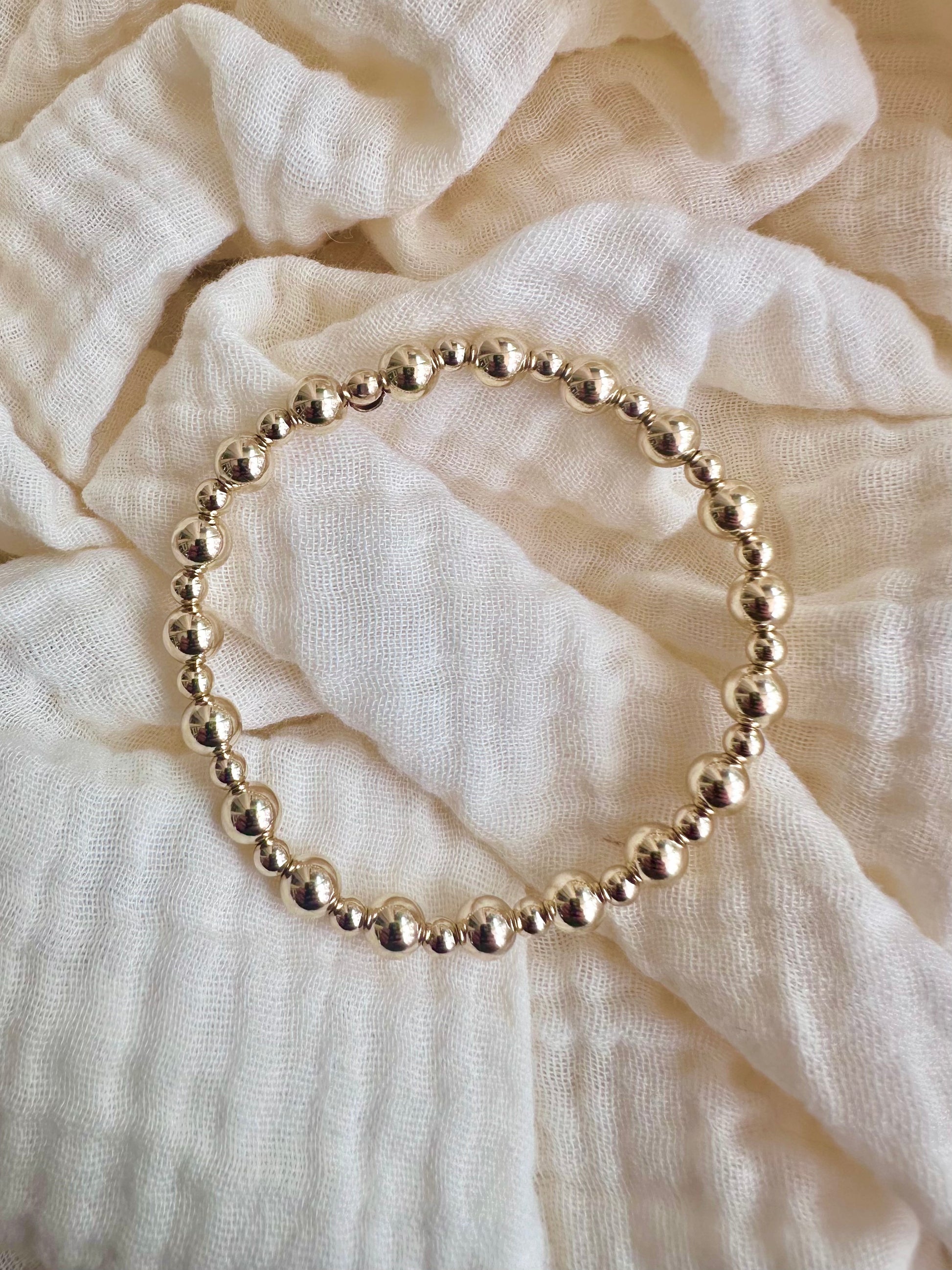Our Bubble Bracelet is a beautifully hand-strung piece featuring a mix of 6mm and 4mm beads, available in your choice of high-quality 14k gold-filled or sterling silver. Designed for everyday wear, these bracelets are crafted with a durable, stretchy cord that ensures a comfortable fit without tarnishing or discoloring your skin.