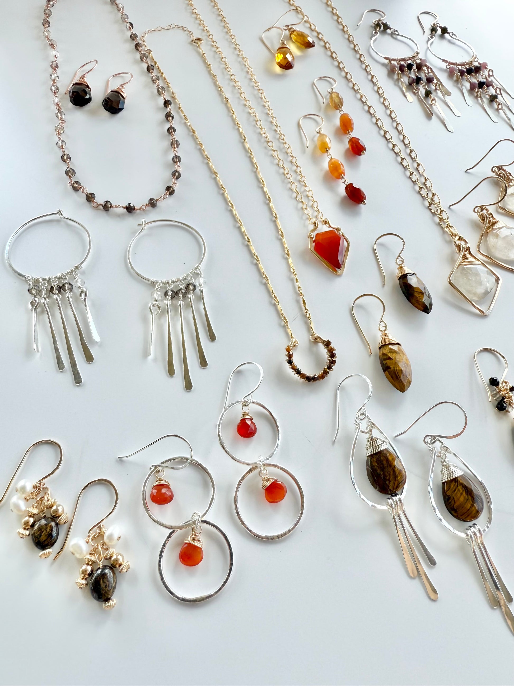 Each earring showcases two small faceted teardrop carnelians set at the top center of a hand-forged, hammered, soldered, and polished hoop. The hoops and ear wires are crafted from sterling silver, while the carnelian stones are wrapped in 14k gold-filled wire to highlight their vibrant color. A small twisted circle links the hoops, adding texture and allowing gentle movement that catches the light beautifully.