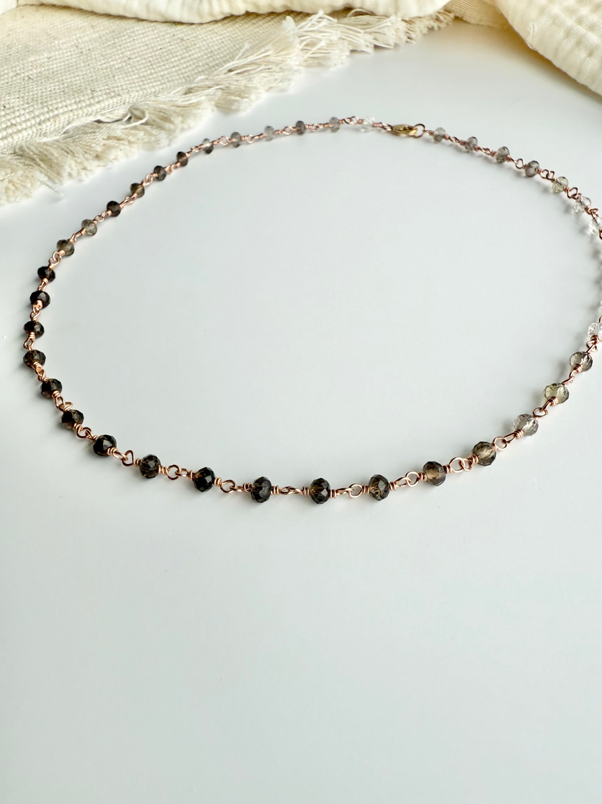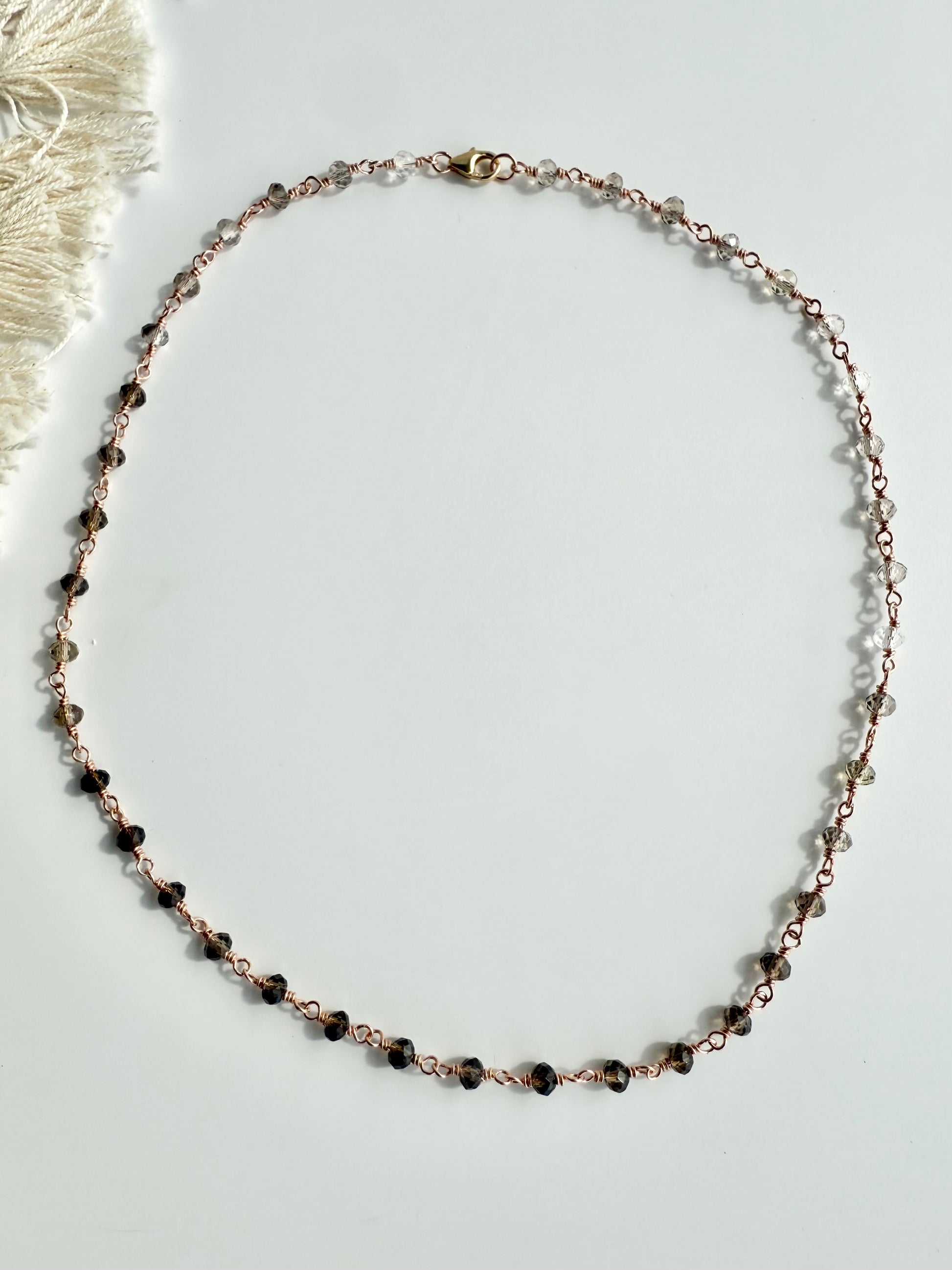 This necklace showcases AAA grade smokey quartz faceted beads, carefully hand-arranged in a beautiful ombre from deep grey to nearly clear. Each bead is individually wire-wrapped to form a delicate rosary-style chain.
