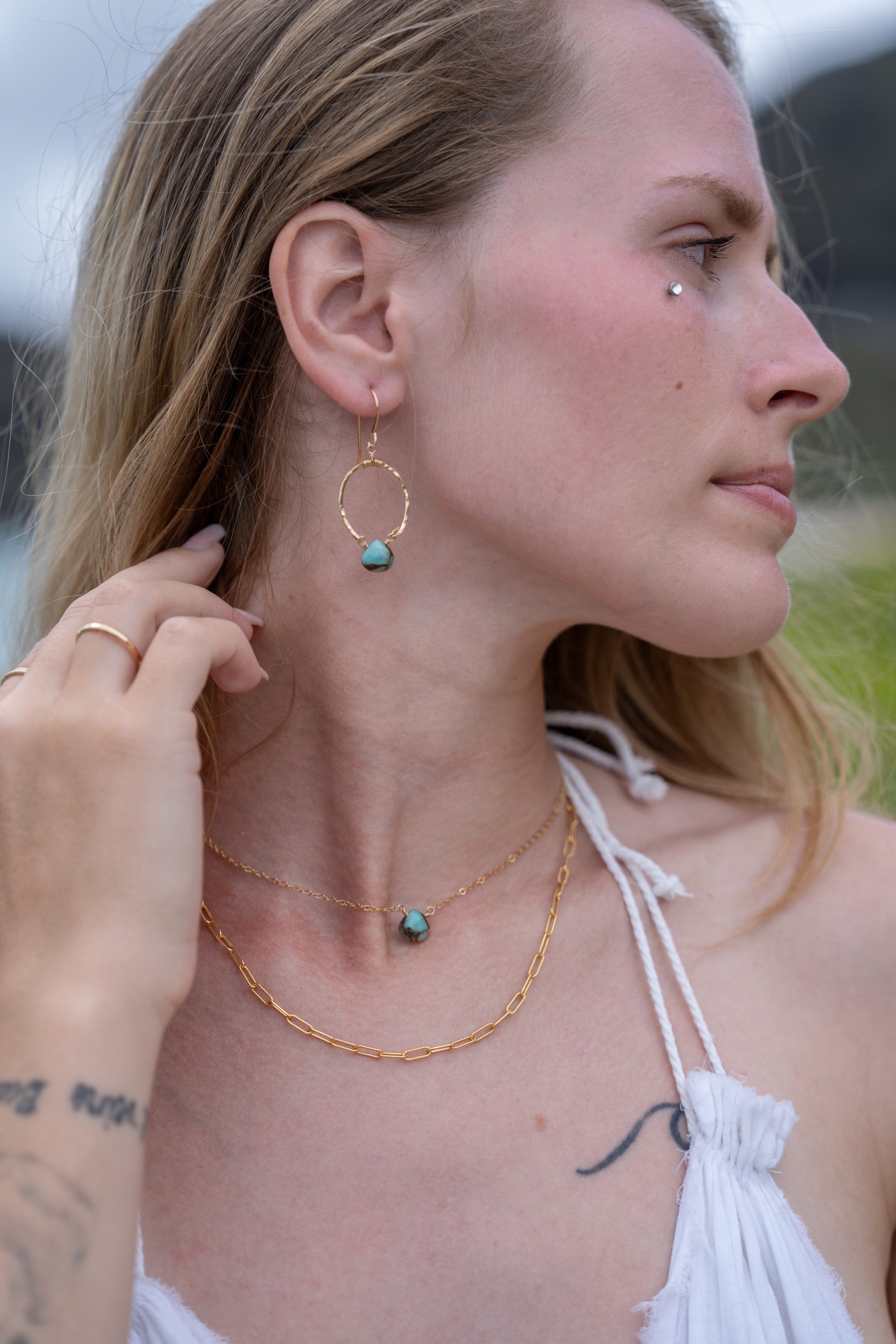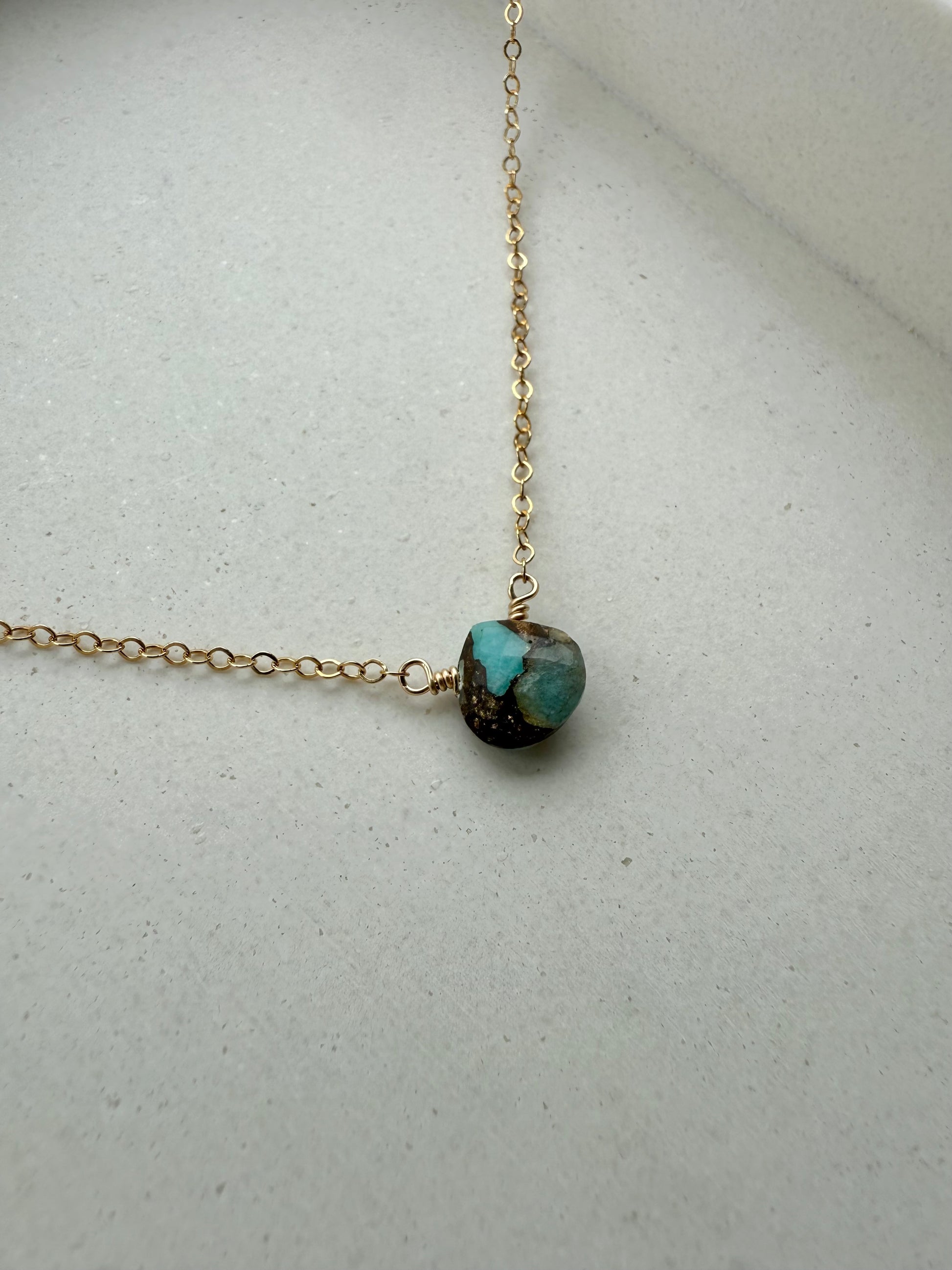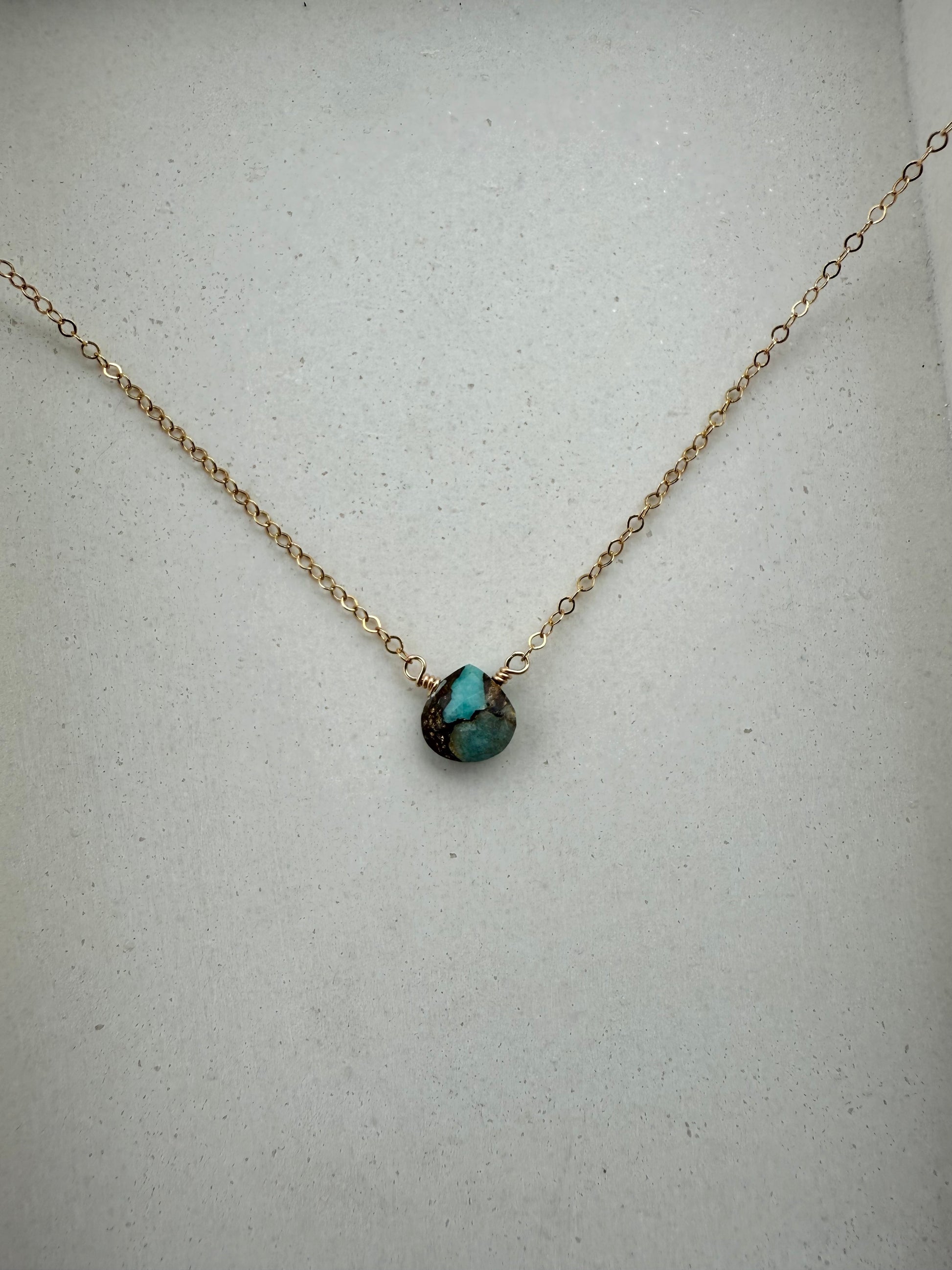 This minimalistic necklace features one uniquely shaped Copper Turquoise on the chain of your choosing.