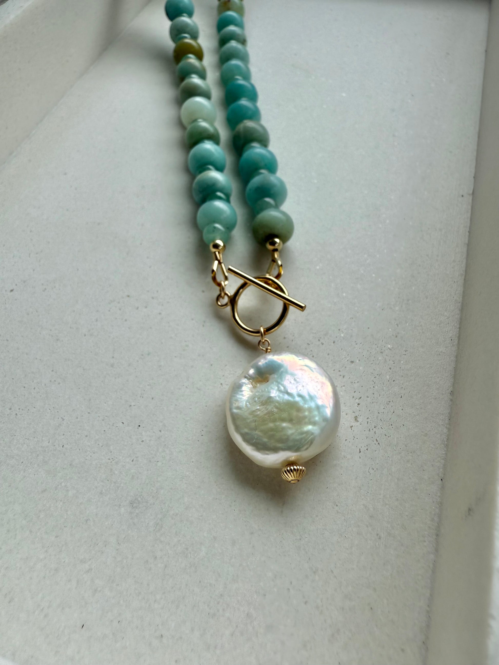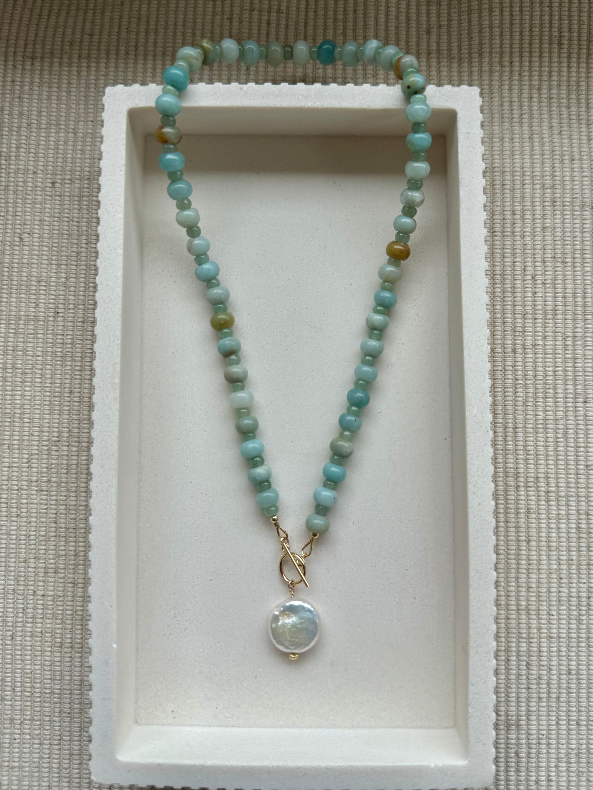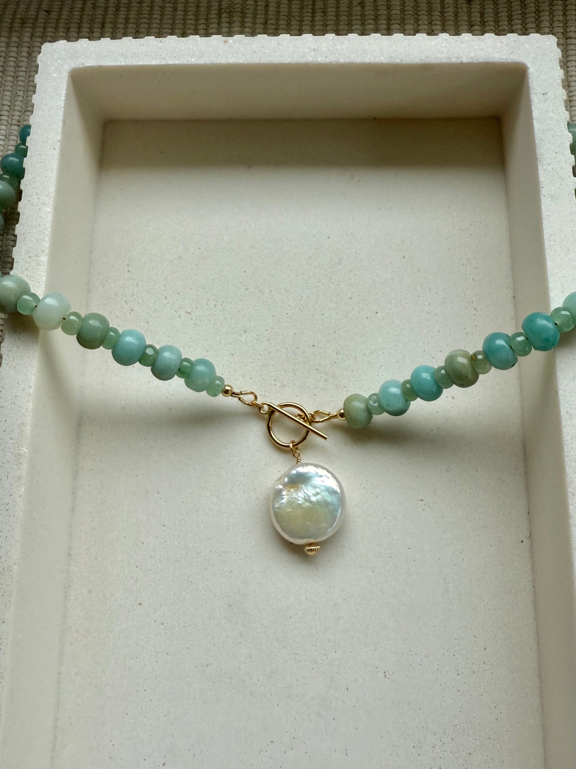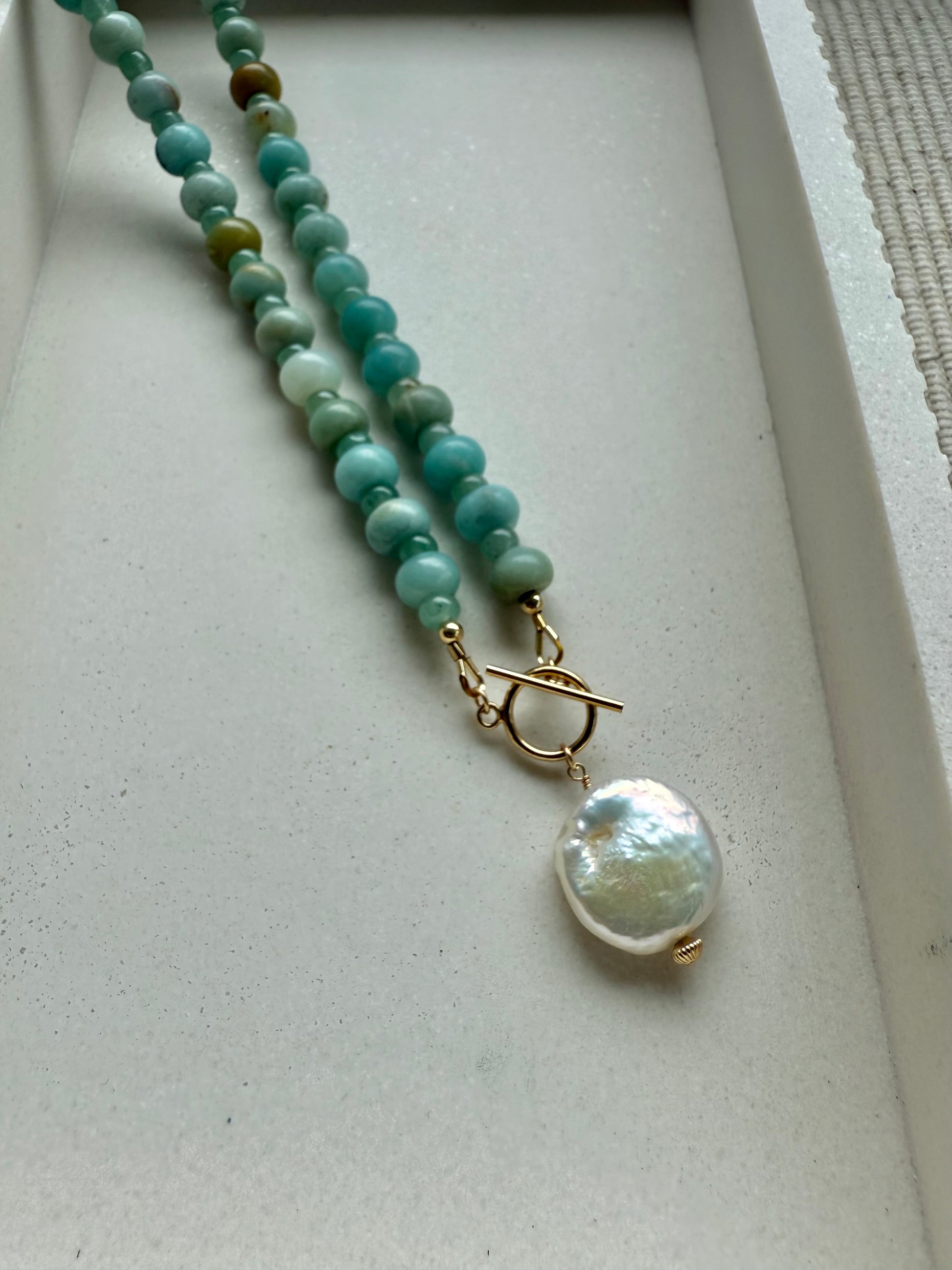 Soft, serene, and one of a kind. This beaded beauty features soothing tones of natural amazonite and green aventurine, finished with a glowing baroque pearl charm that hangs from a front-facing toggle clasp.