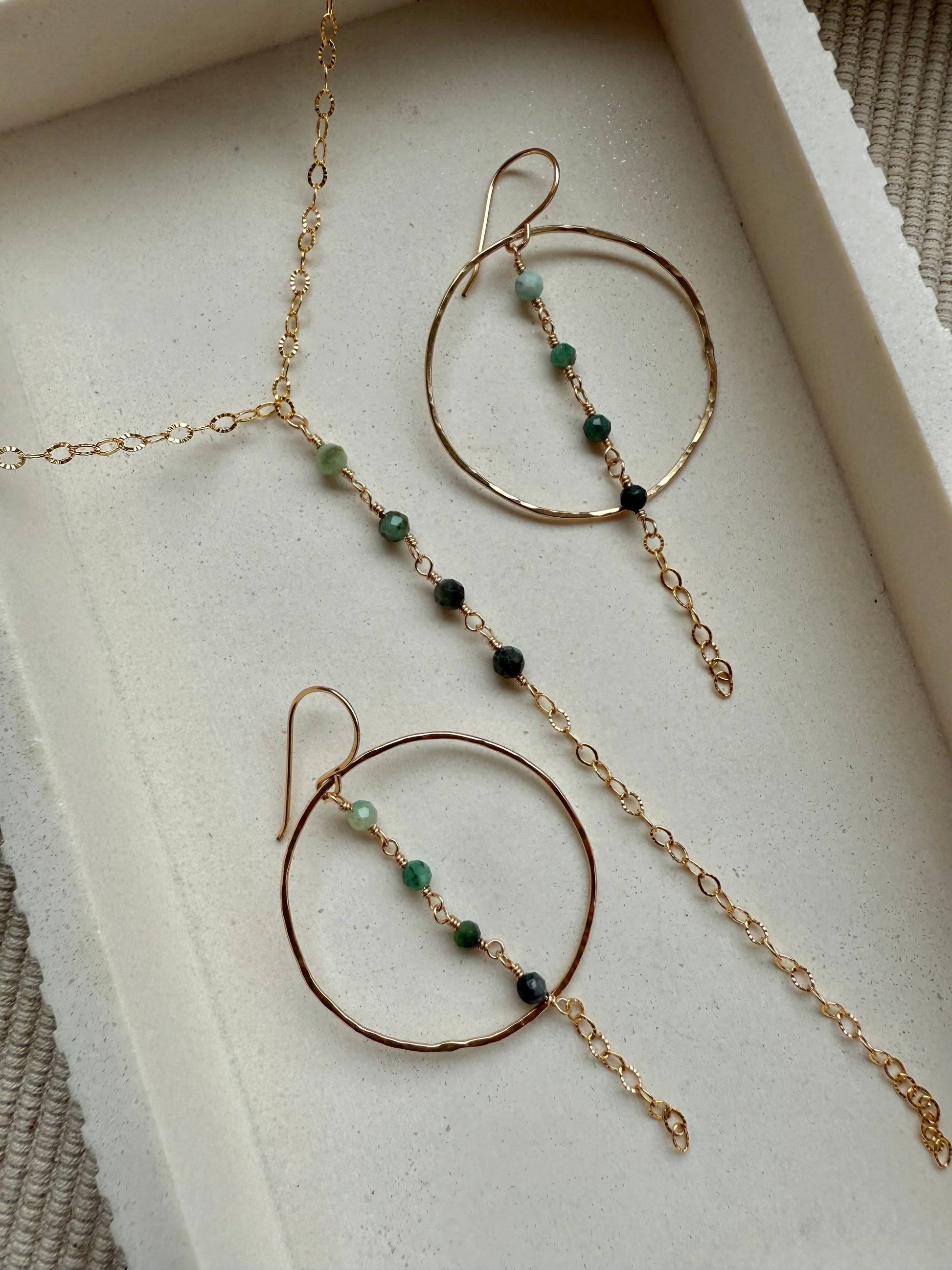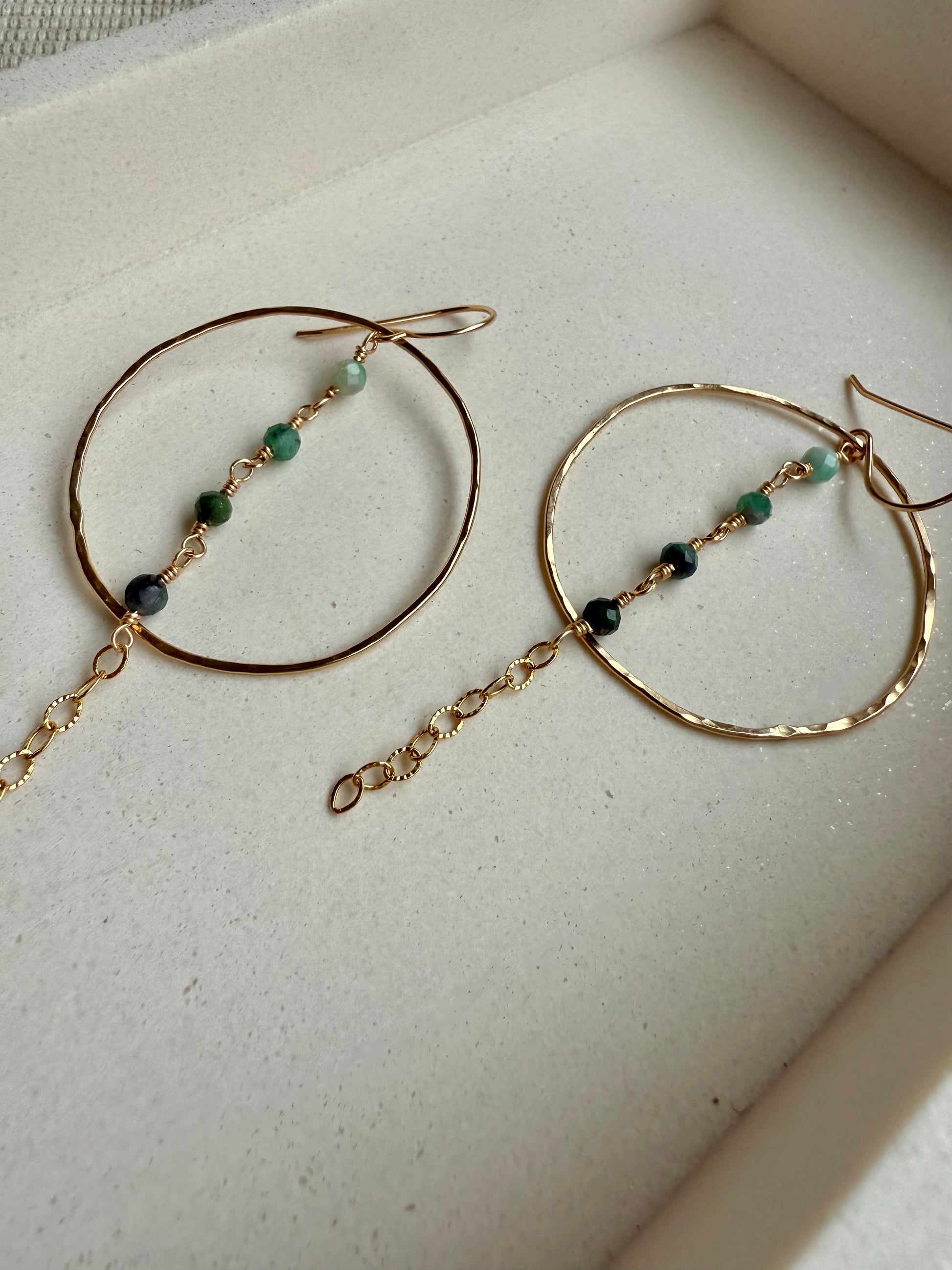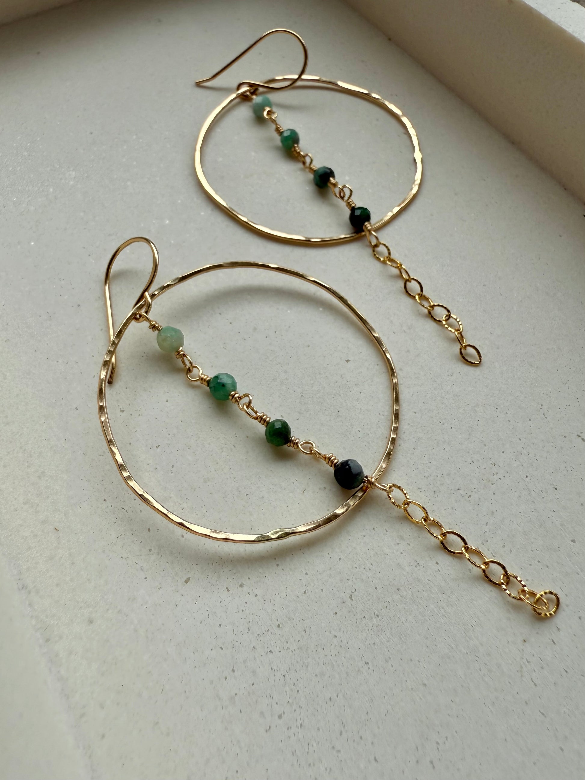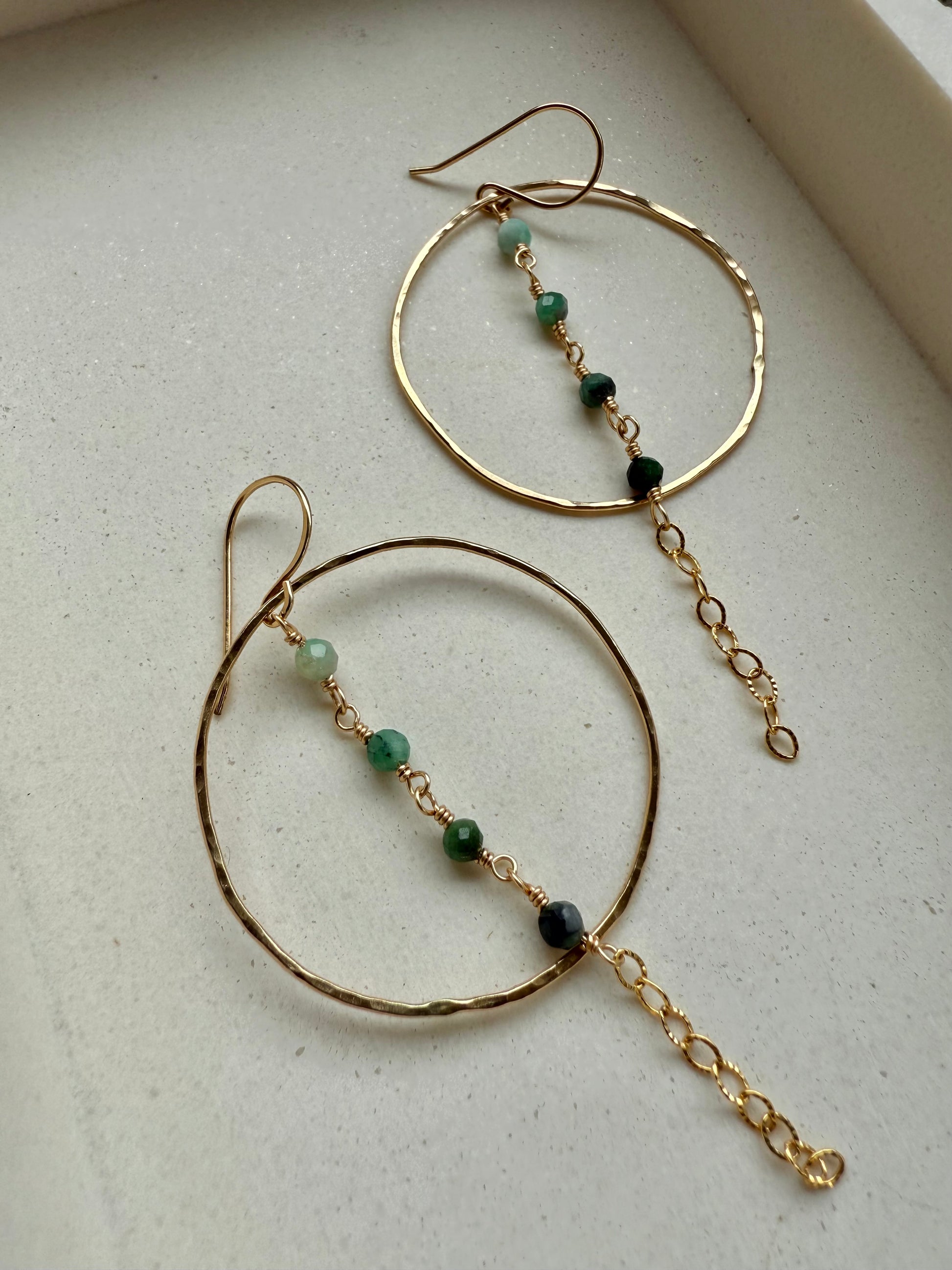 Delicate and bold all at once — these statement earrings feature four genuine, faceted emeralds in a soft ombré gradient. Each stone is wire-wrapped by hand and suspended inside an organically forged and hammered gold hoop. Finished with our light-catching Lorde chain for movement and glow.
