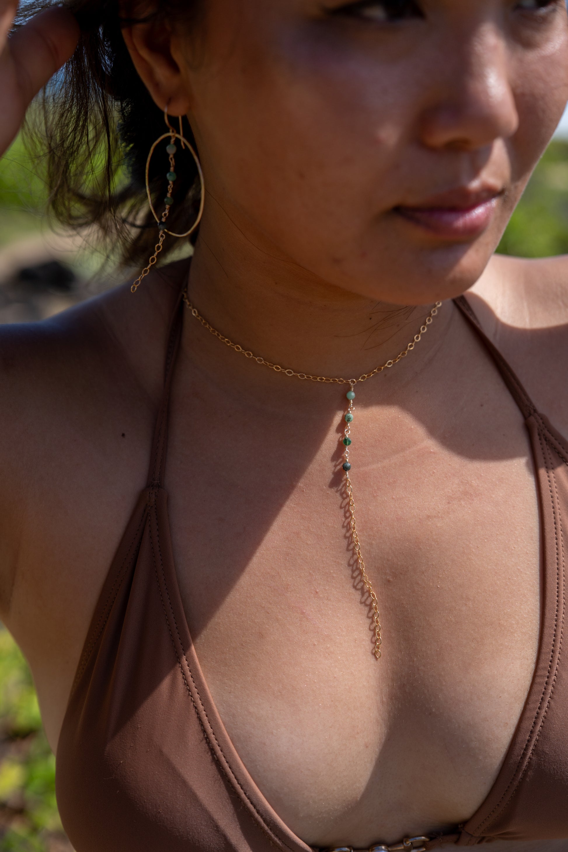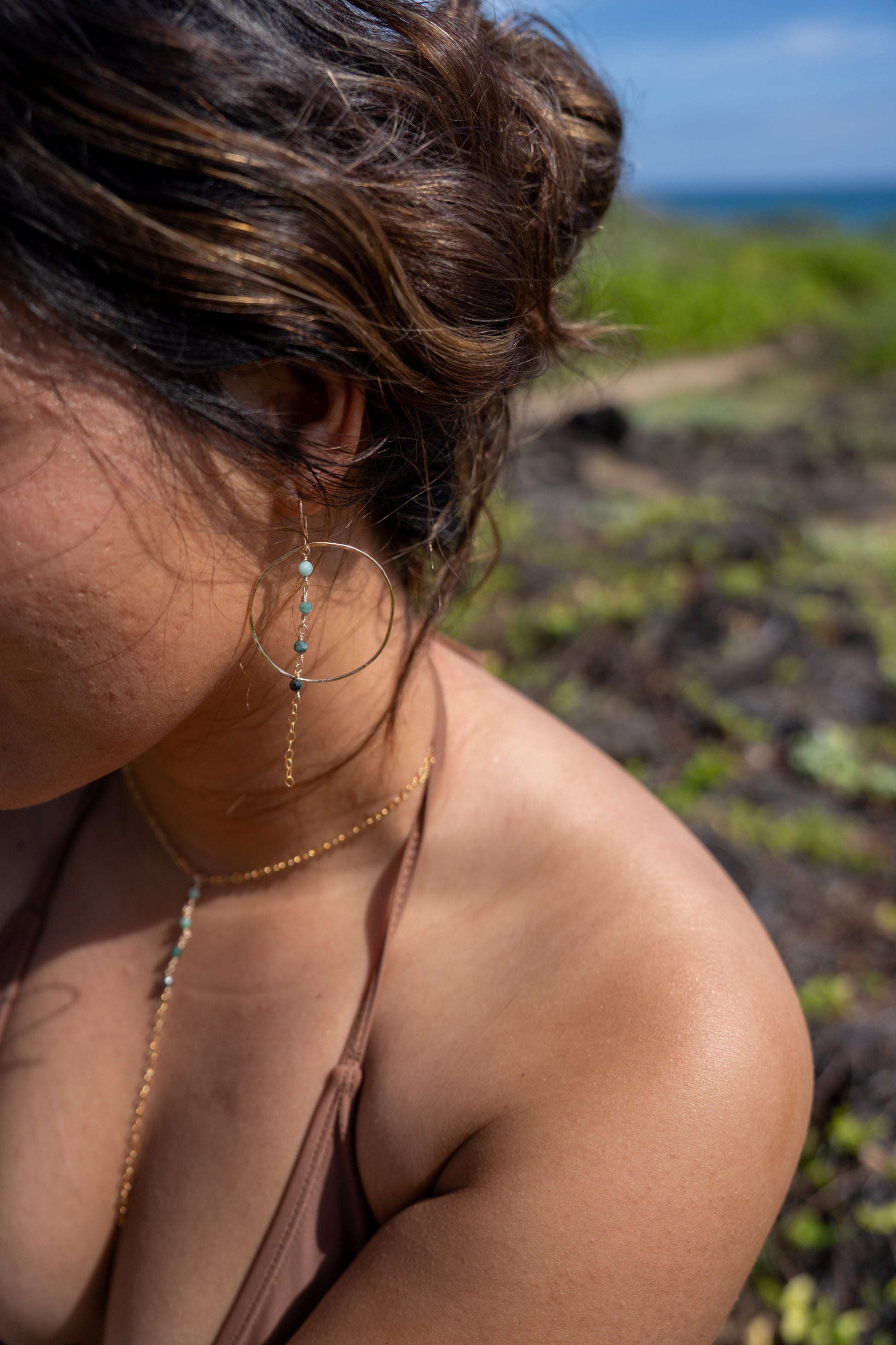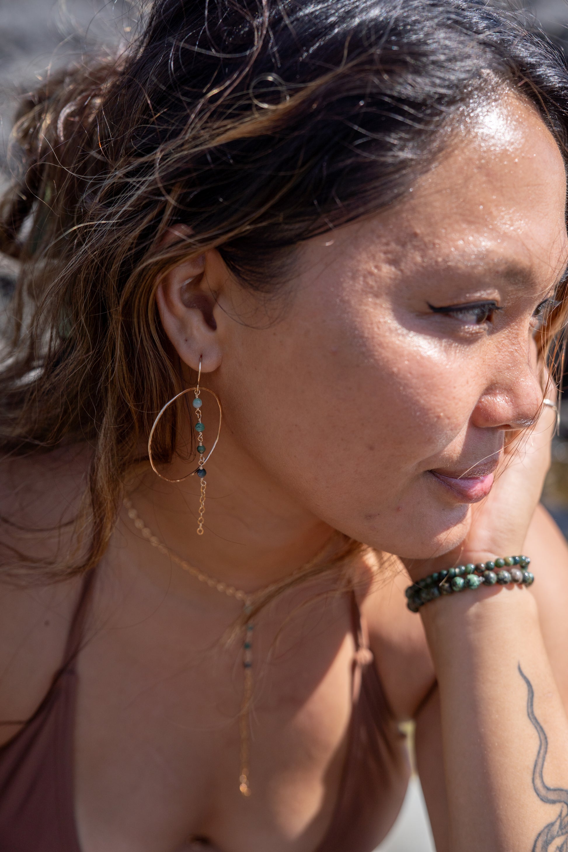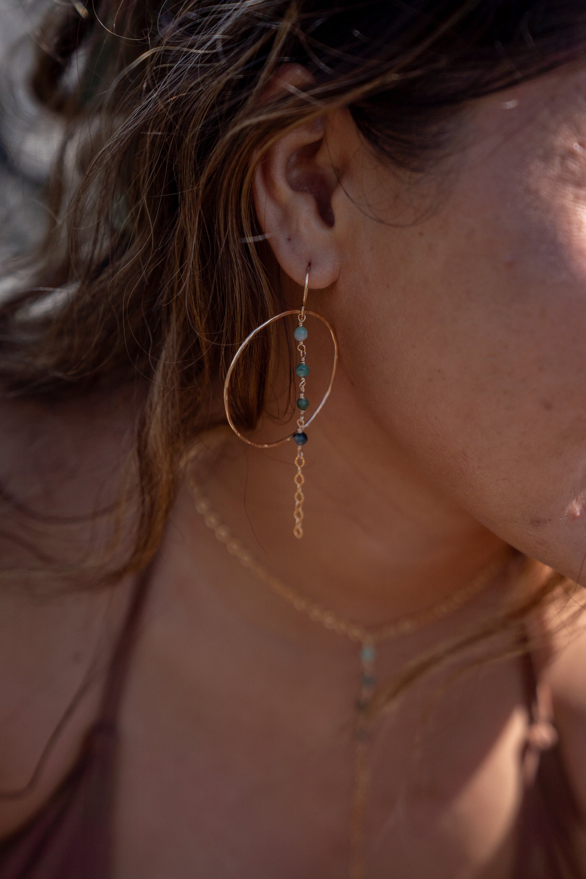 Delicate and bold all at once — these statement earrings feature four genuine, faceted emeralds in a soft ombré gradient. Each stone is wire-wrapped by hand and suspended inside an organically forged and hammered gold hoop. Finished with our light-catching Lorde chain for movement and glow.