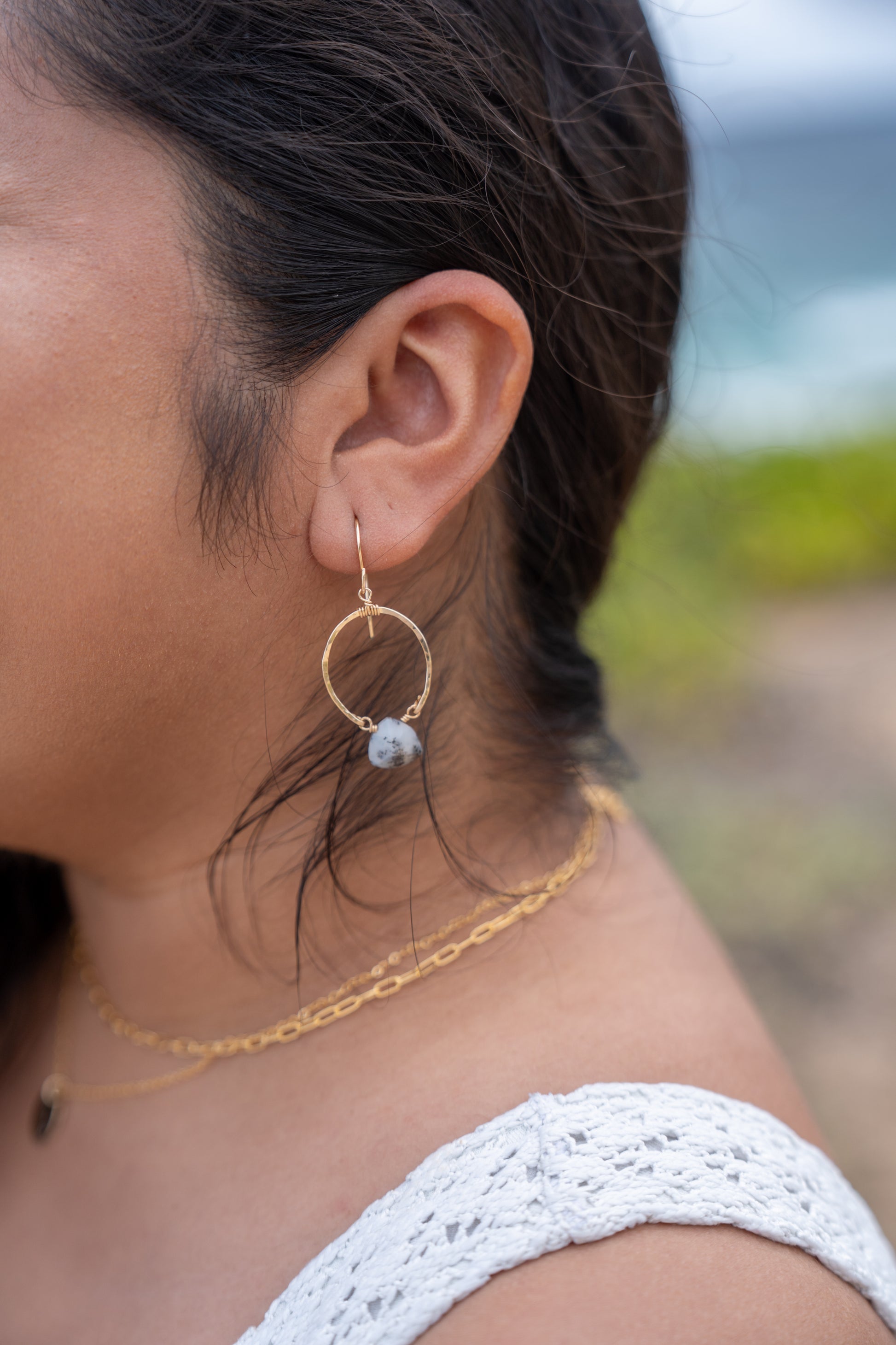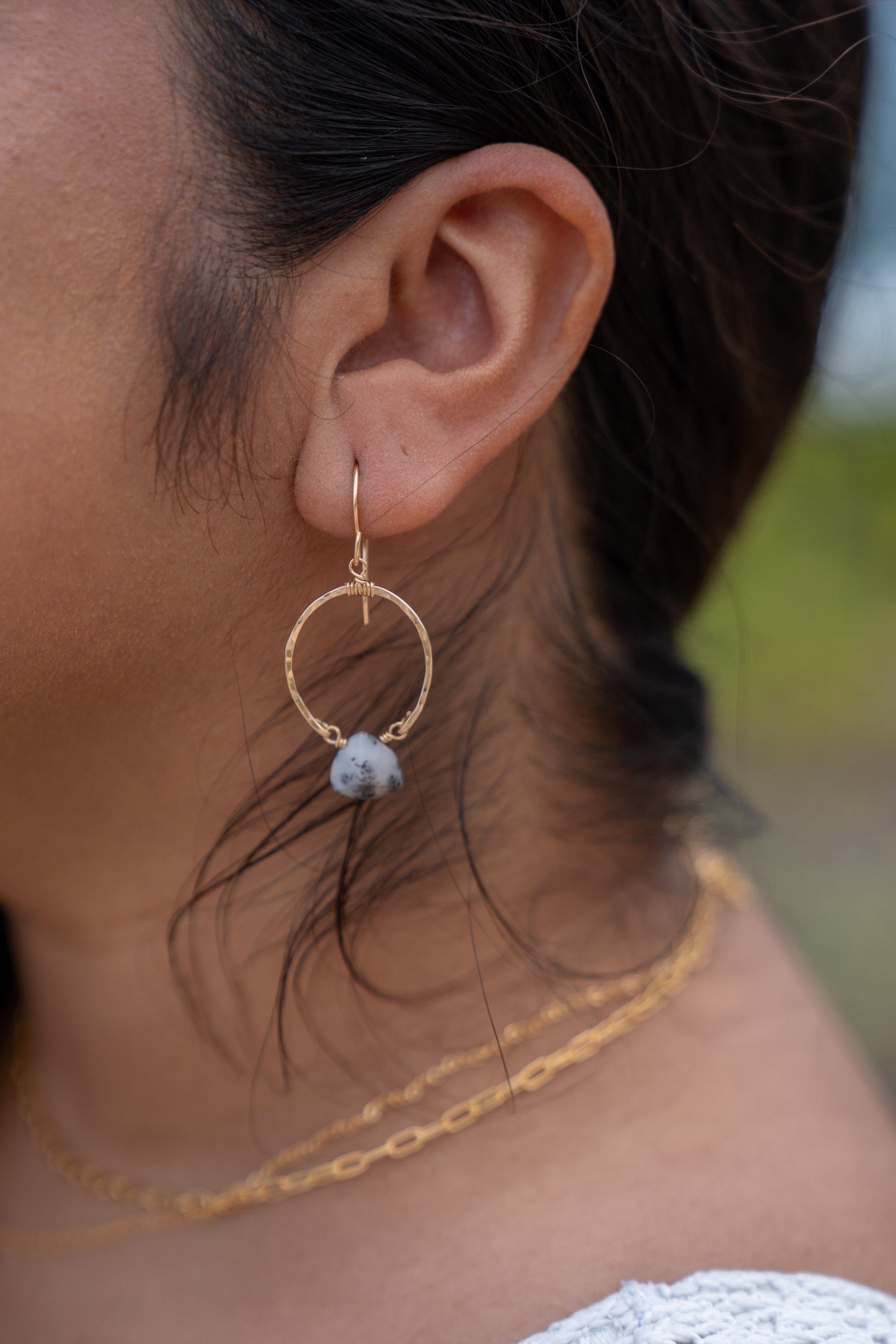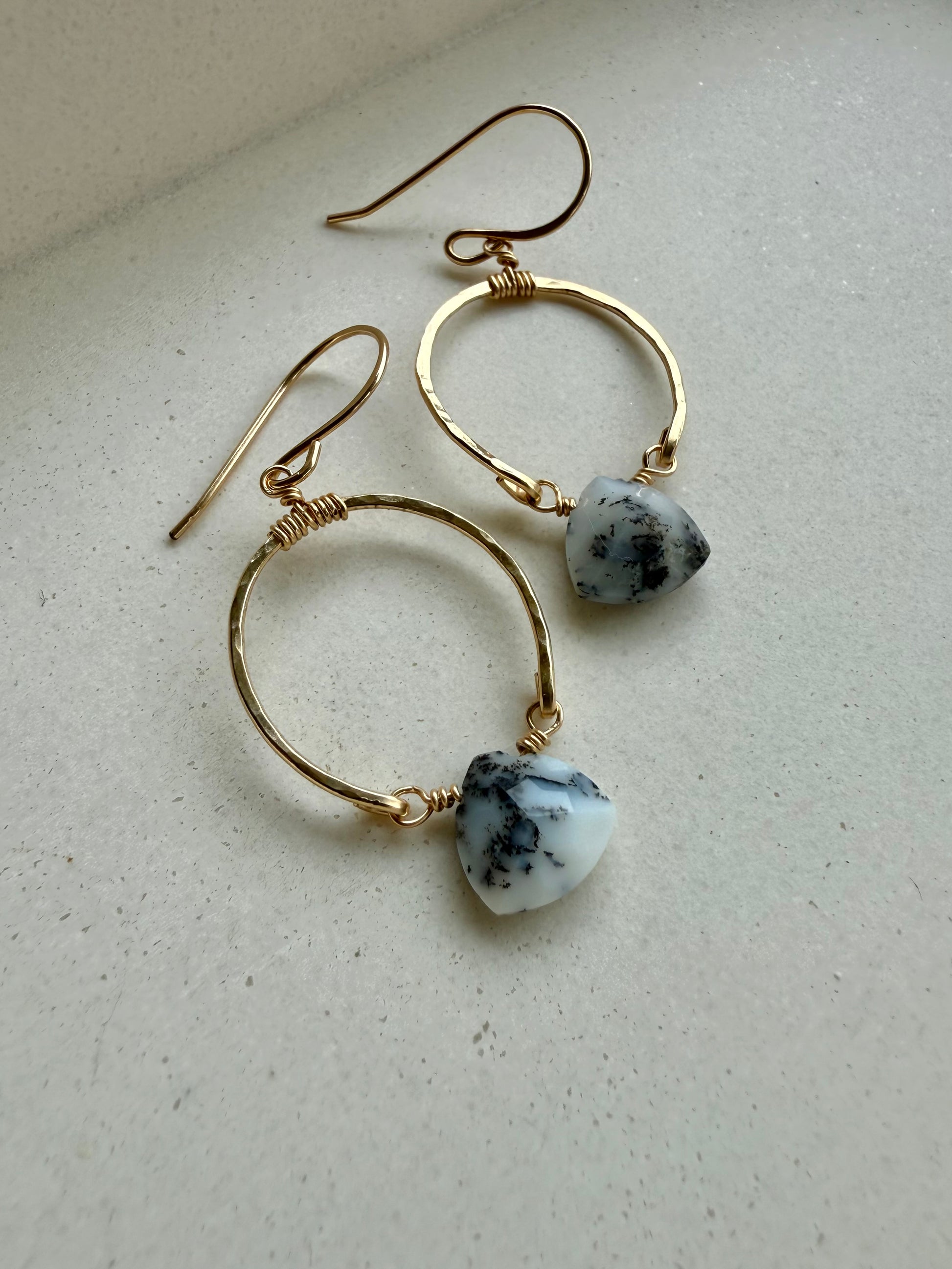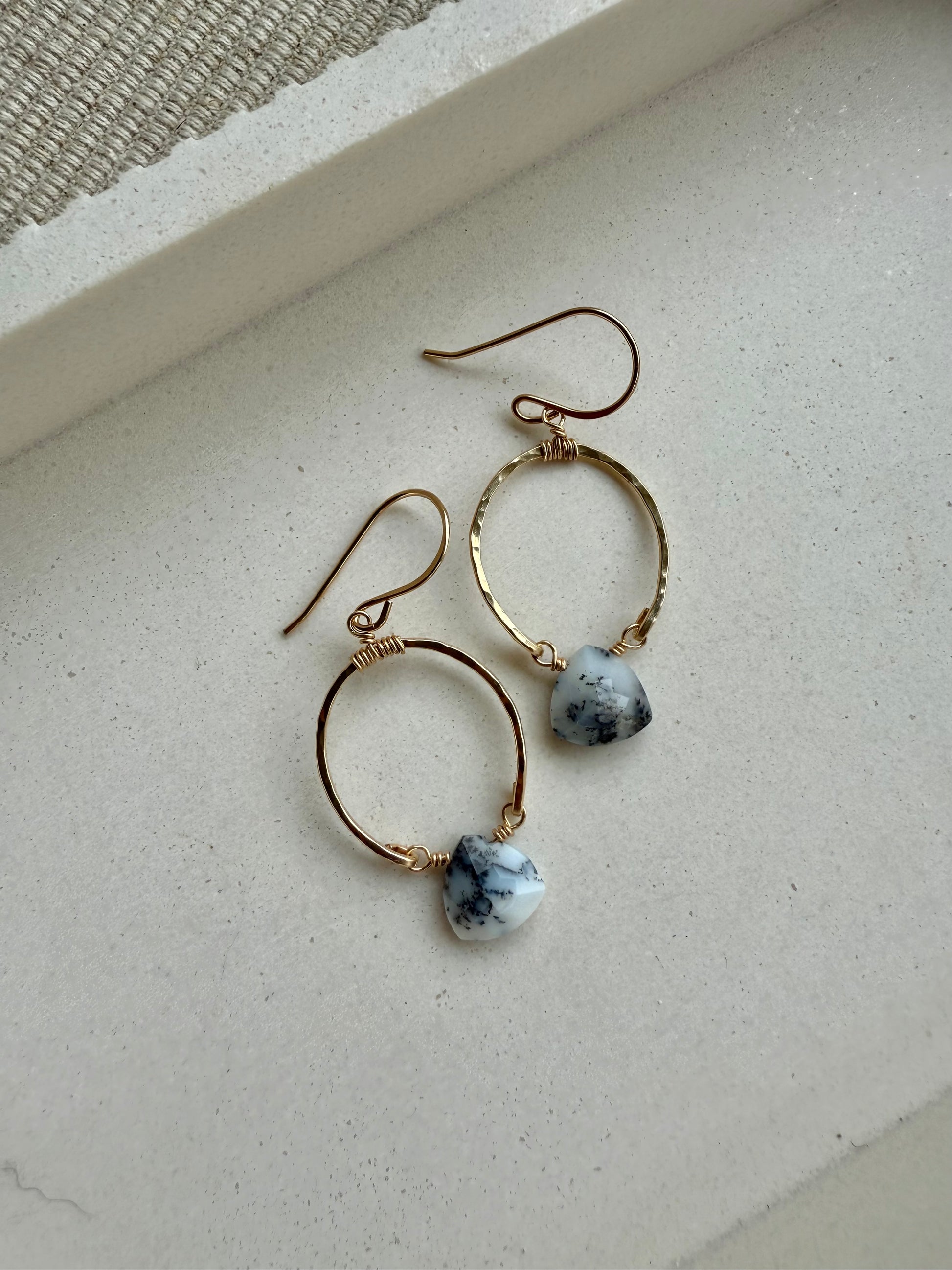 Earthy, grounding, and full of natural beauty—these hand-forged hoops feature polished dendritic opal stones, each one uniquely patterned with dark, branch-like inclusions. Suspended from lightly hammered hoops, they’re subtle, lightweight, and effortlessly striking.