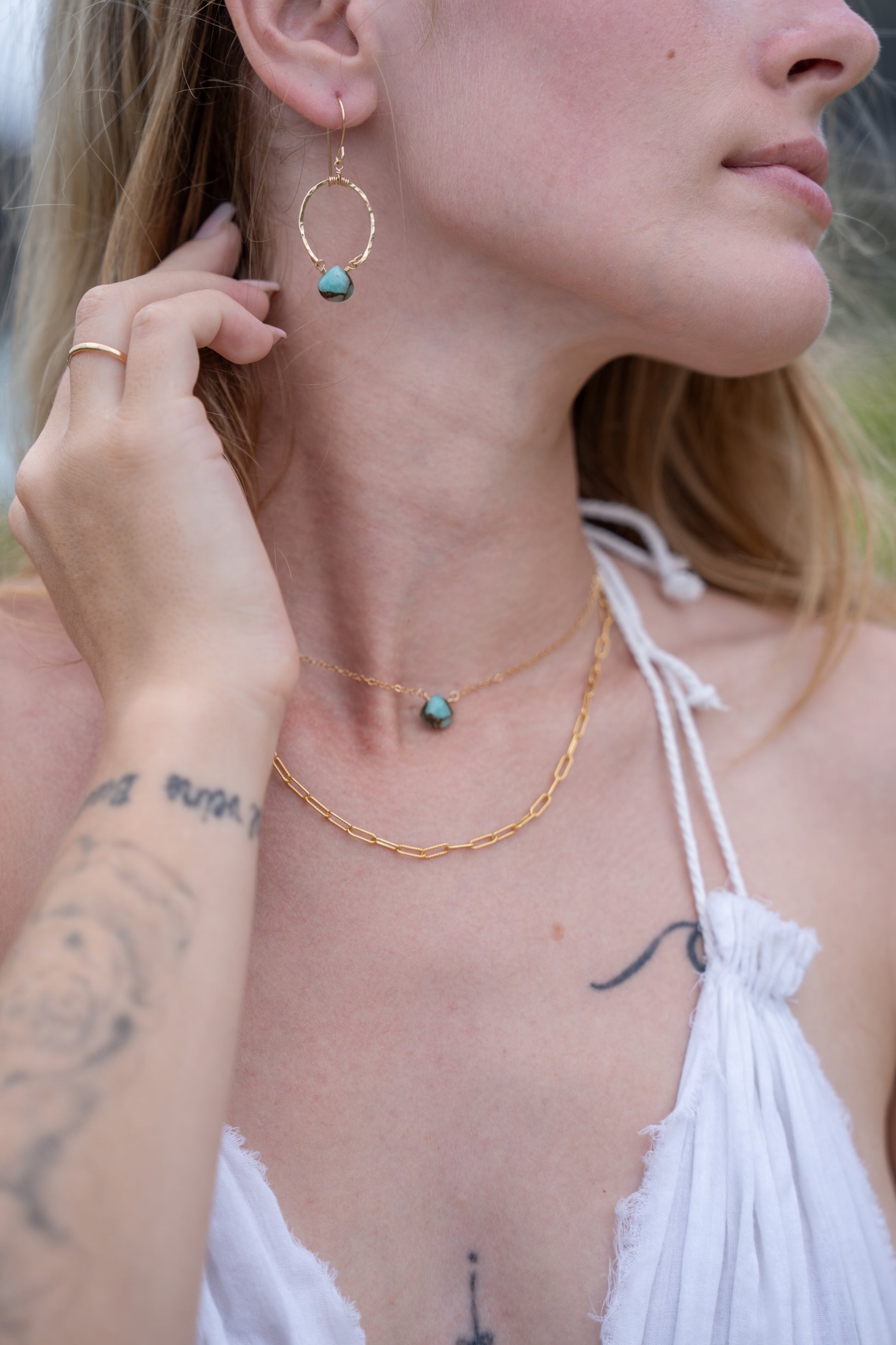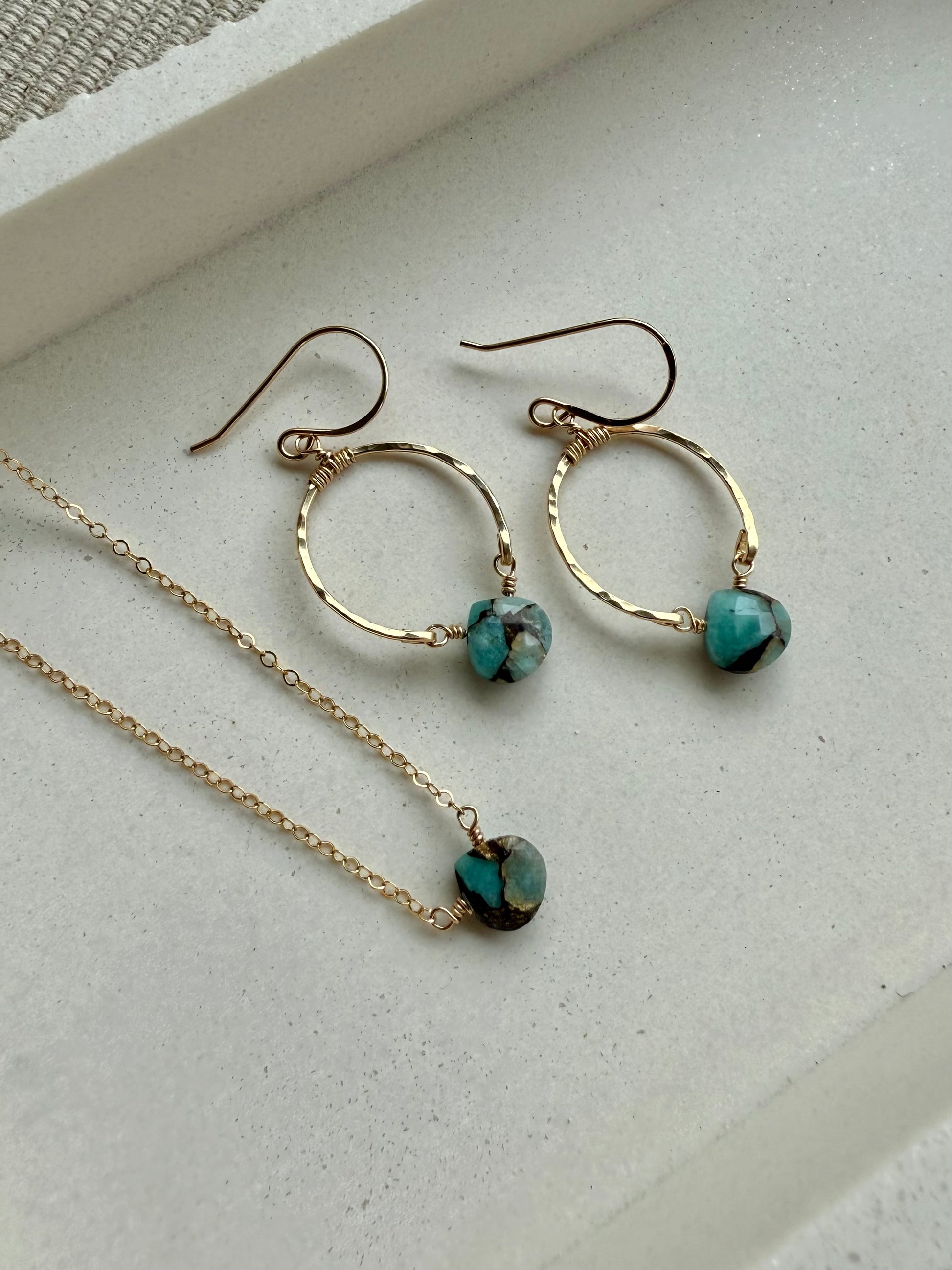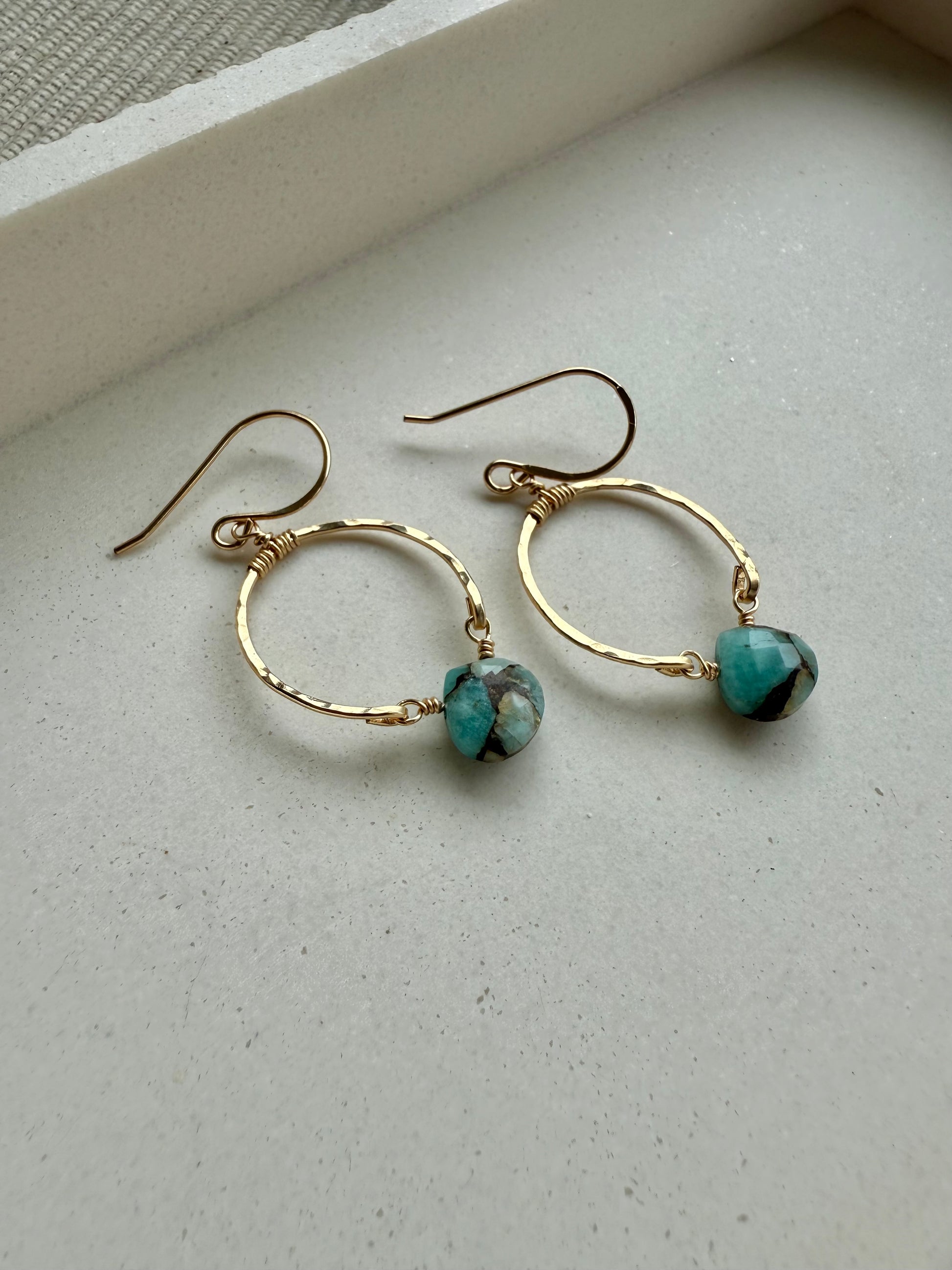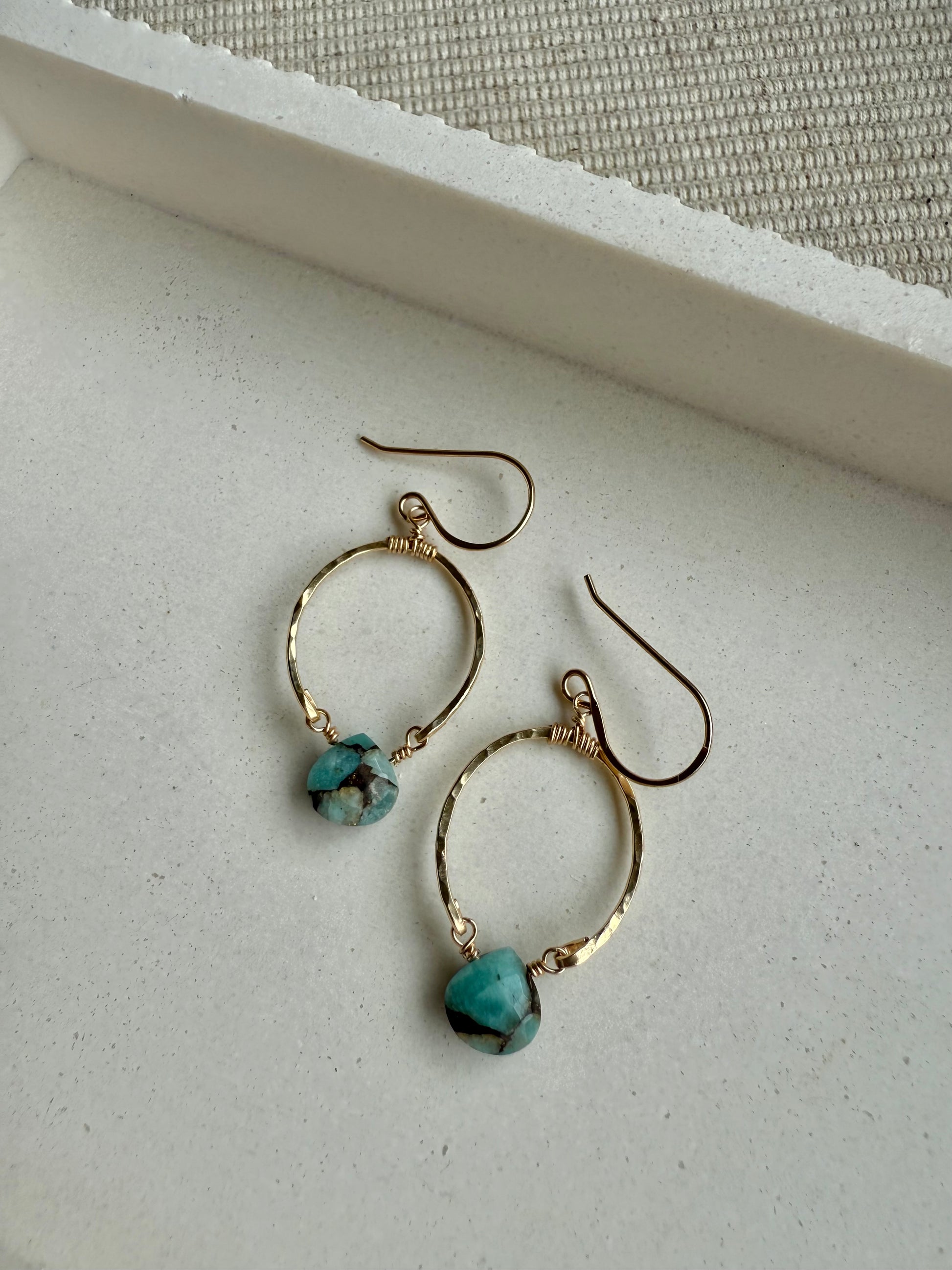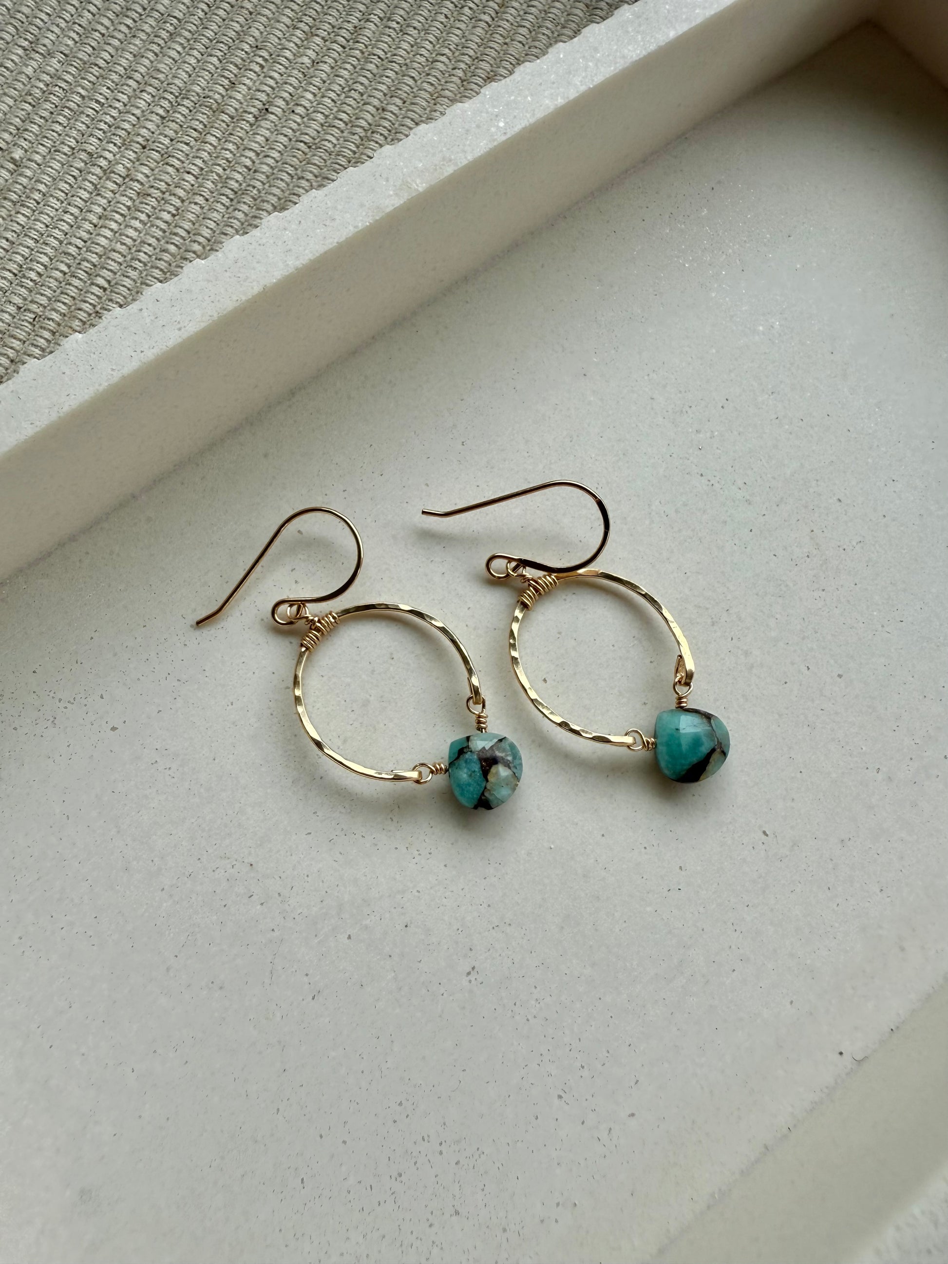 Earthy meets elegant in these hand-forged mini hoops featuring striking copper turquoise gemstones. Each stone has its own natural pattern of vivid blue and rich coppery matrix, wire-wrapped onto hammered gold-filled hoops for texture and shine.