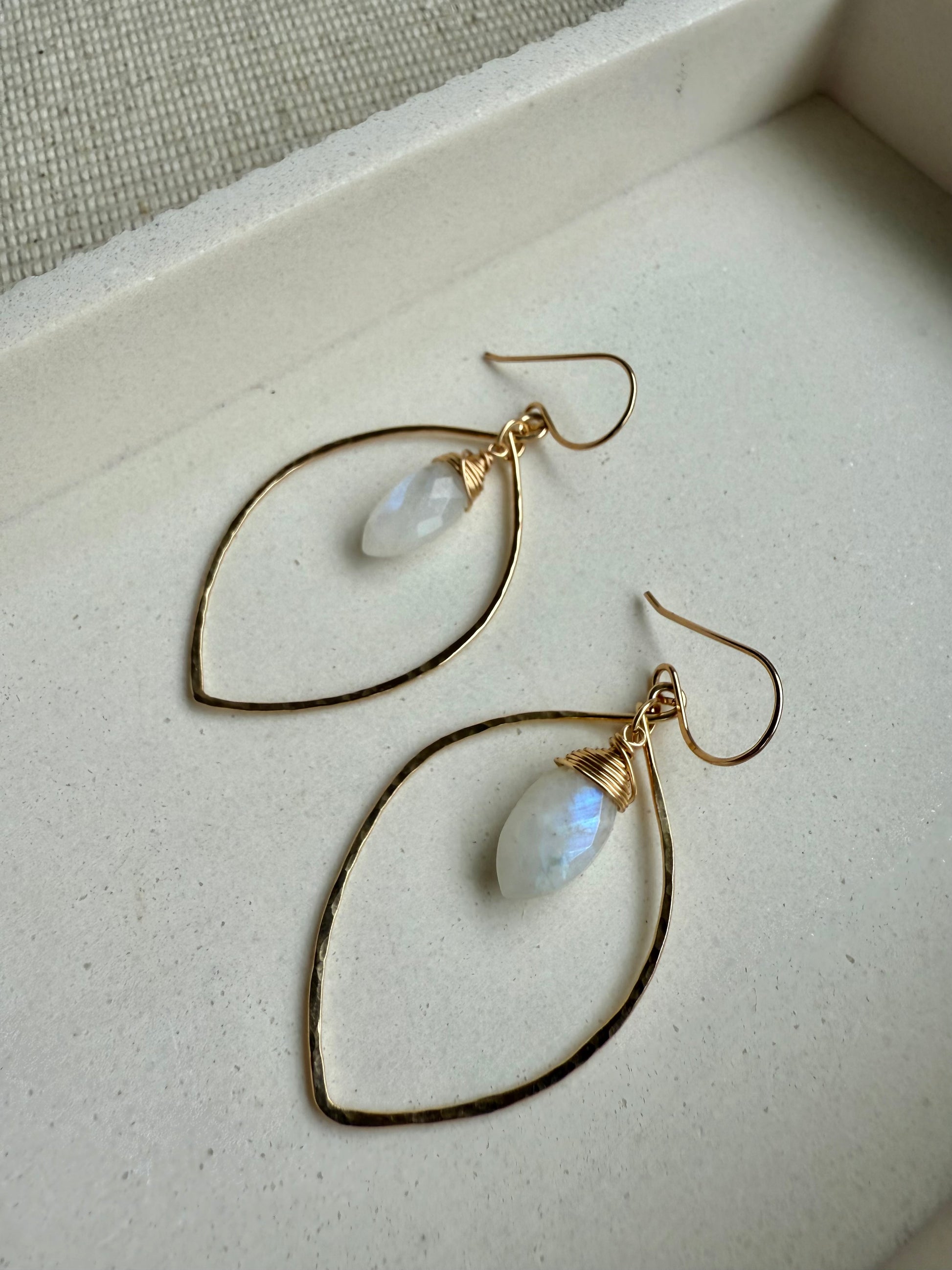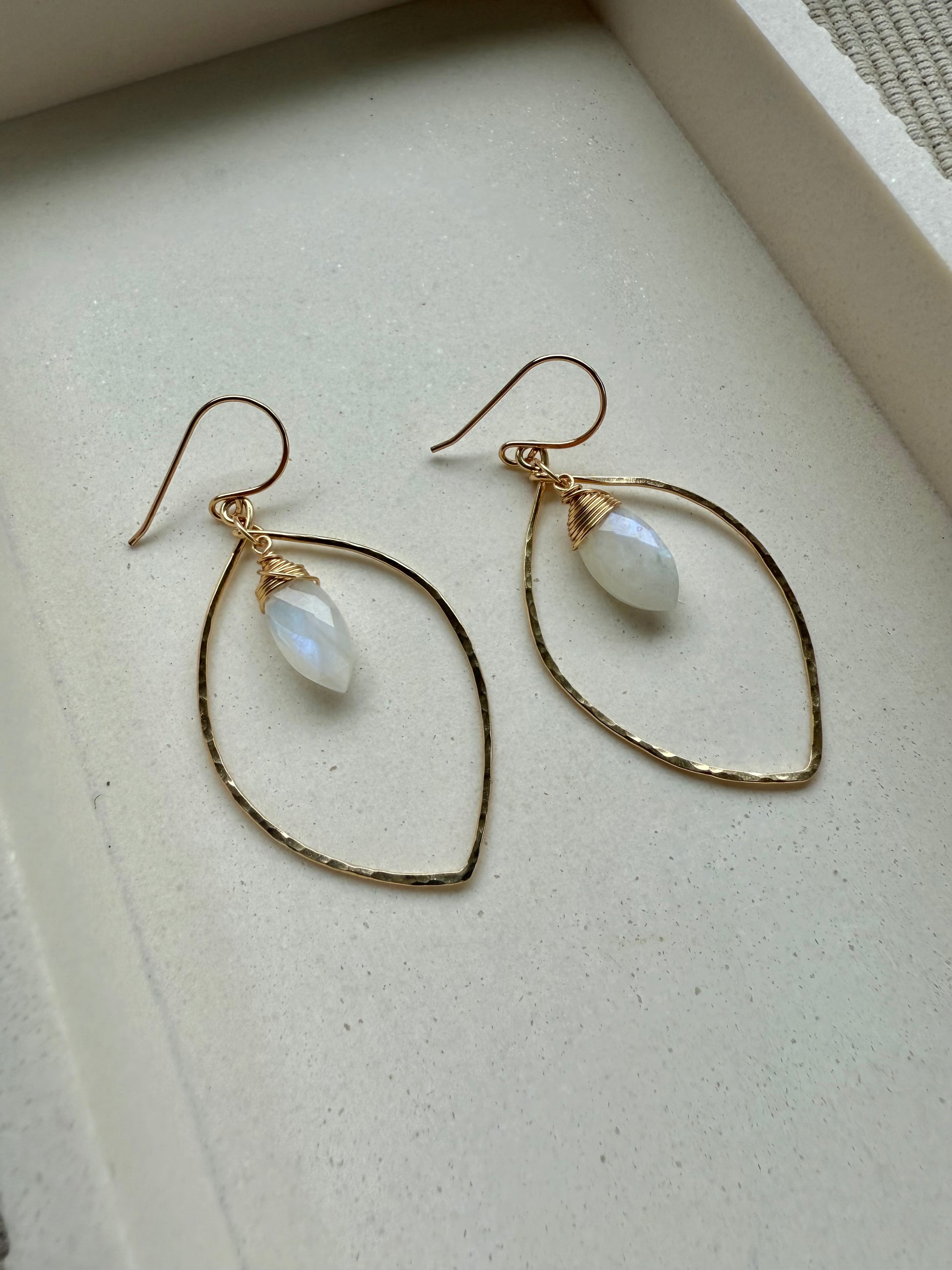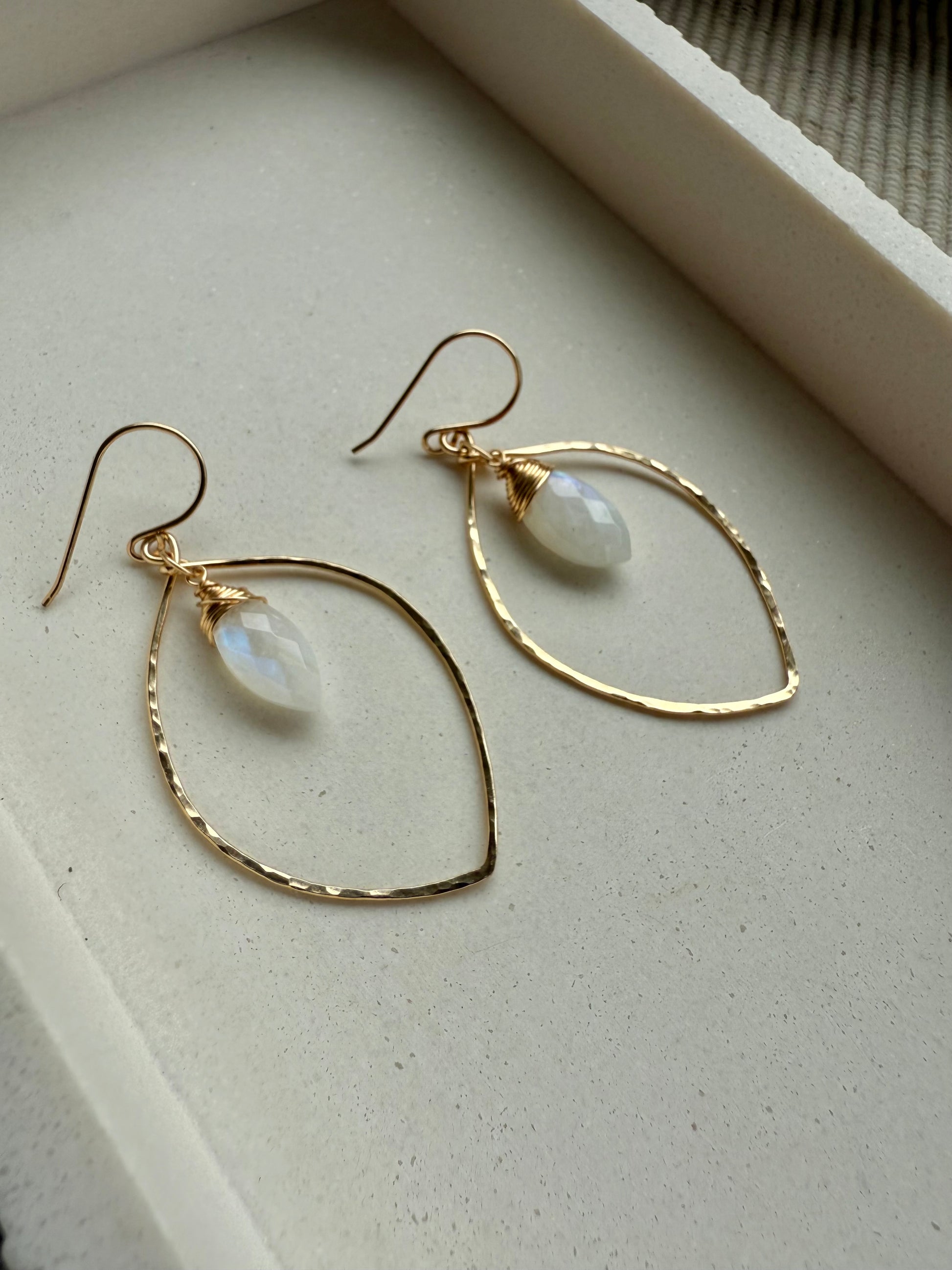 Graceful and luminous, these earrings feature faceted moonstone drops suspended inside hand-forged, petal-shaped hoops. Each lightweight frame is hammered for subtle texture and shimmer, complementing the natural glow of moonstone with every movement.