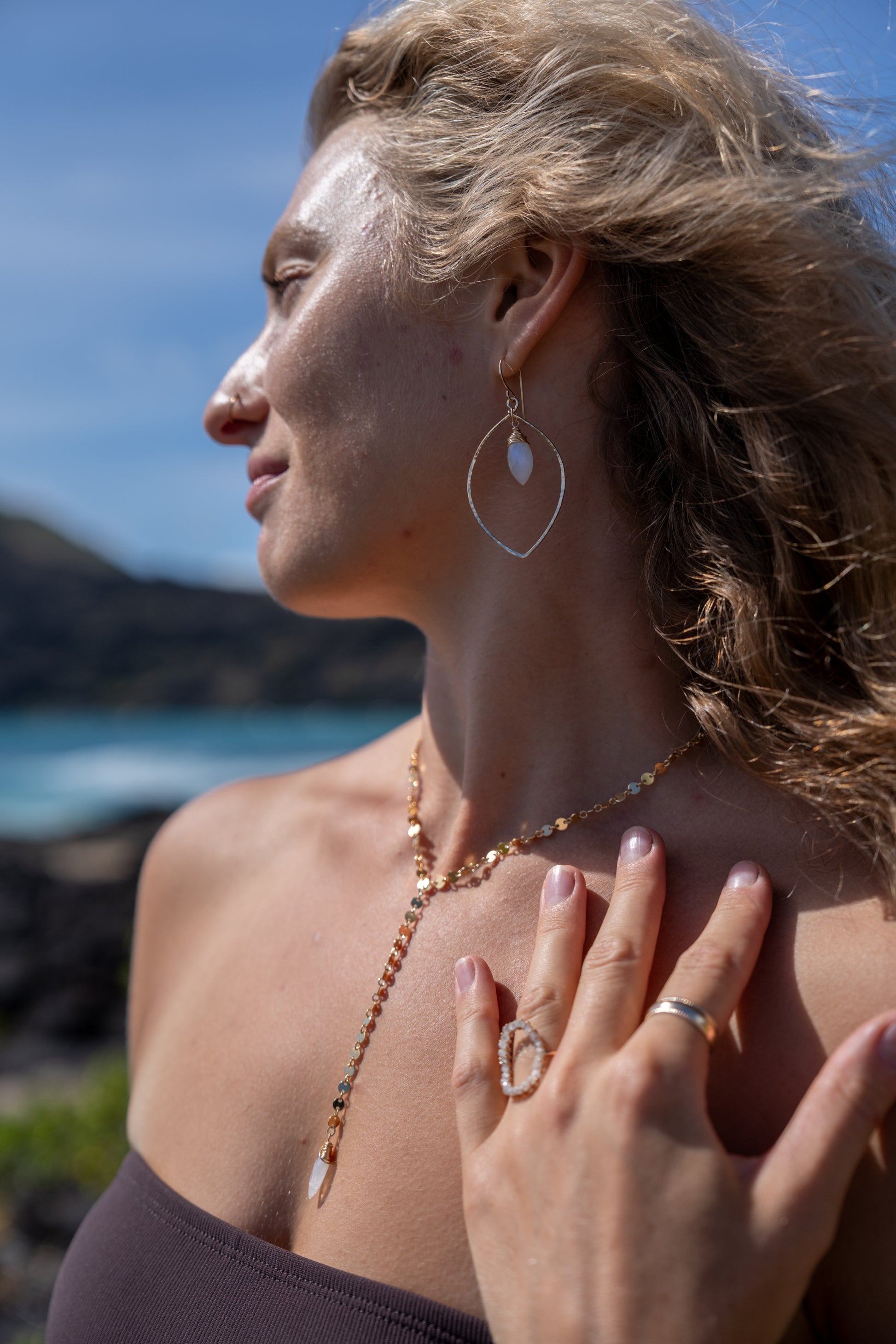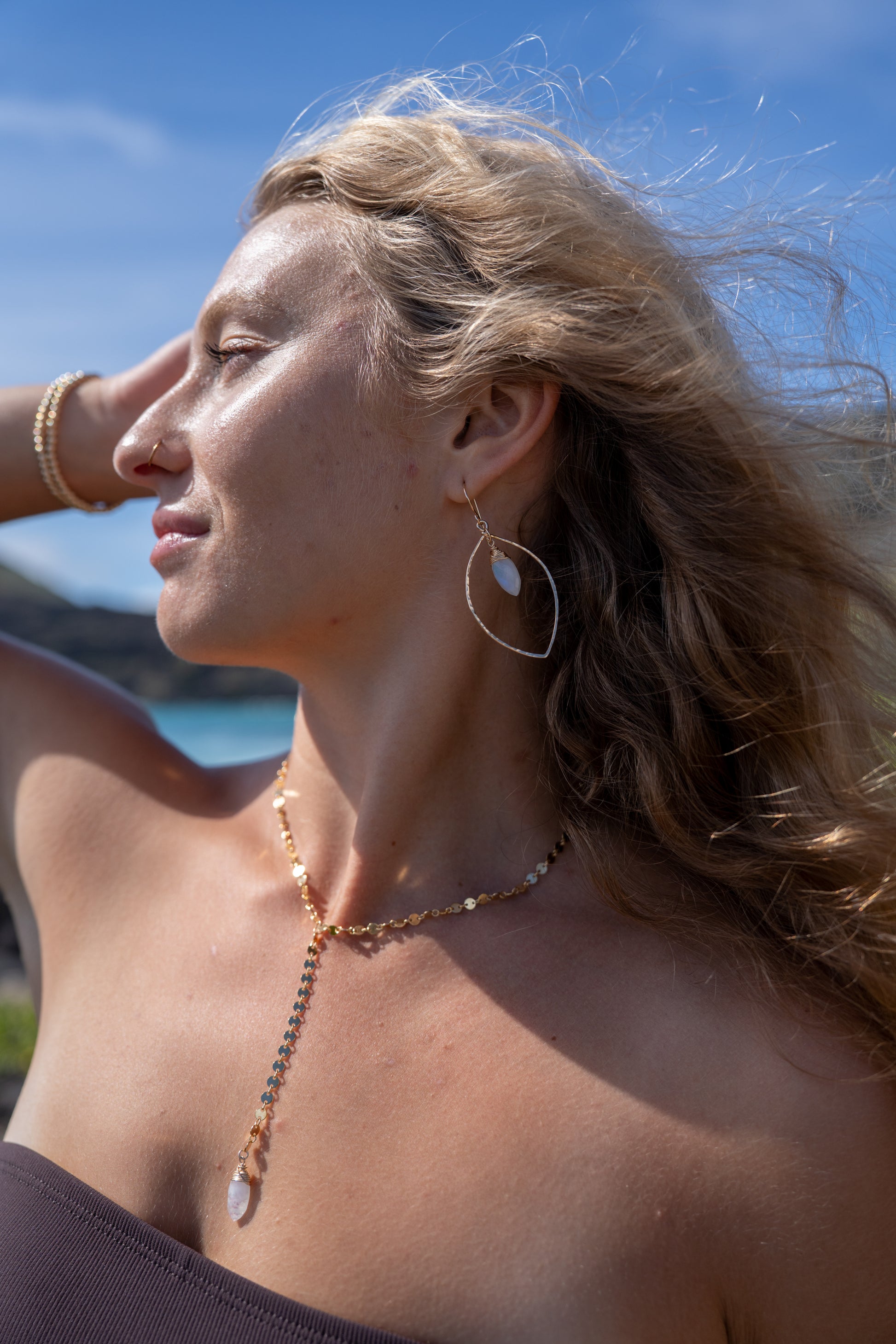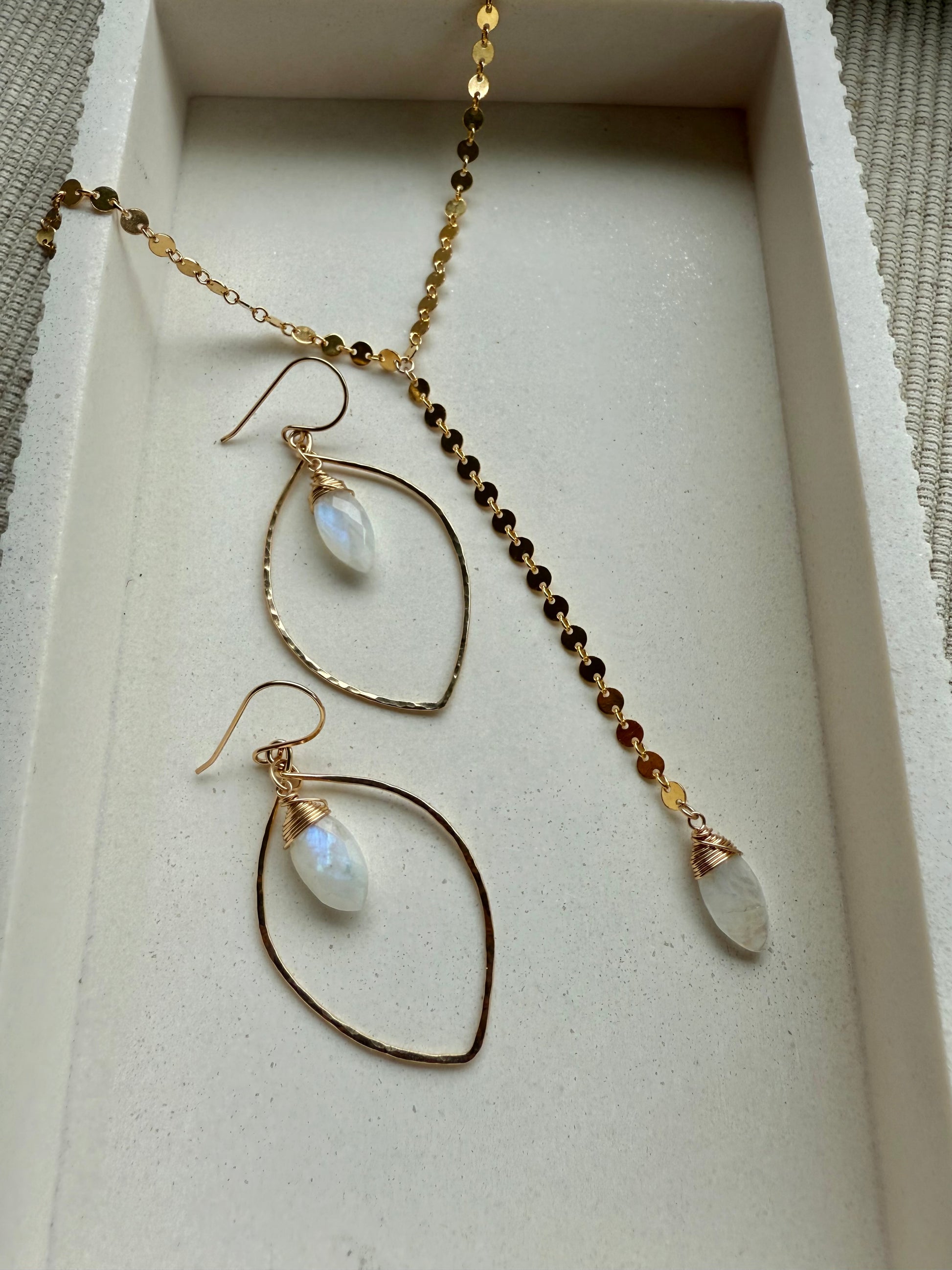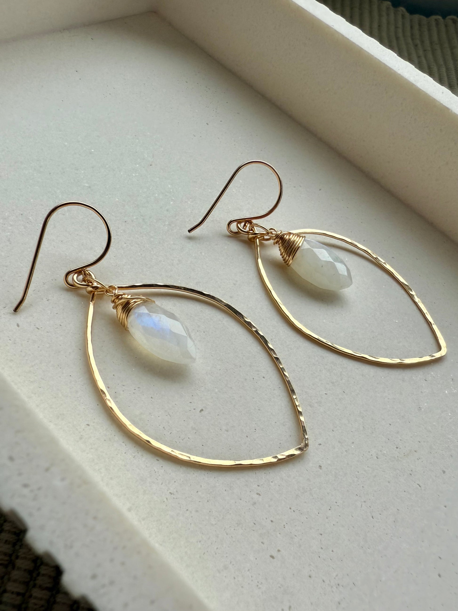 Graceful and luminous, these earrings feature faceted moonstone drops suspended inside hand-forged, petal-shaped hoops. Each lightweight frame is hammered for subtle texture and shimmer, complementing the natural glow of moonstone with every movement.