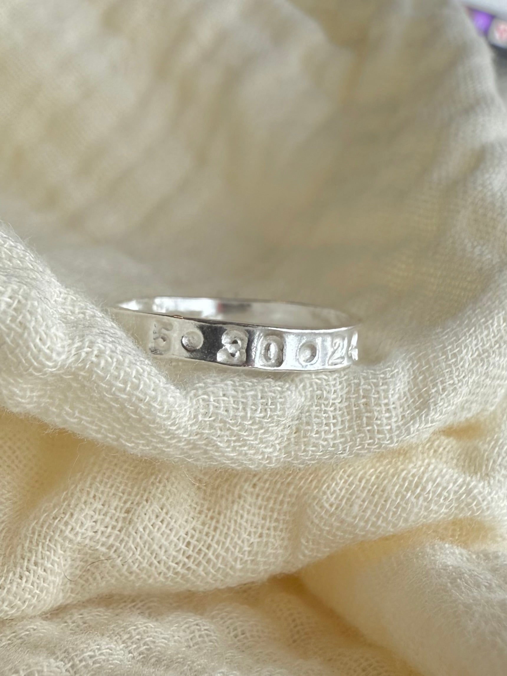 This flat band ring features a bold uppercase font, with each letter carefully hand stamped for a unique, artisan touch - no two rings will be exactly alike. Please note, due to the handmade process, you may notice a small seam where the ring is soldered, adding to its handcrafted character.
