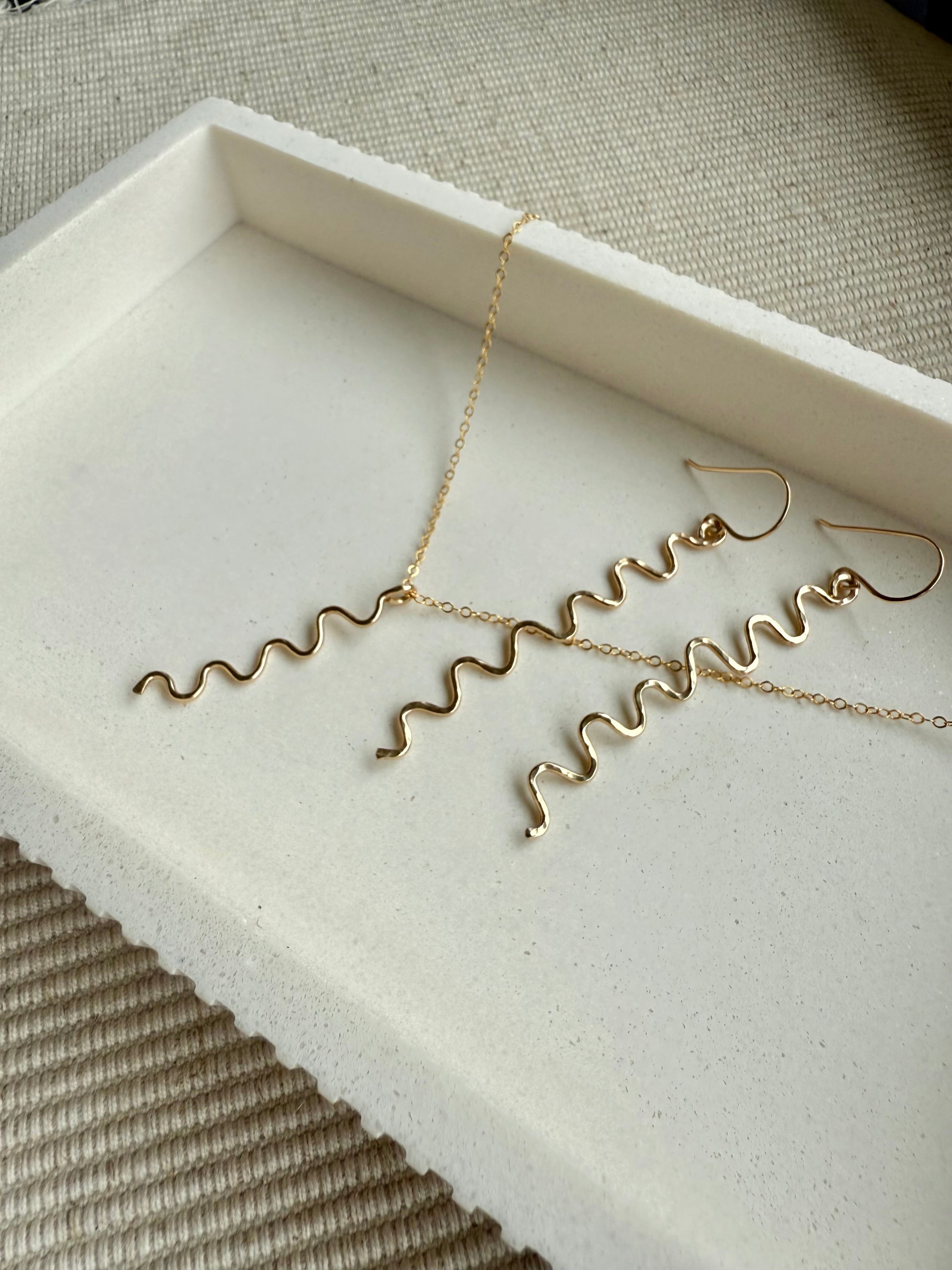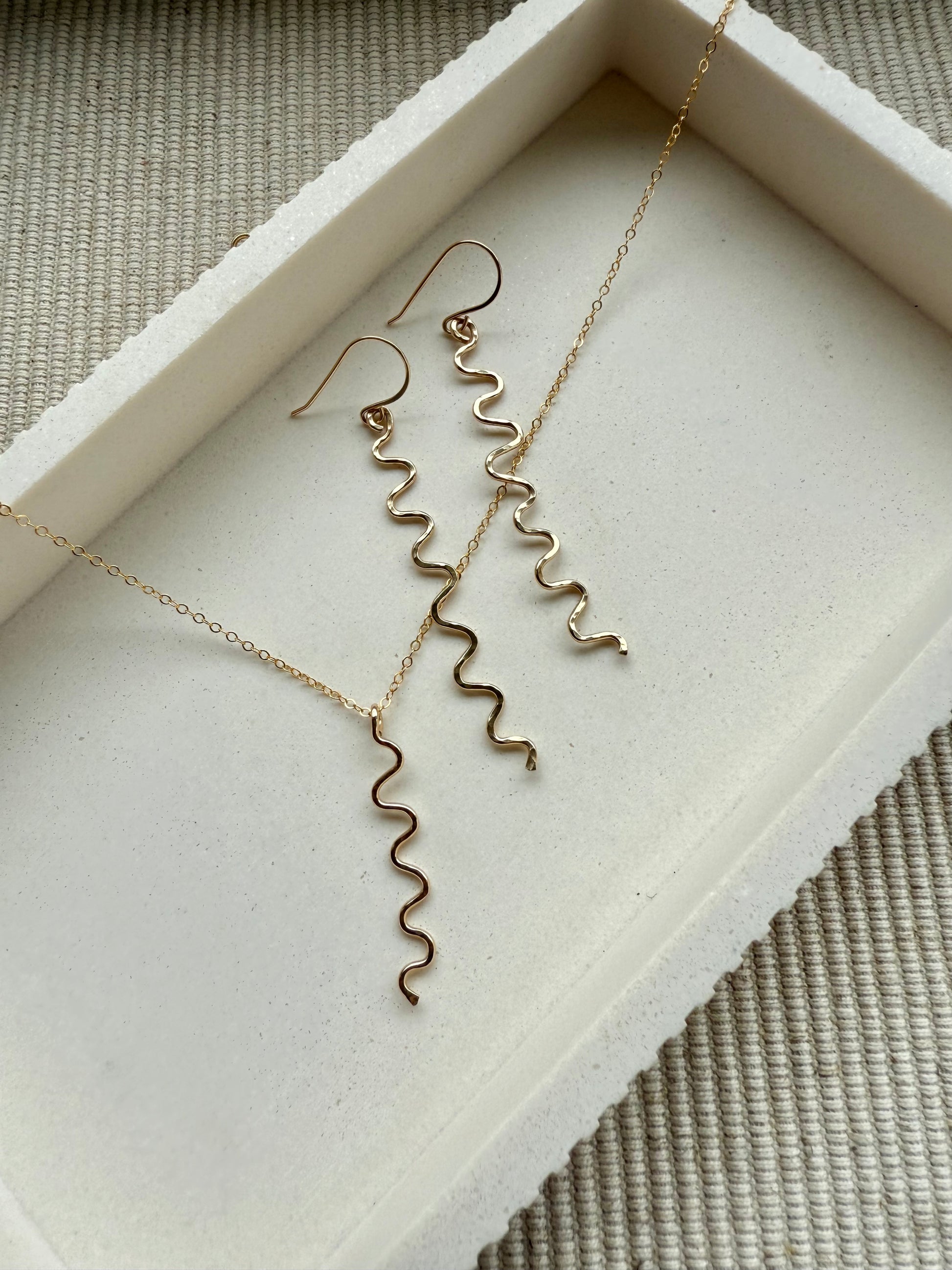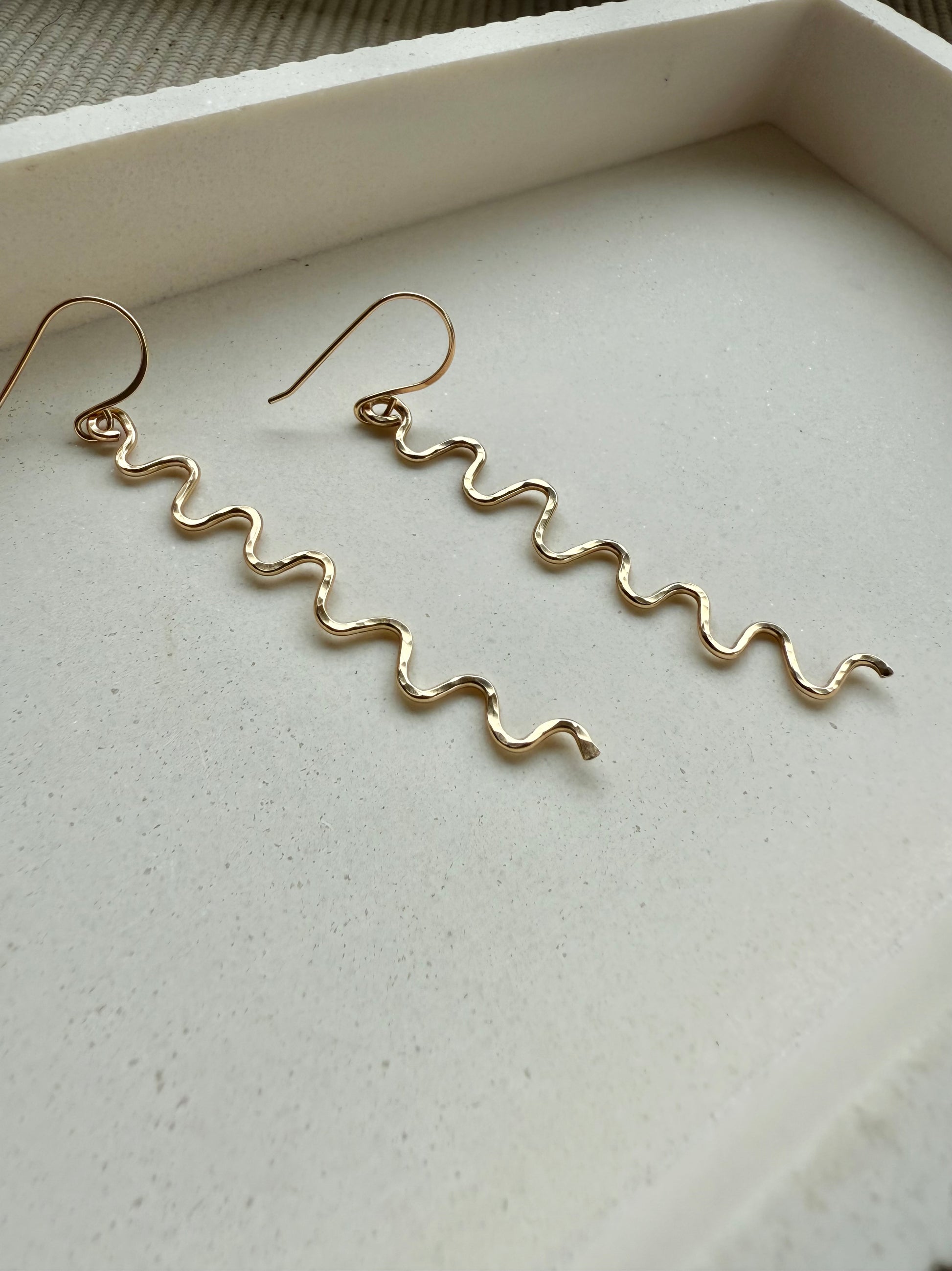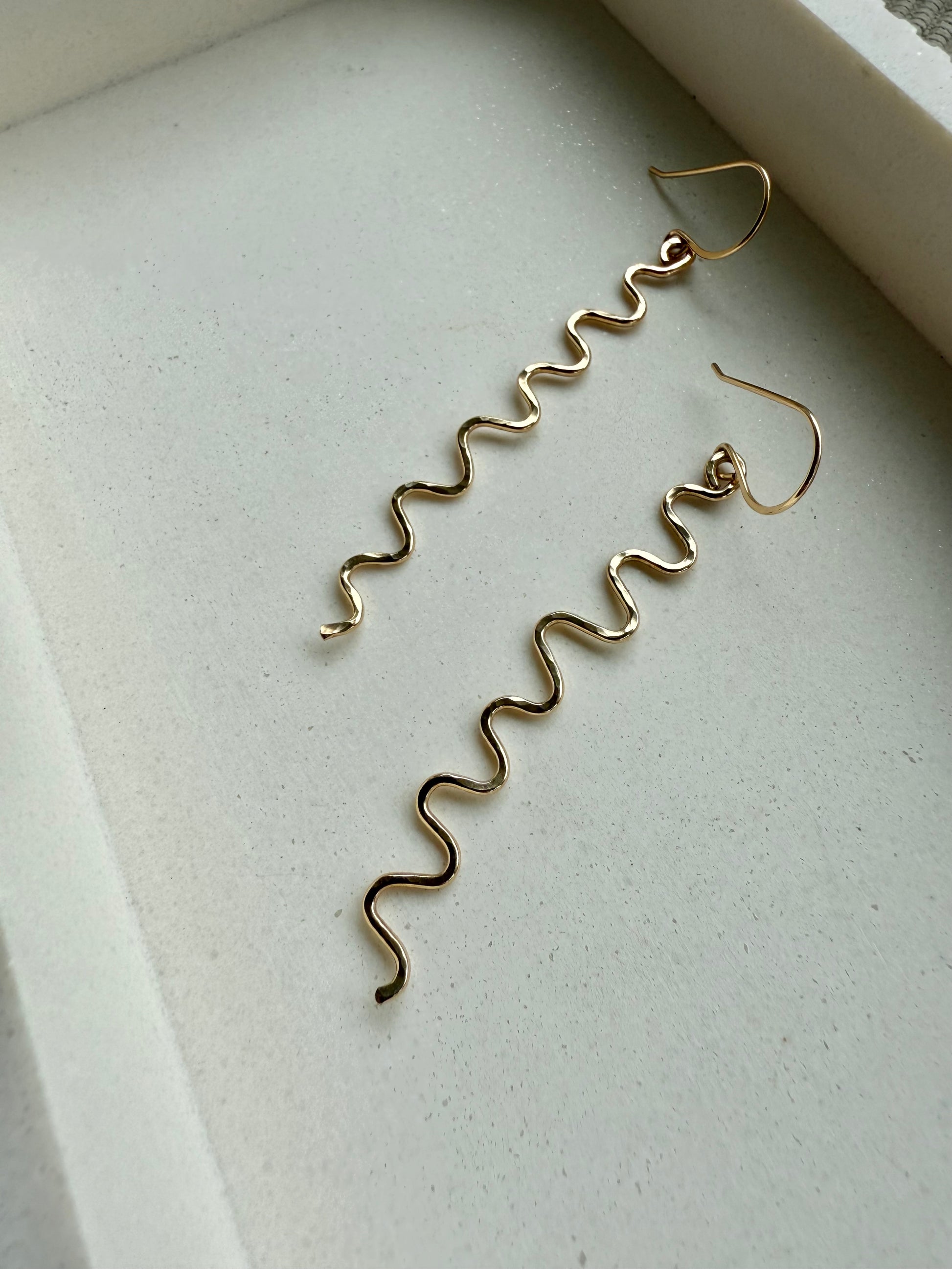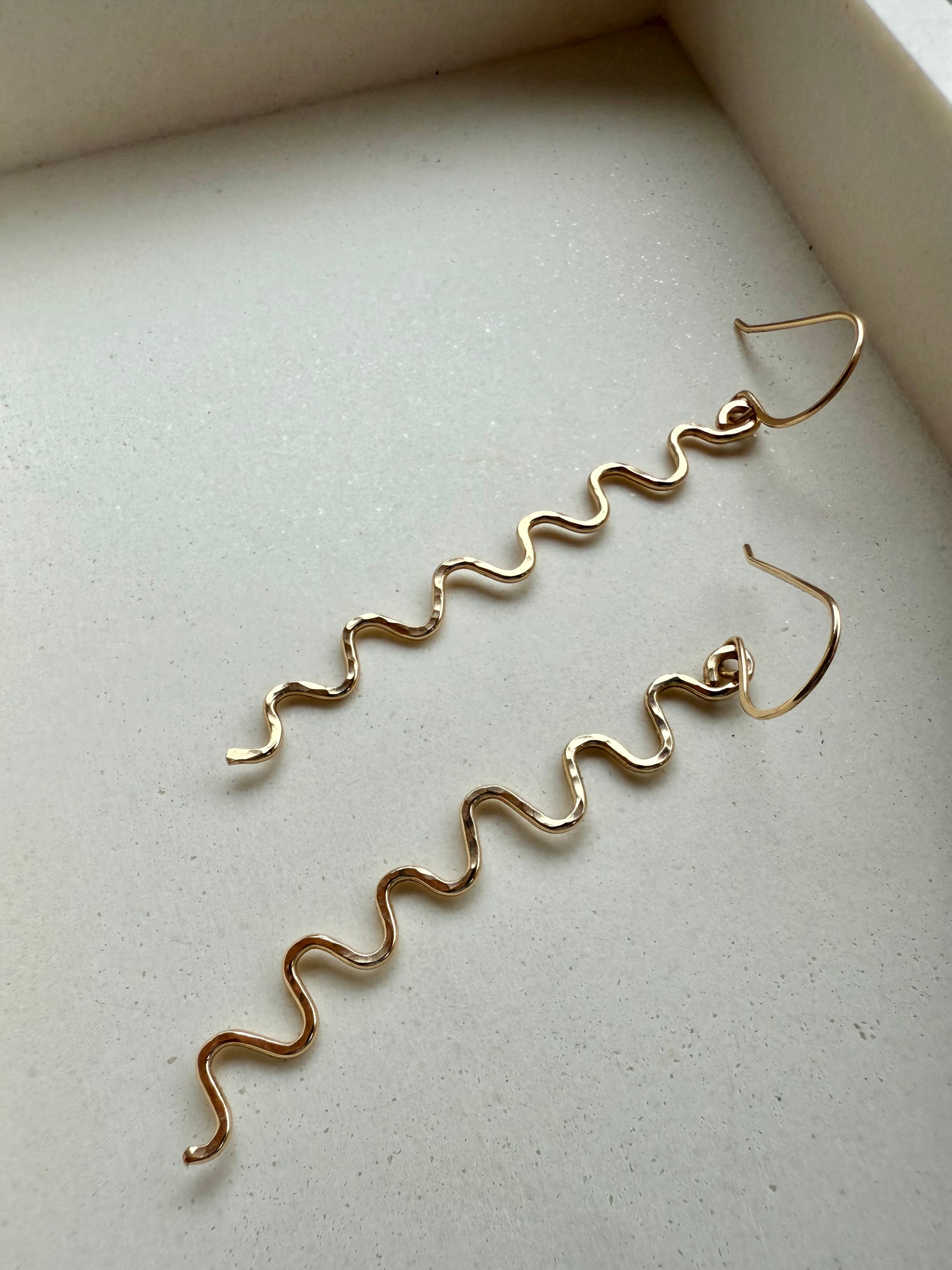 Bold, playful, and effortlessly modern—these handcrafted dangle earrings feature a sleek squiggle shape that catches the light with every move. Perfect for adding a little edge to your everyday.