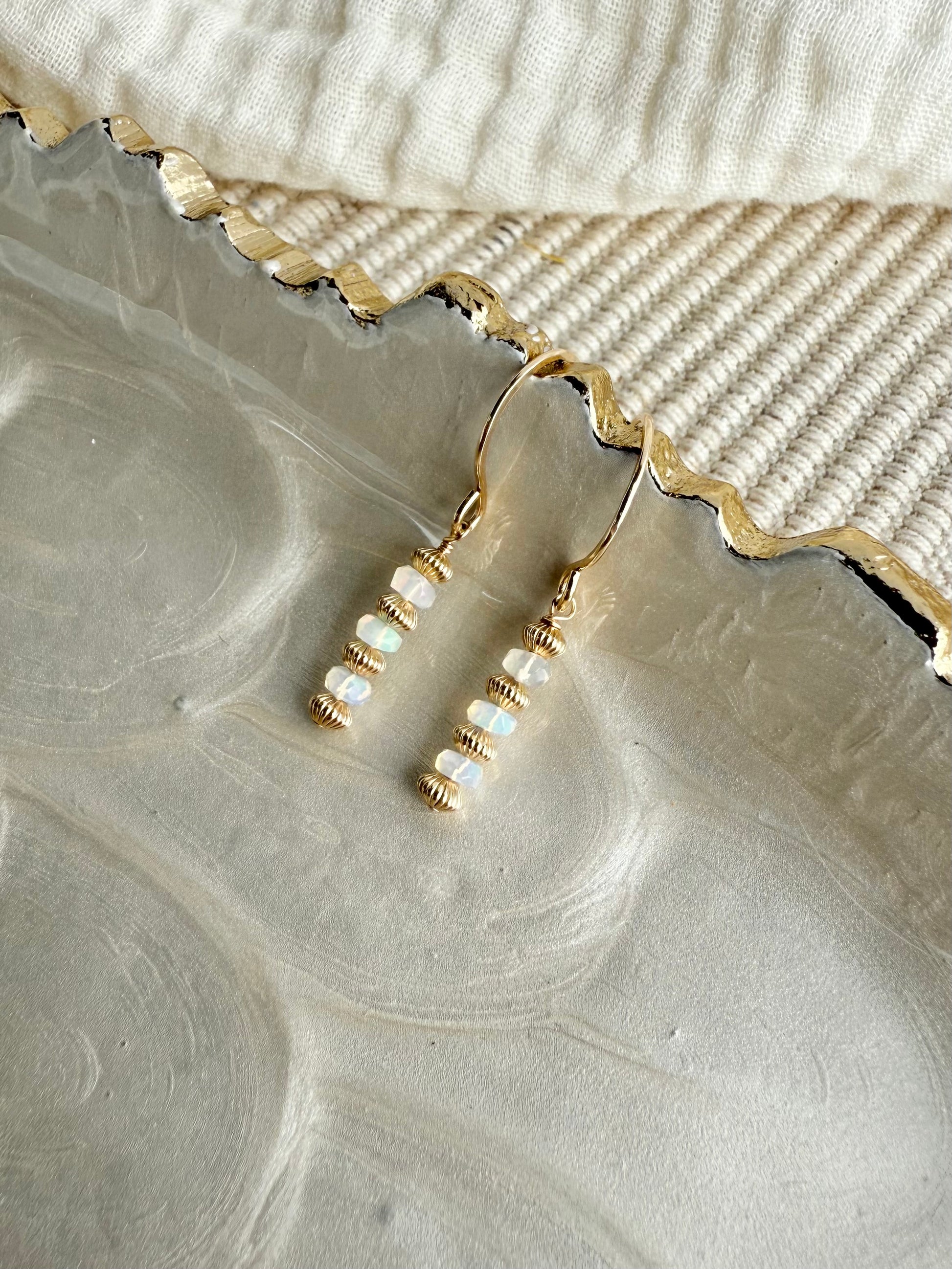 Each earring features three AA grade Ethiopian opals that gently dangle alongside 14k gold-filled textured beads, creating a delicate look. These opals are slightly translucent and shimmer subtly when touched by light. Available exclusively in 14k gold-filled.