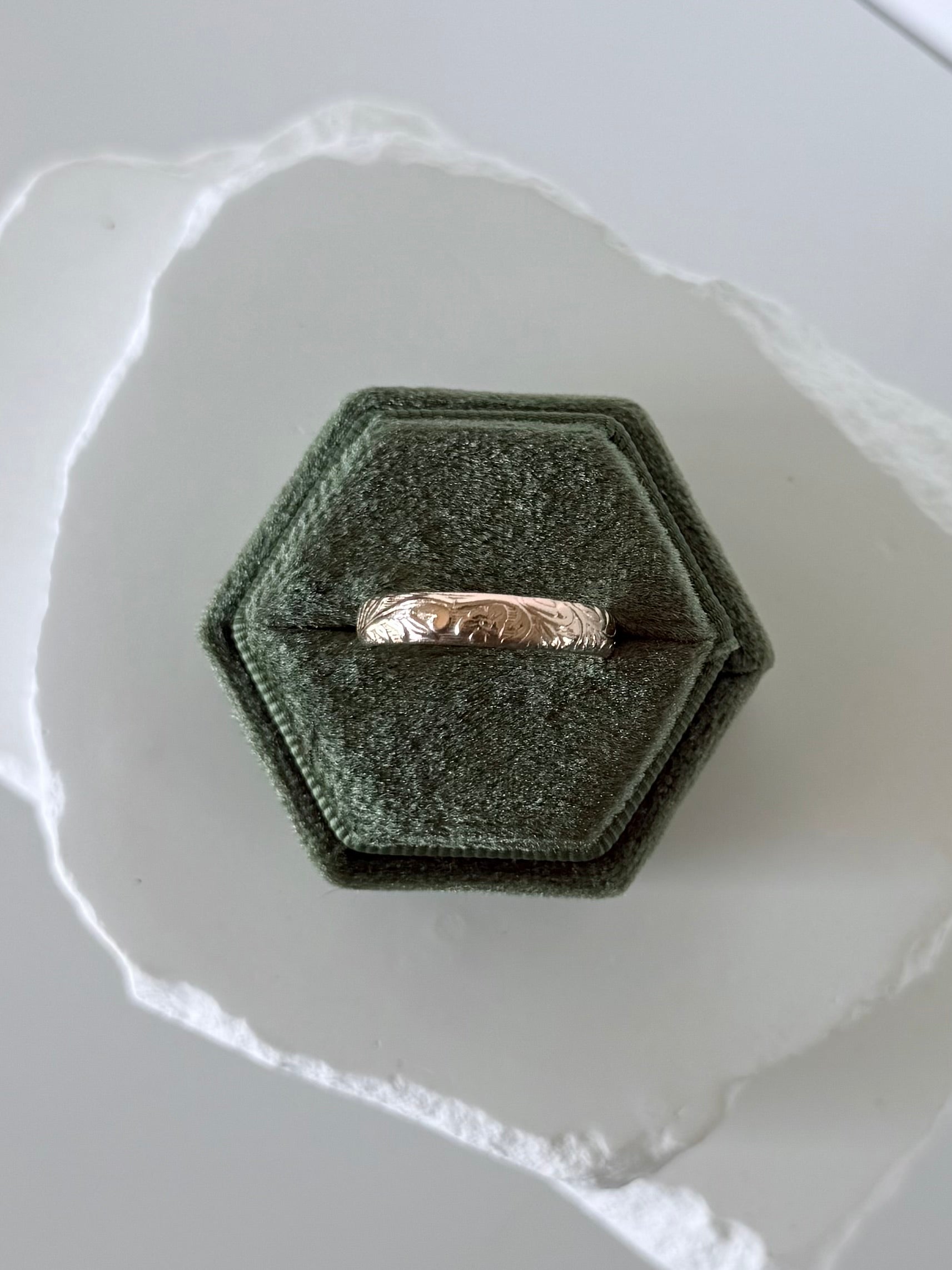 14k Gold Filled ring band with floral pattern.