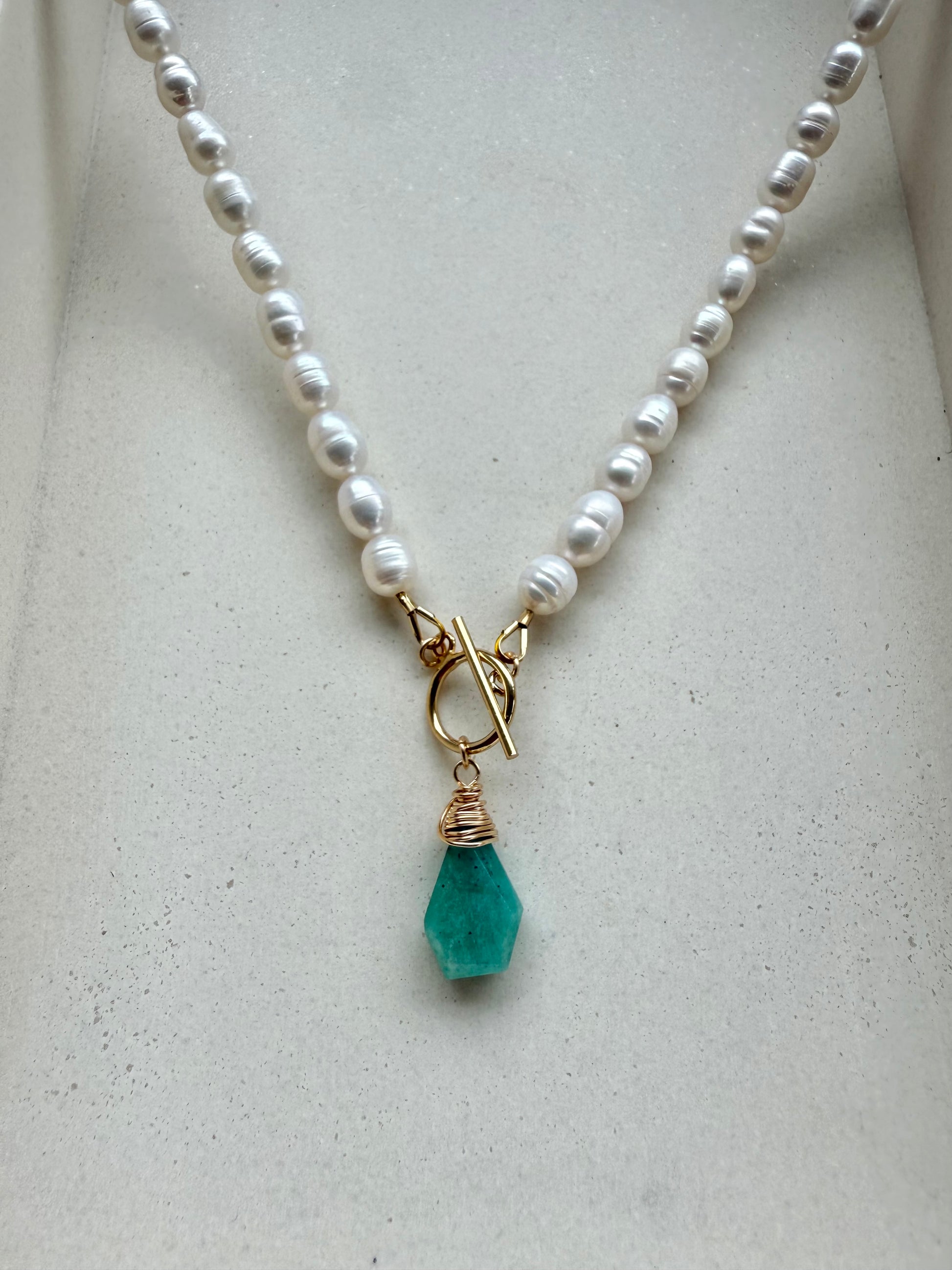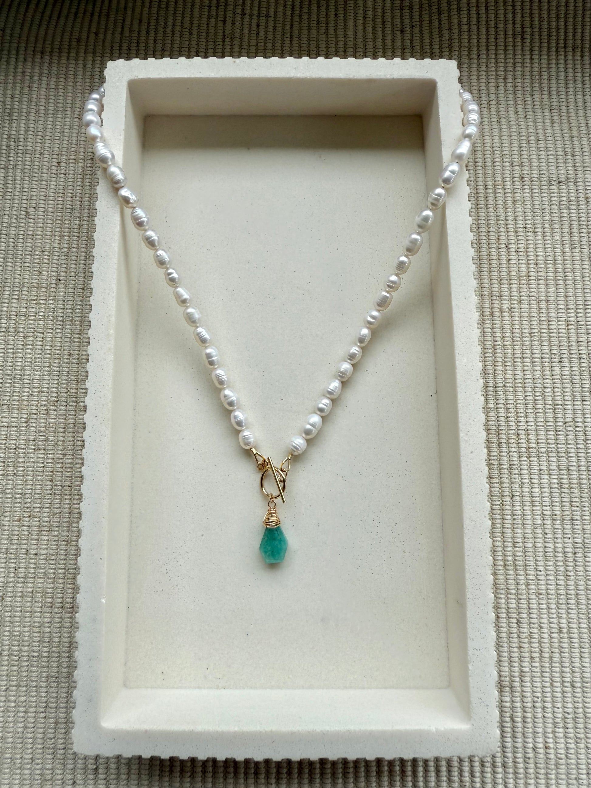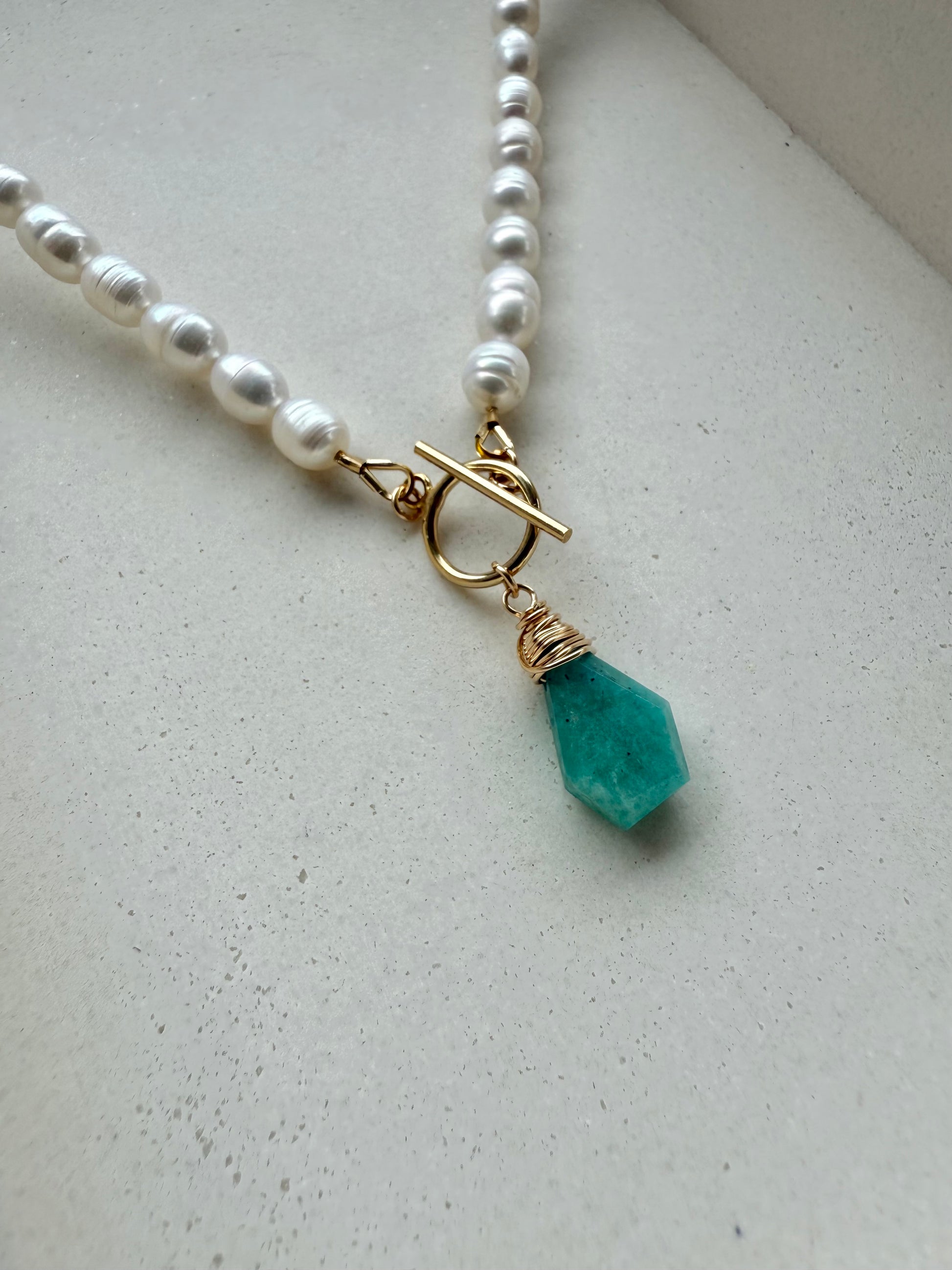 Elevate your everyday elegance with this timeless necklace featuring luminous freshwater pearls and a striking amazonite pendant. The vibrant cyan hue of the amazonite adds a modern pop of color, beautifully suspended from a toggle clasp for an effortlessly chic look. Choose between 14k gold filled or sterling silver to suit your style.