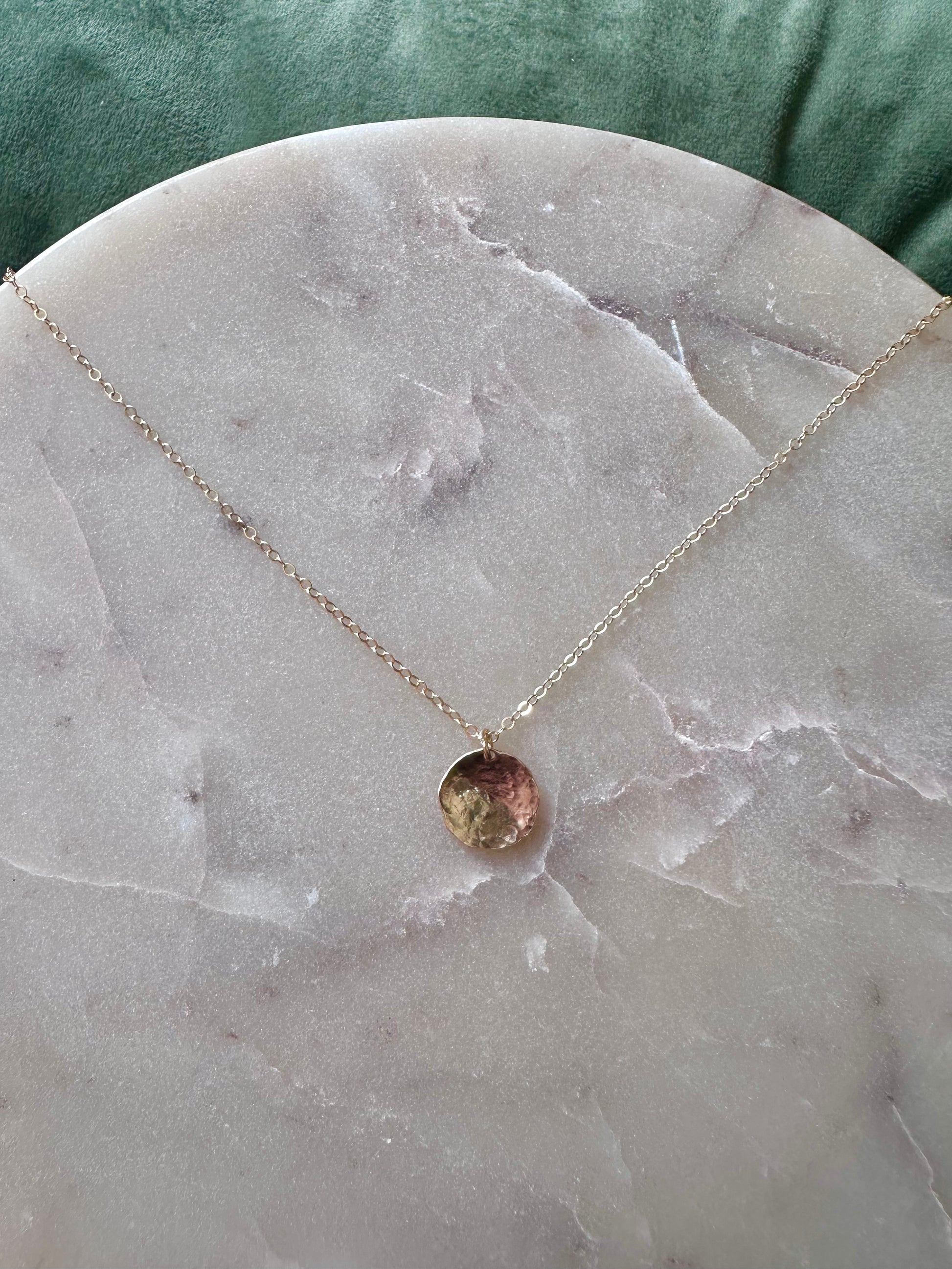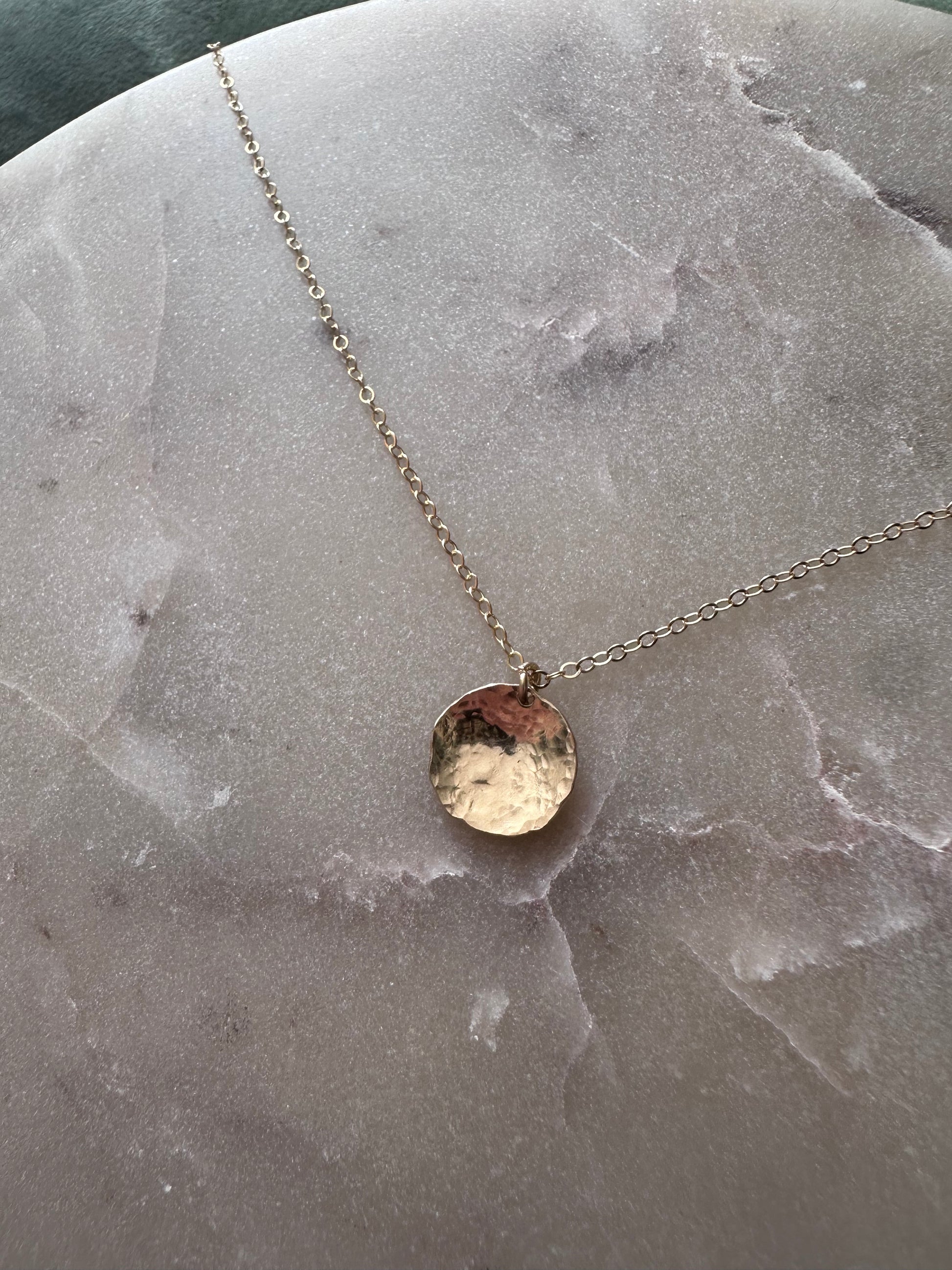 This necklace features a half inch circle. I cut every circle & hammer them to add uniqueness & to catch the light.