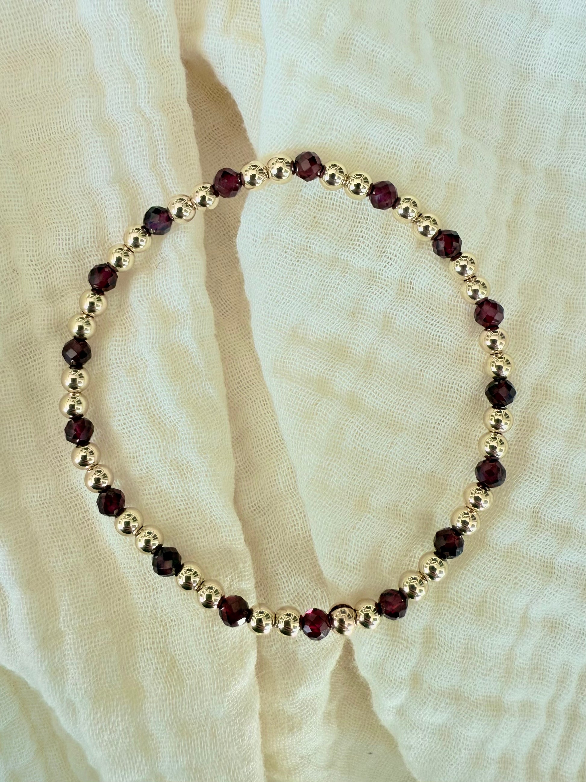 These bracelets are hand strung on a durable, stretchy cord with highest quality 14k gold filled or sterling silver beads and garnet stones. They are meant to last without tarnishing or turning your skin green.