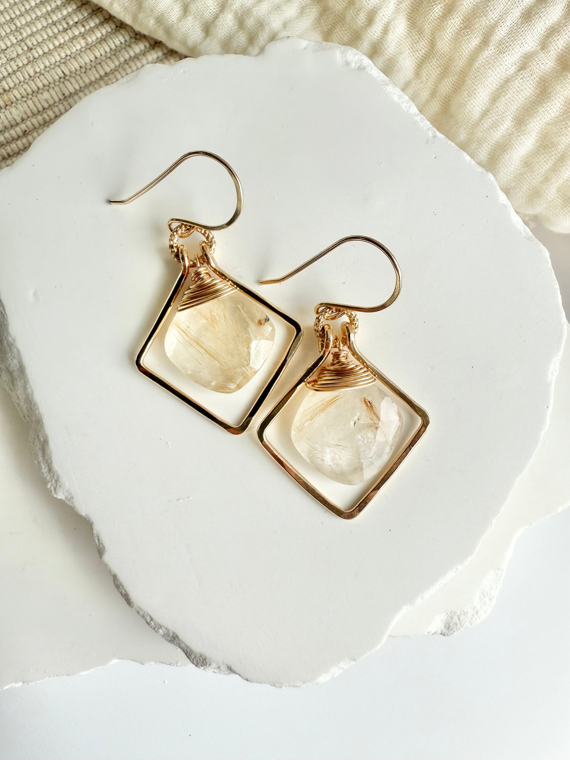 These unique earrings showcase a distinctively shaped Golden Rutile Quartz, set within a hand-hammered and polished frame designed to securely hold the stone.