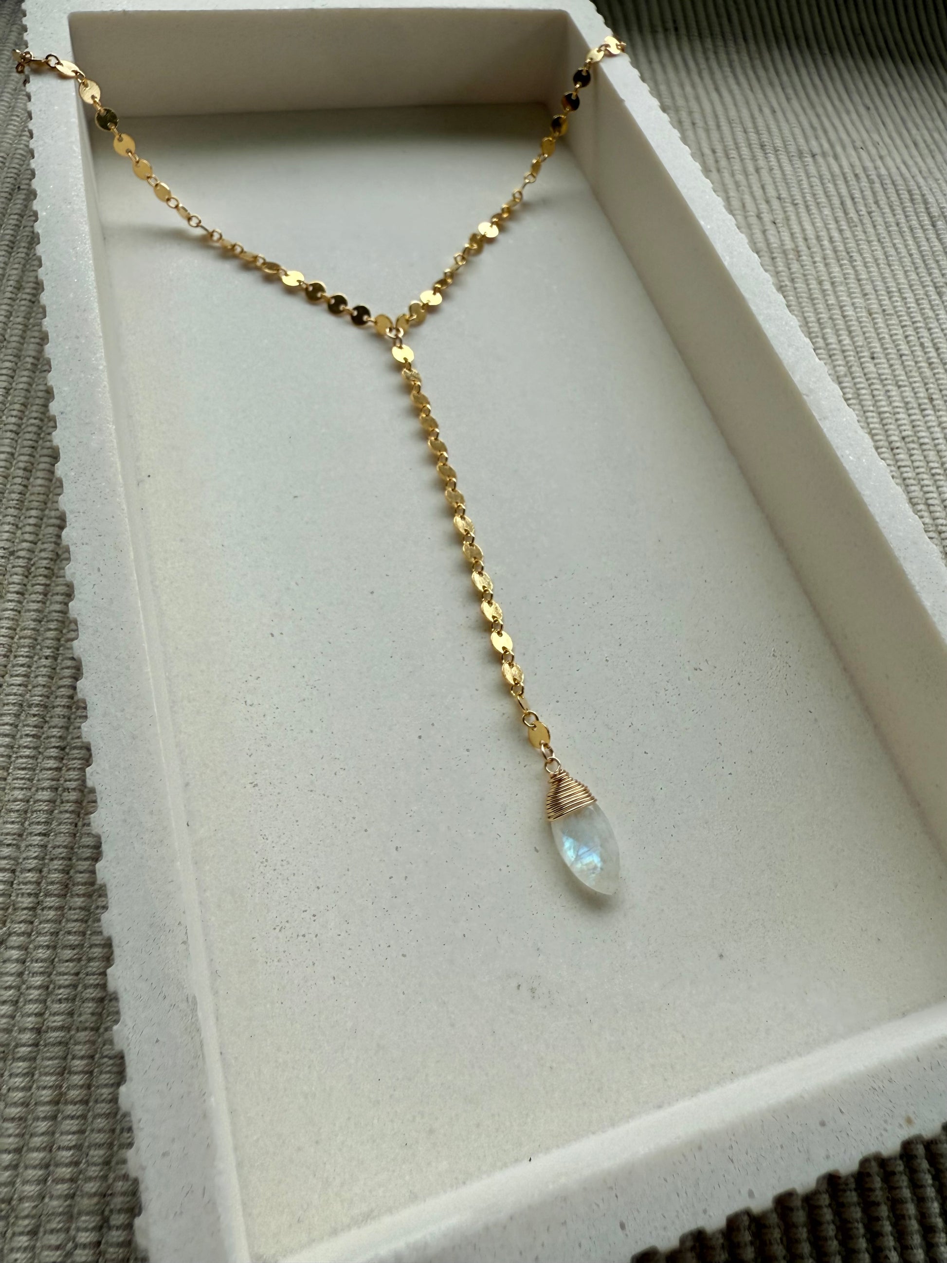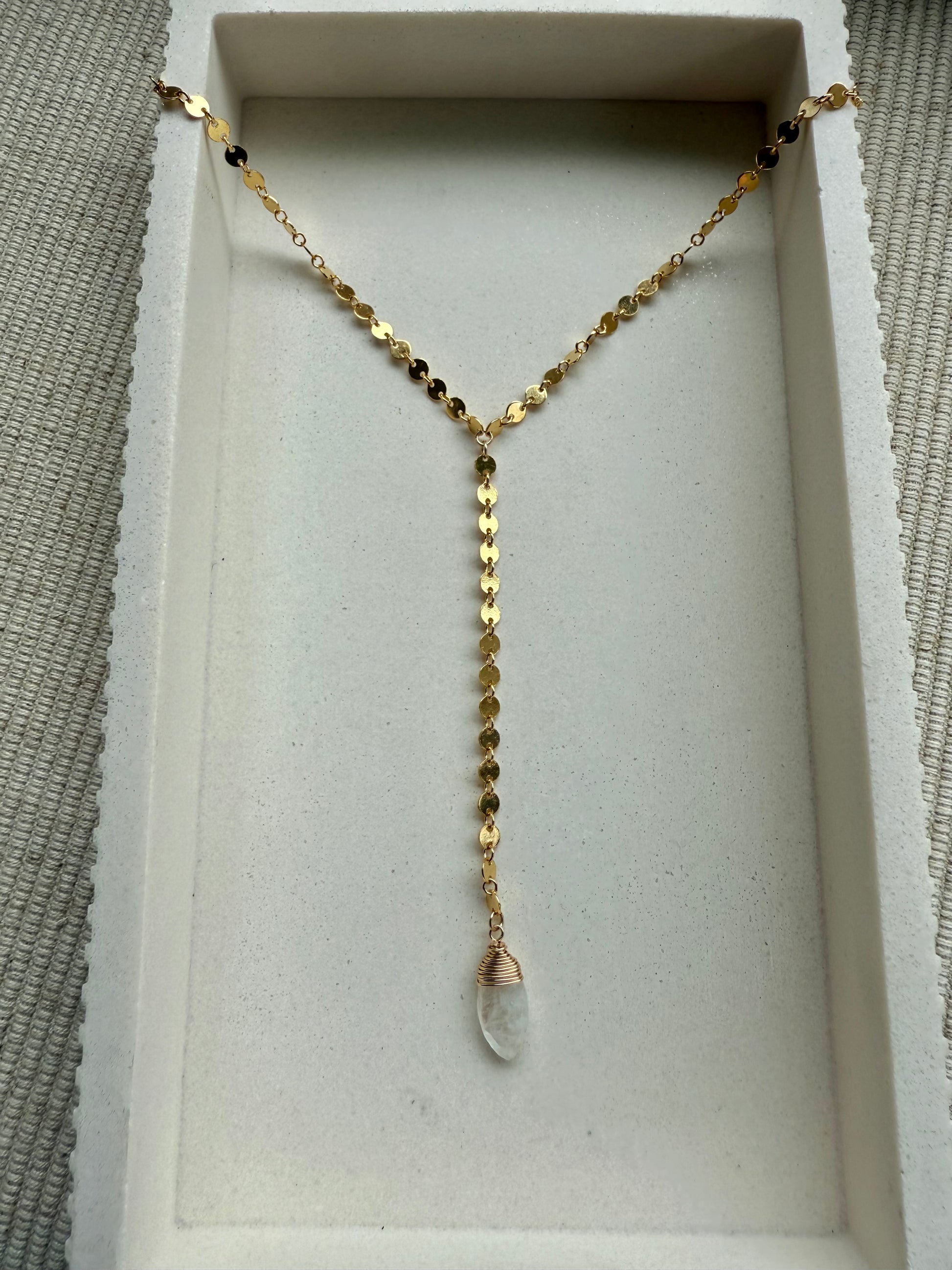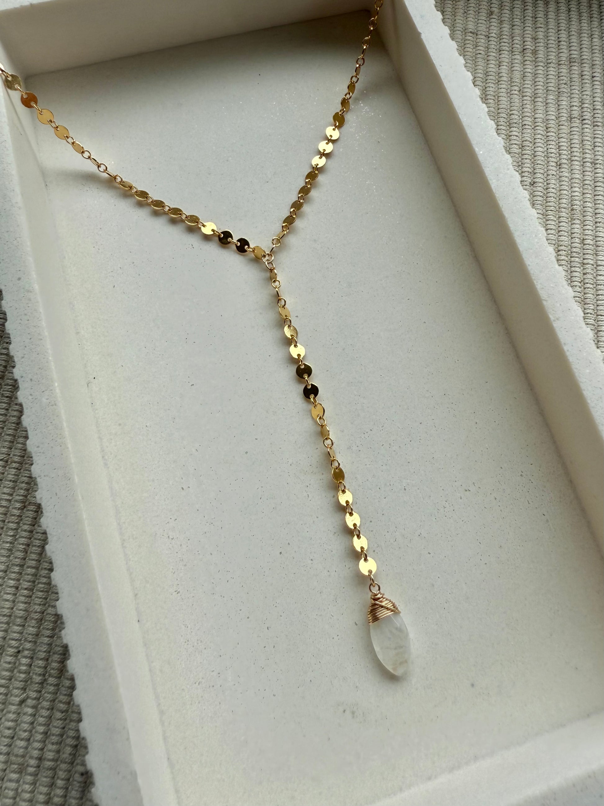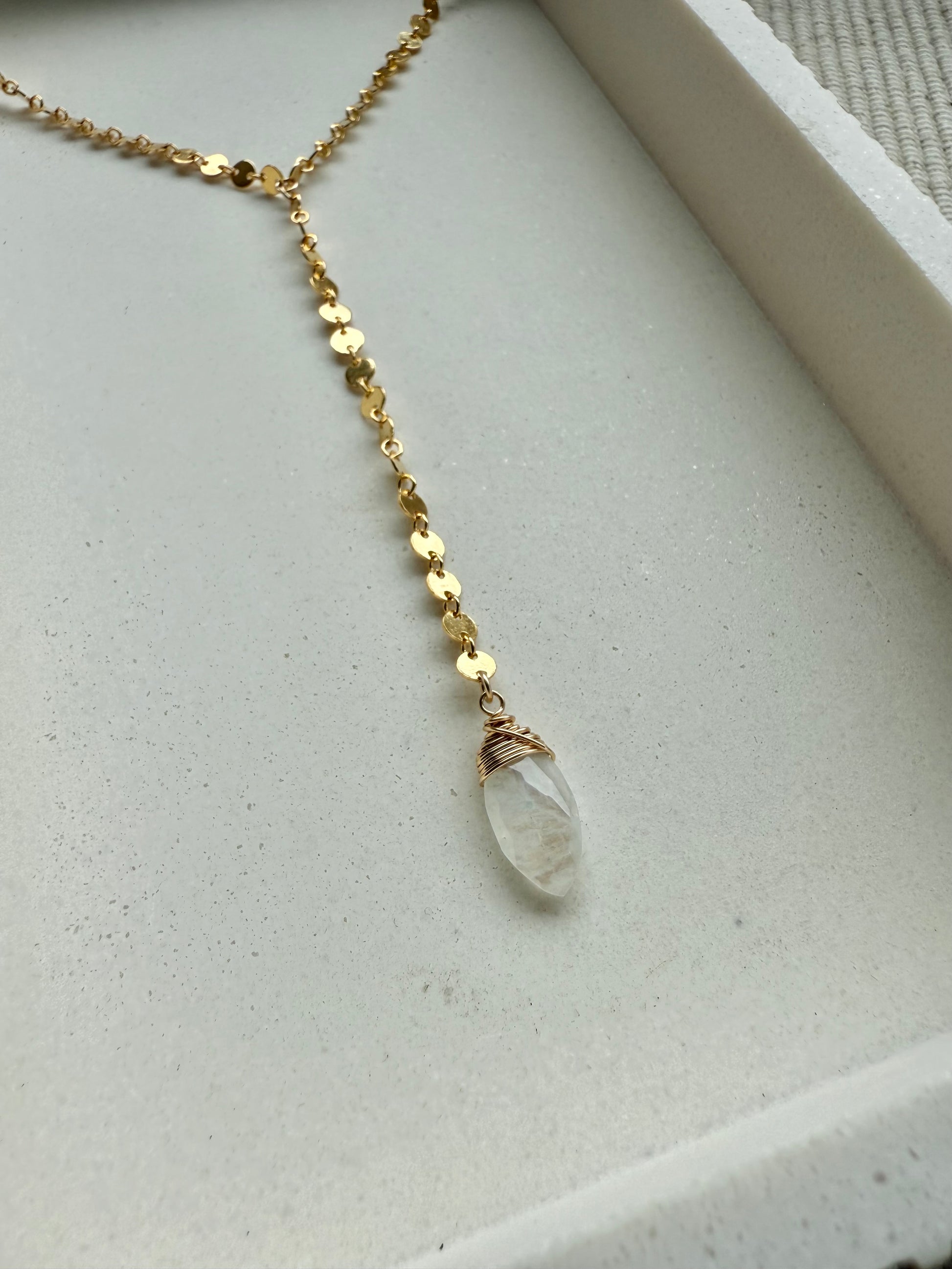 Delicate, light-catching, and just a little celestial. This Y-style lariat necklace features our signature Dolly chain and a pear-shaped faceted moonstone, wire-wrapped and suspended for graceful movement and subtle shimmer.