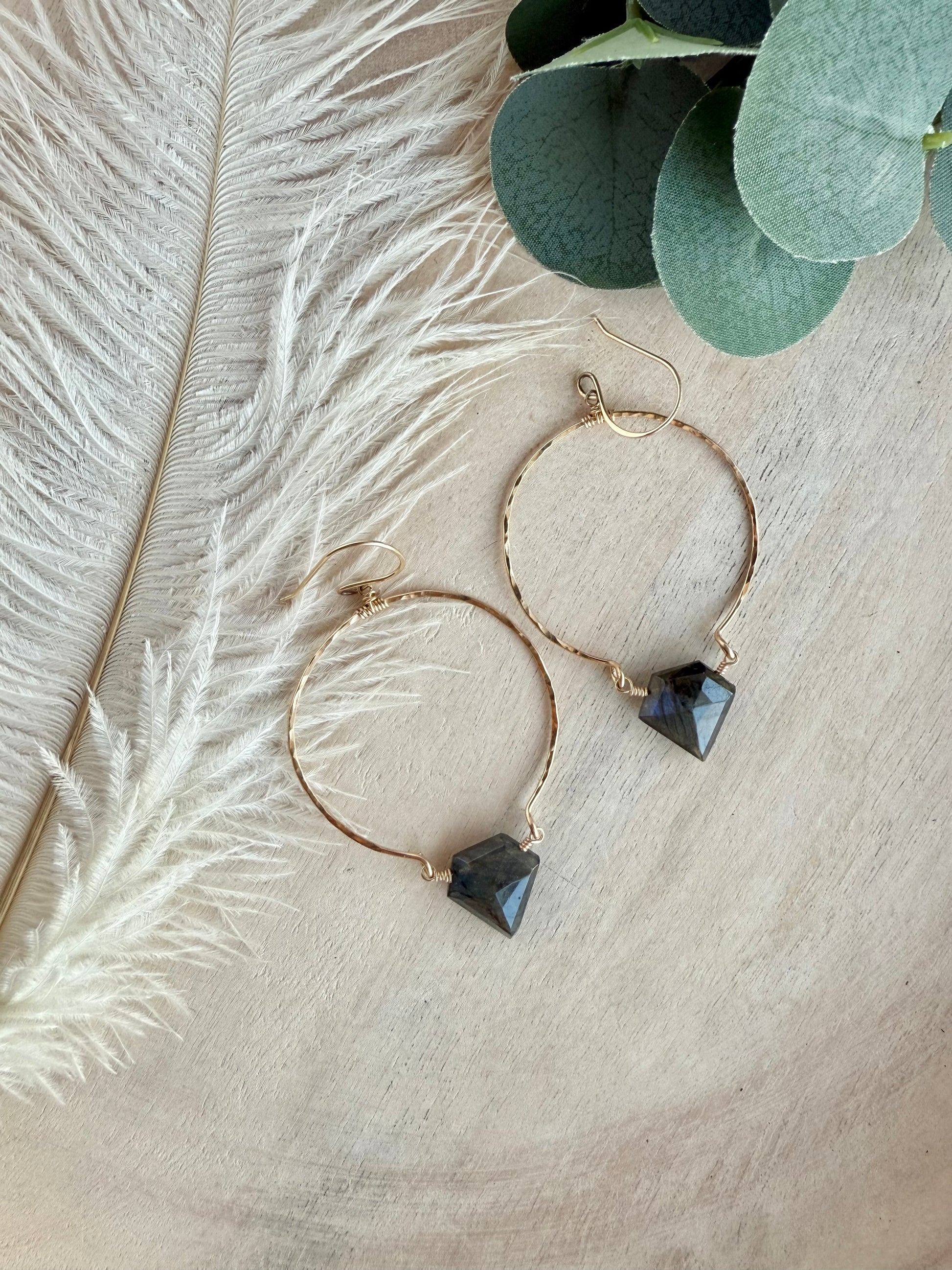 These hoop earrings showcase a labradorite kite on a hand-forged and hammered hoop.