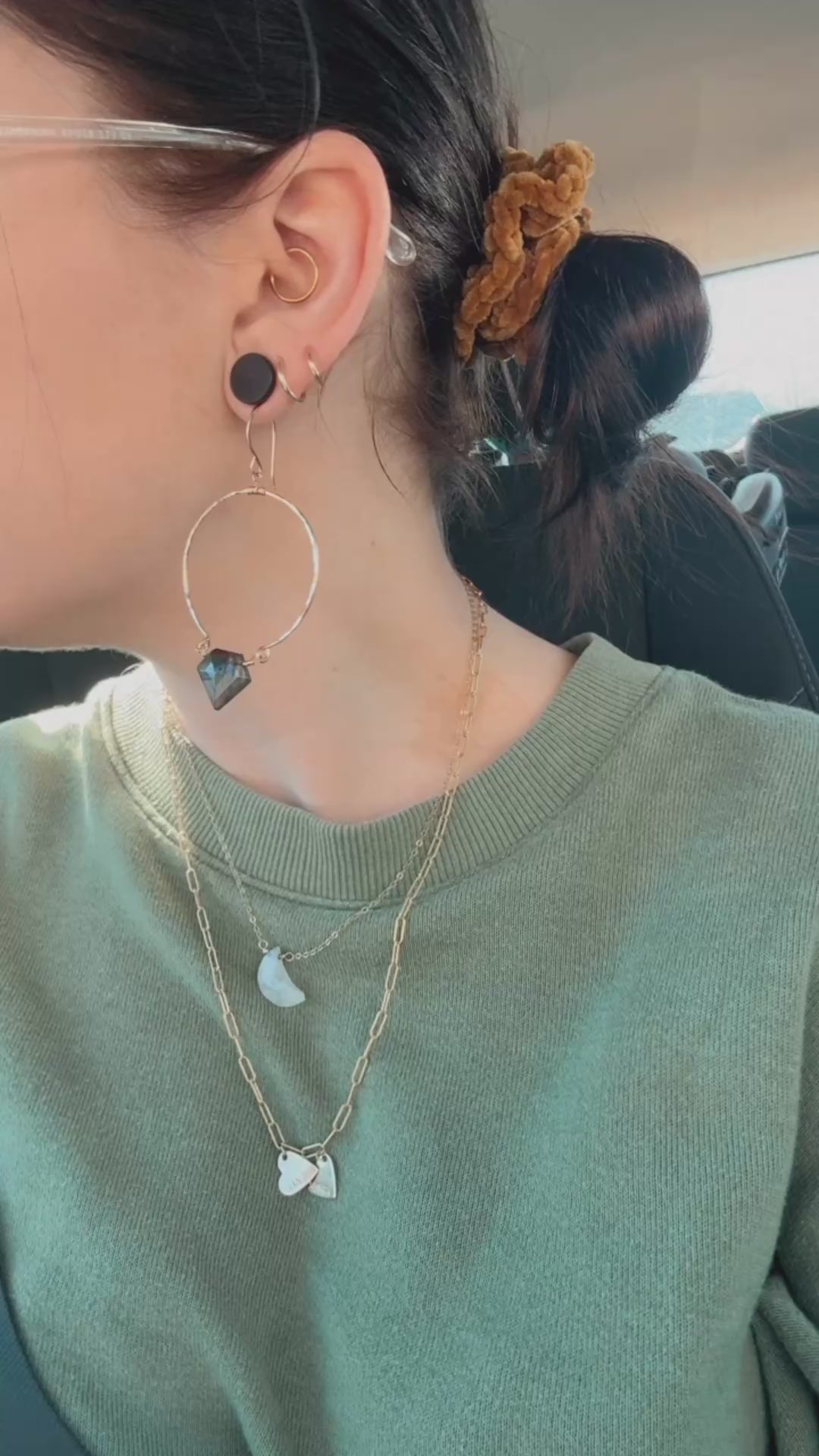 Crafted labradorite, these hoop earrings feature a stunning display of iridescent flashes. As a result, each pair is truly one-of-a-kind, making them the perfect statement accessory to add a touch of elegance and individuality to any outfit.