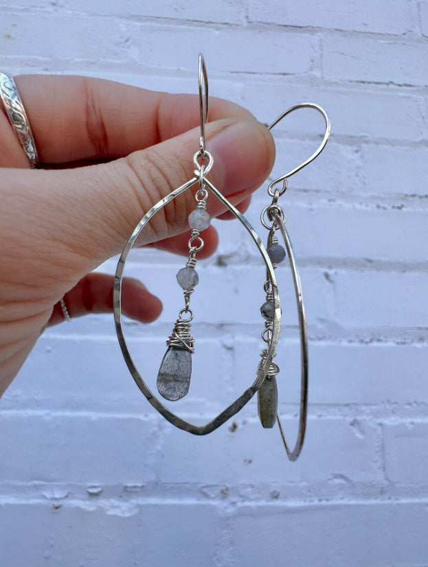 These earrings feature two small faceted labradorite stones and one uneven tear drop labradorite stone wrapped & hanging from the top center of our large t petal hoops.