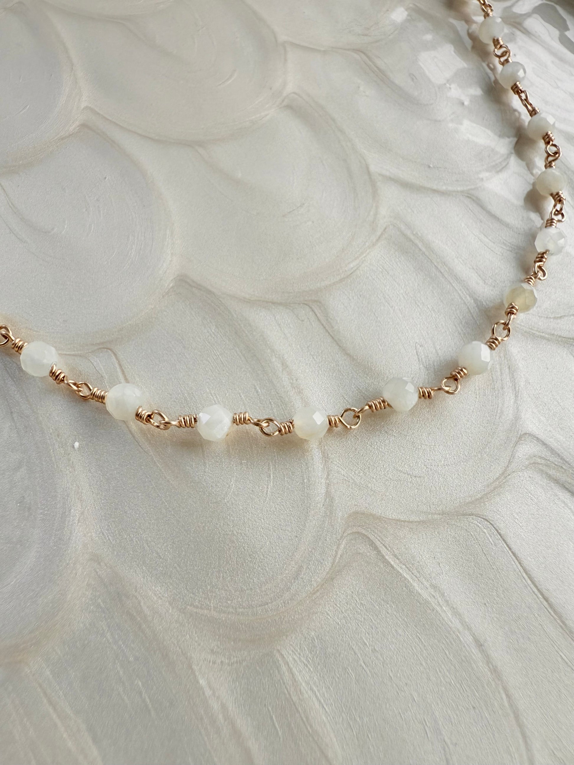 Delicate, luminous, and handcrafted just for you. Our Moonstone Necklace features 4mm faceted moonstone beads, each hand-wrapped with precision for a dainty, elegant look that catches the light beautifully. Known as the “stone of new beginnings,” moonstone adds a subtle shimmer and meaning to your everyday style.