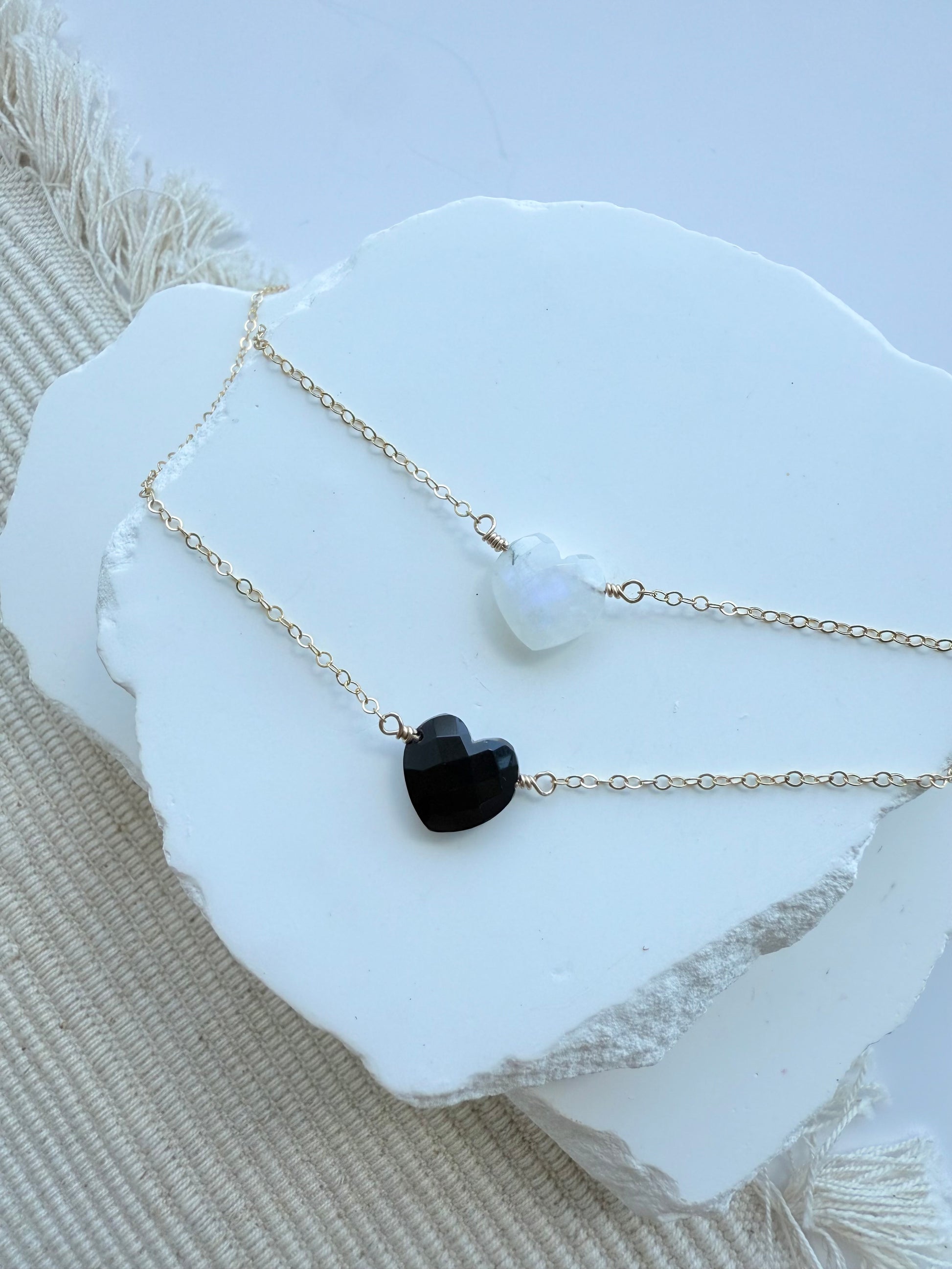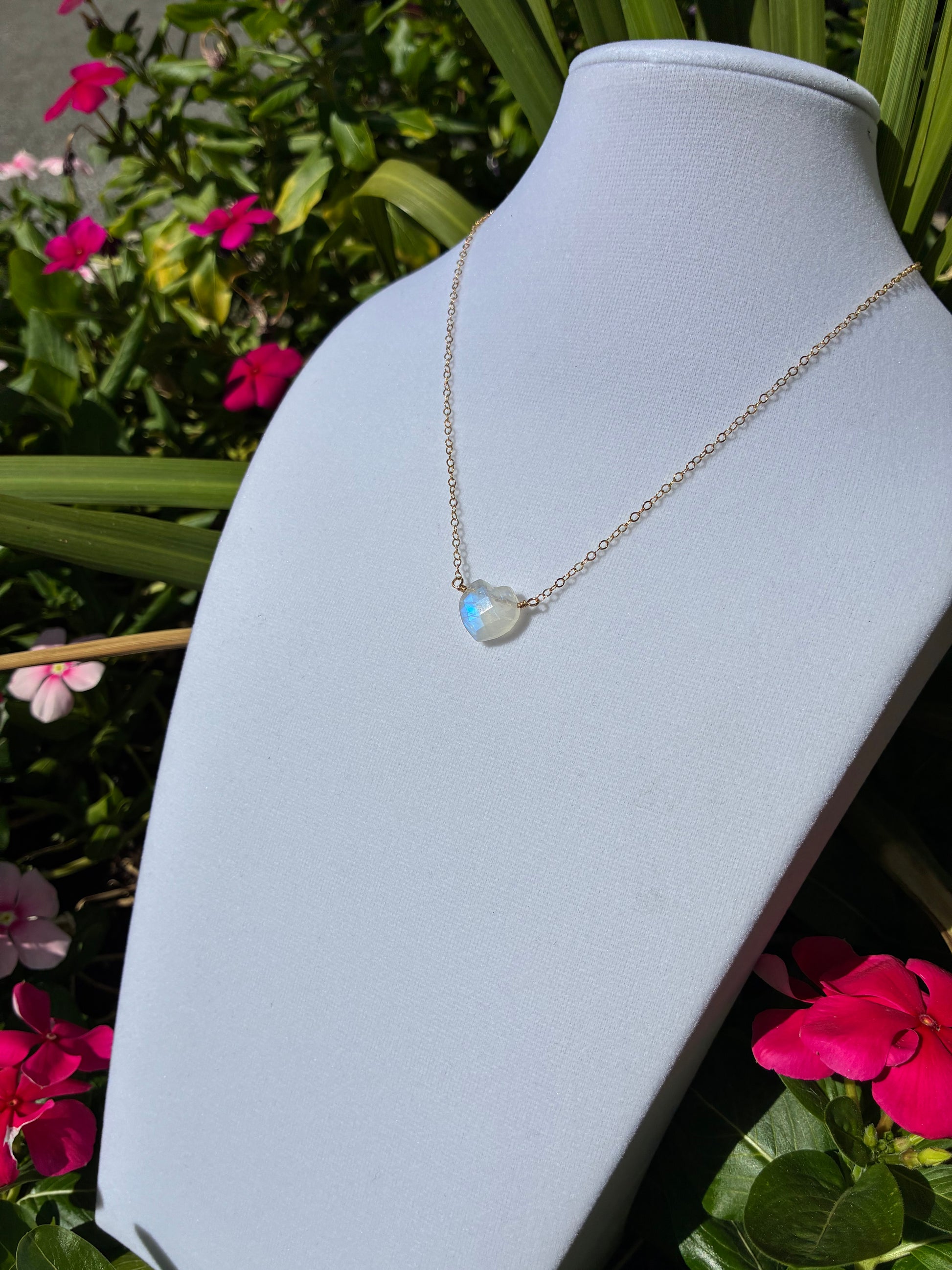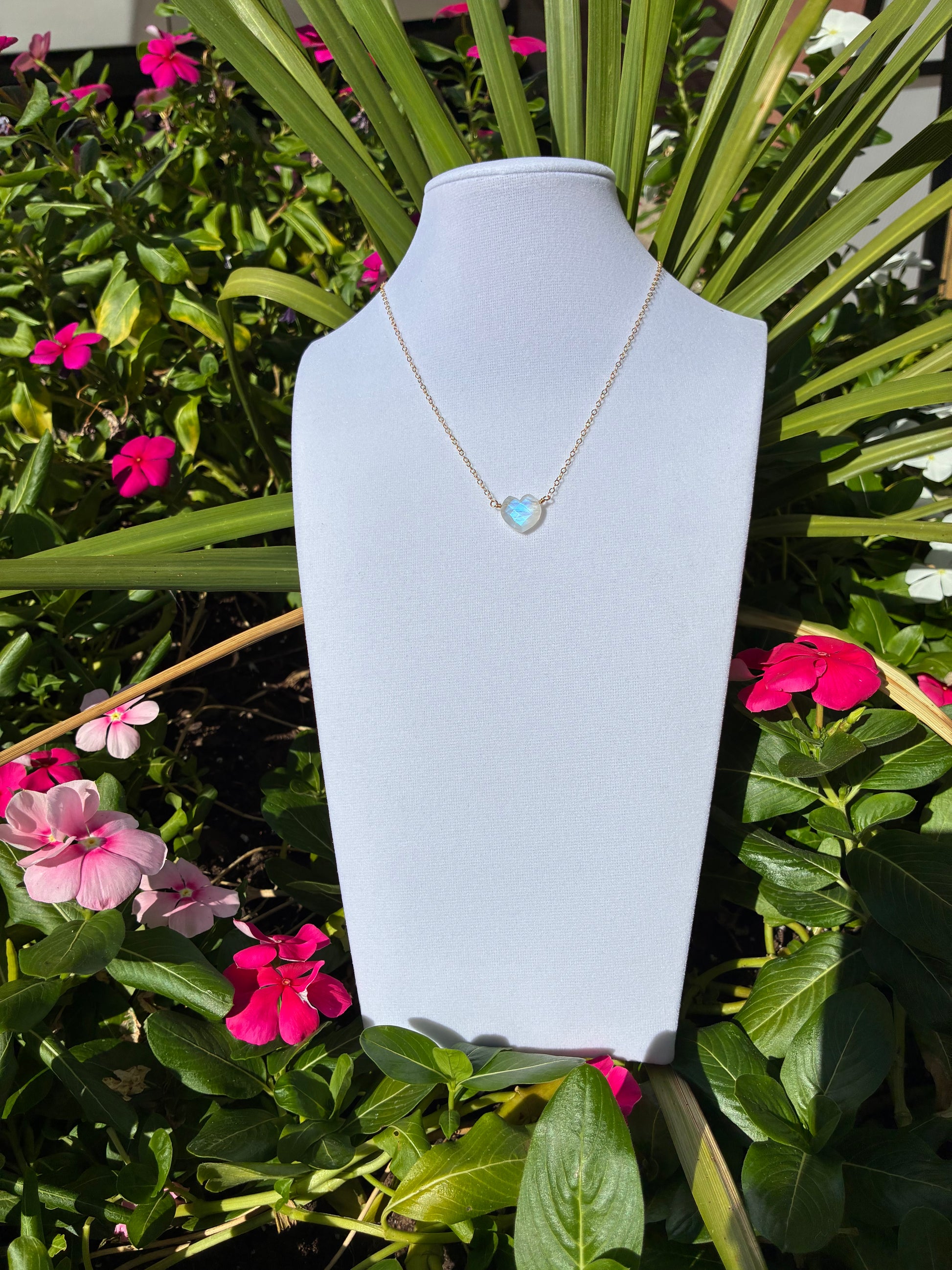 This minimalistic necklace features one heart shaped moonstone on the chain of your choosing.