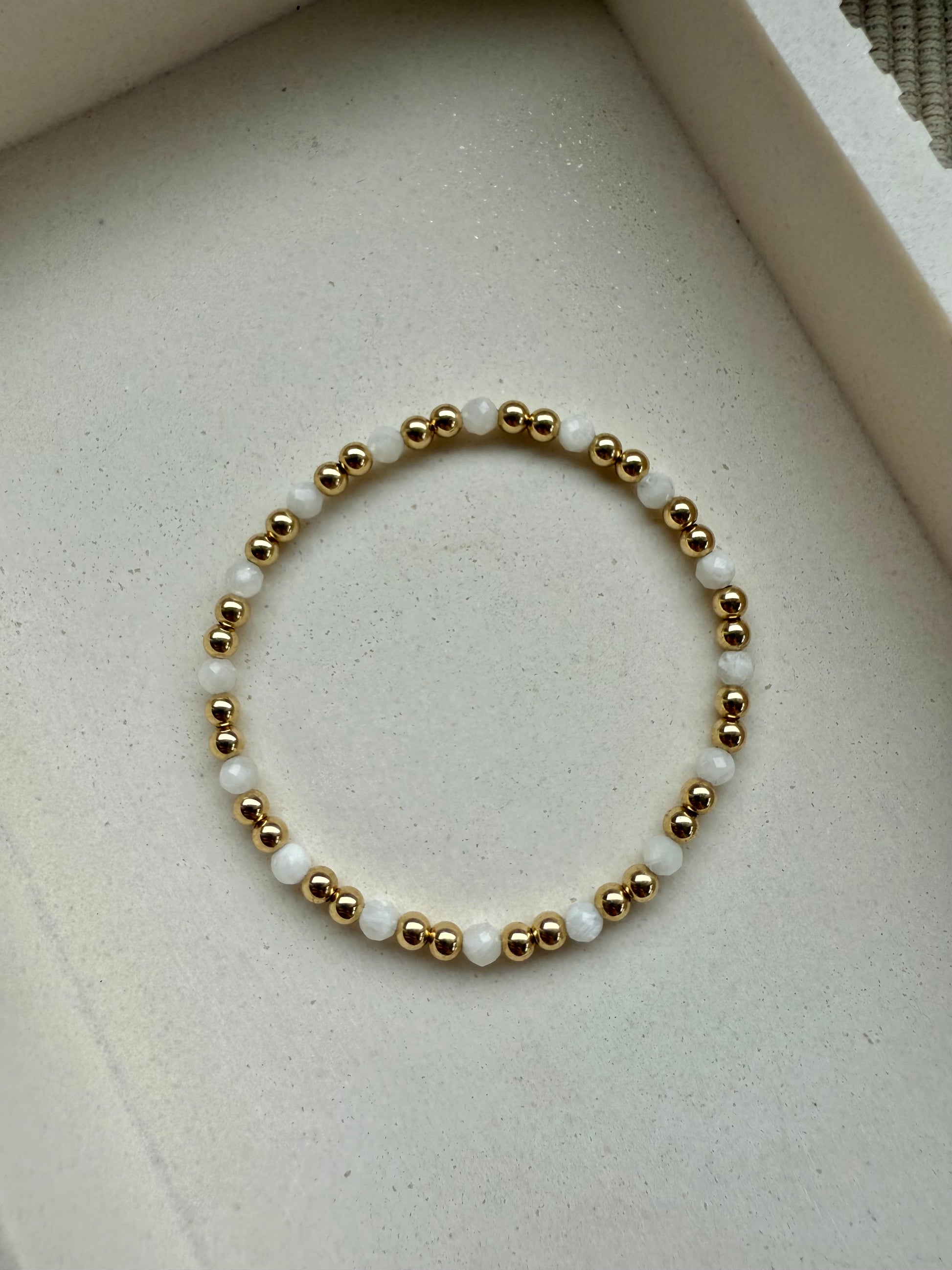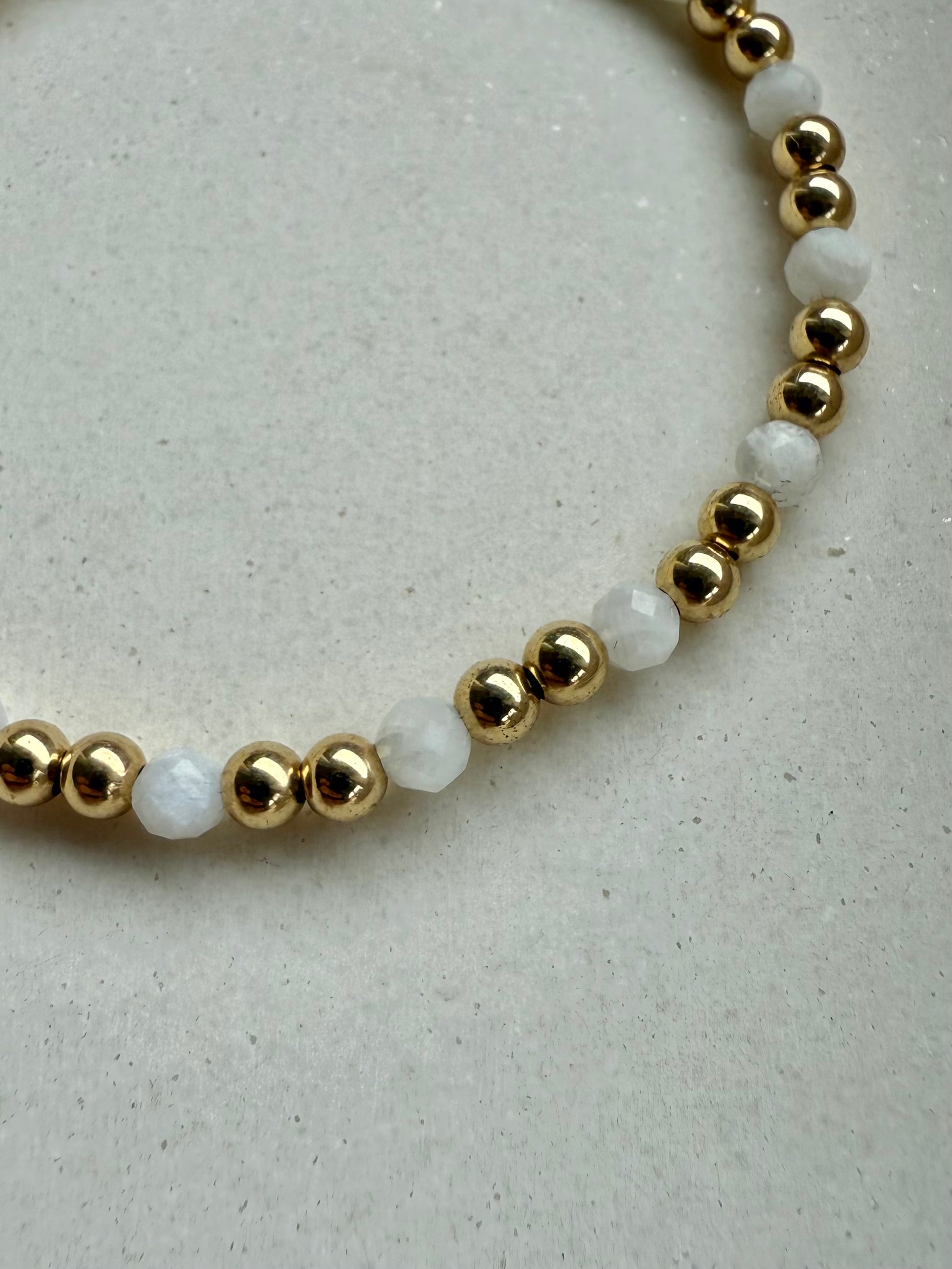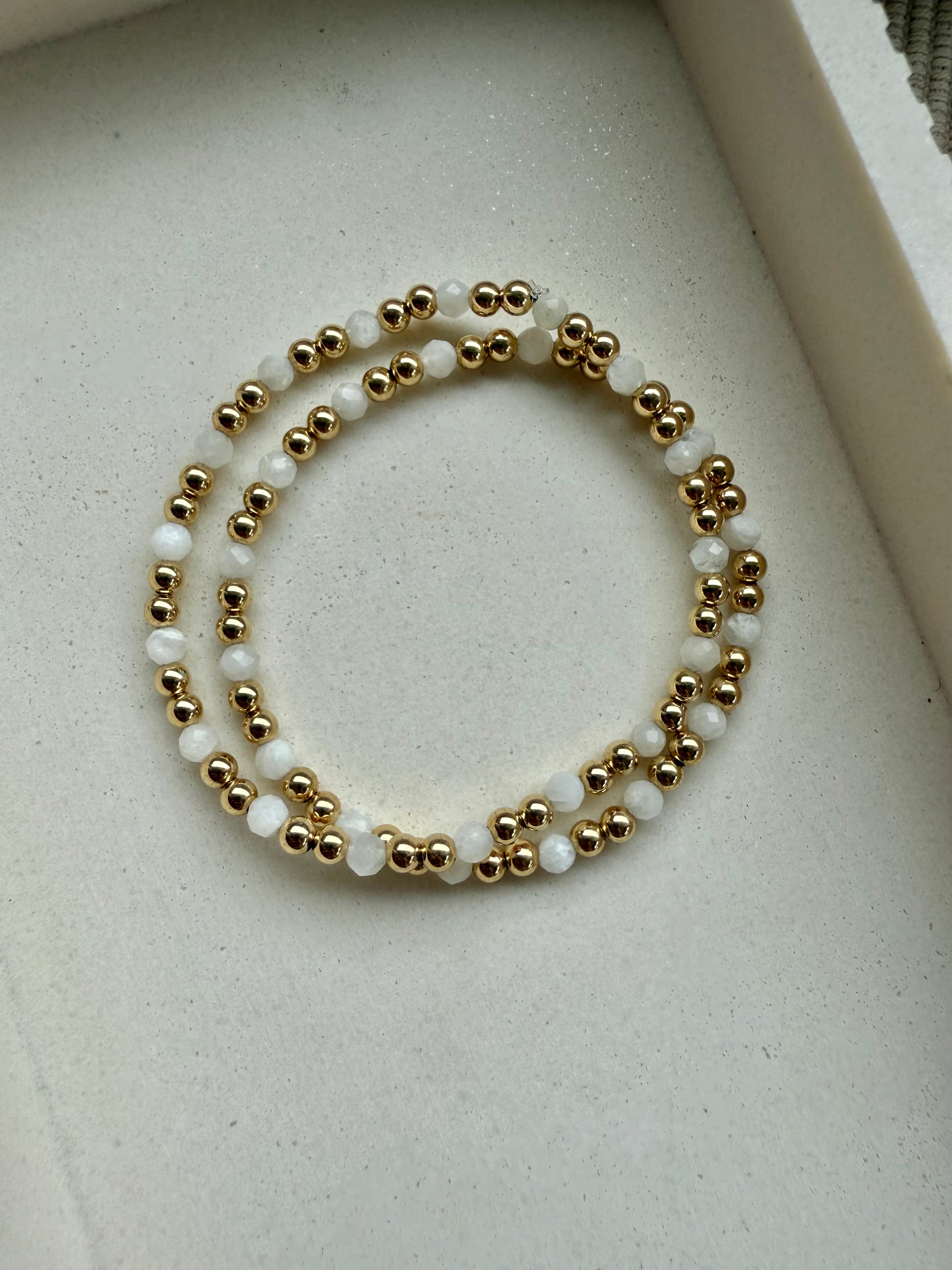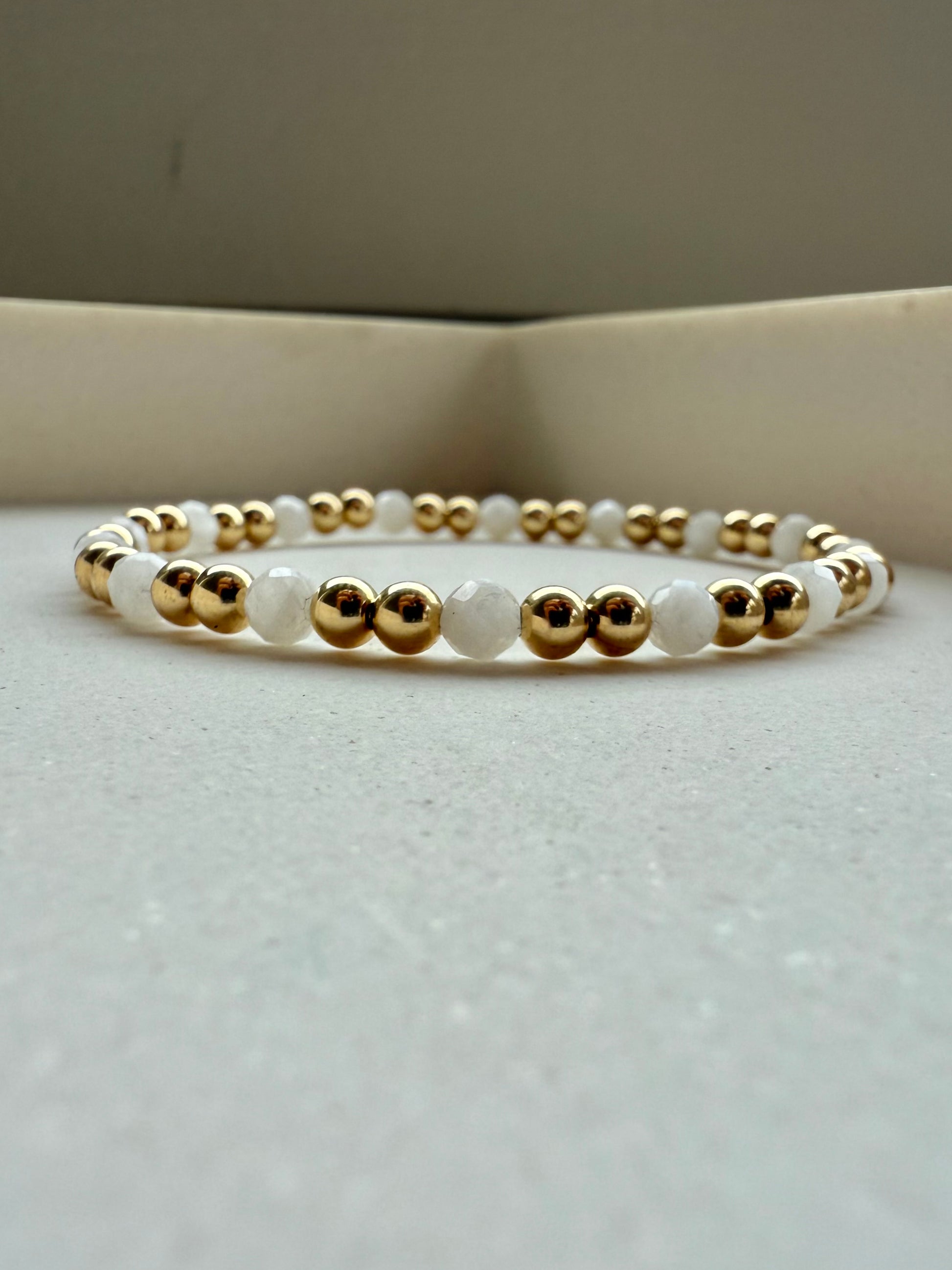 These bracelets are hand strung on a durable, stretchy cord with highest quality 14k gold filled or sterling silver beads and moonstones. They are meant to last without tarnishing or turning your skin green.