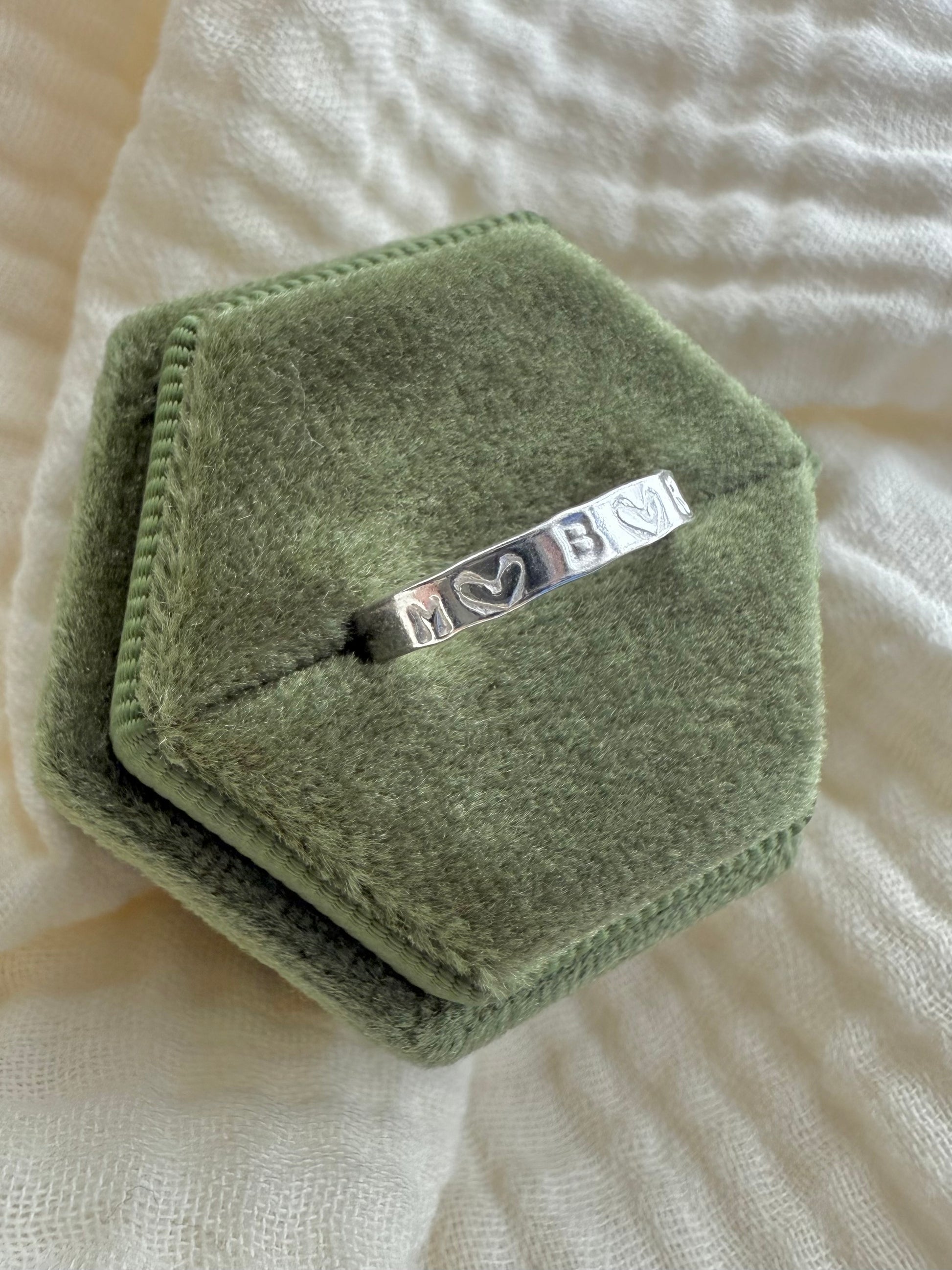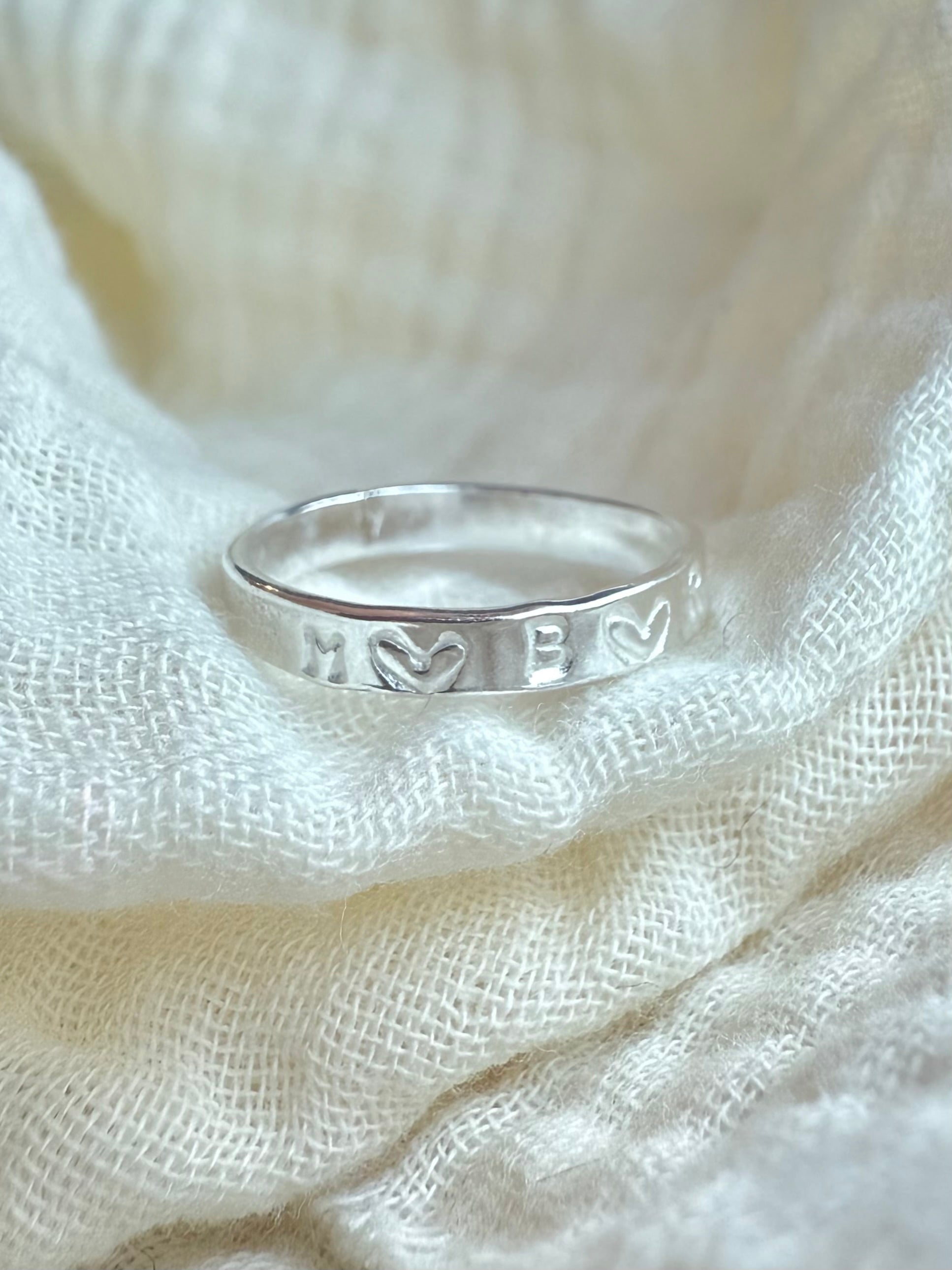 A meaningful way to keep your loved ones close, this flat 3mm band is hand-stamped with multiple initials, each separated by a heart. Whether it represents your children, family members, or a special connection, this personalized ring is a timeless keepsake made just for you.