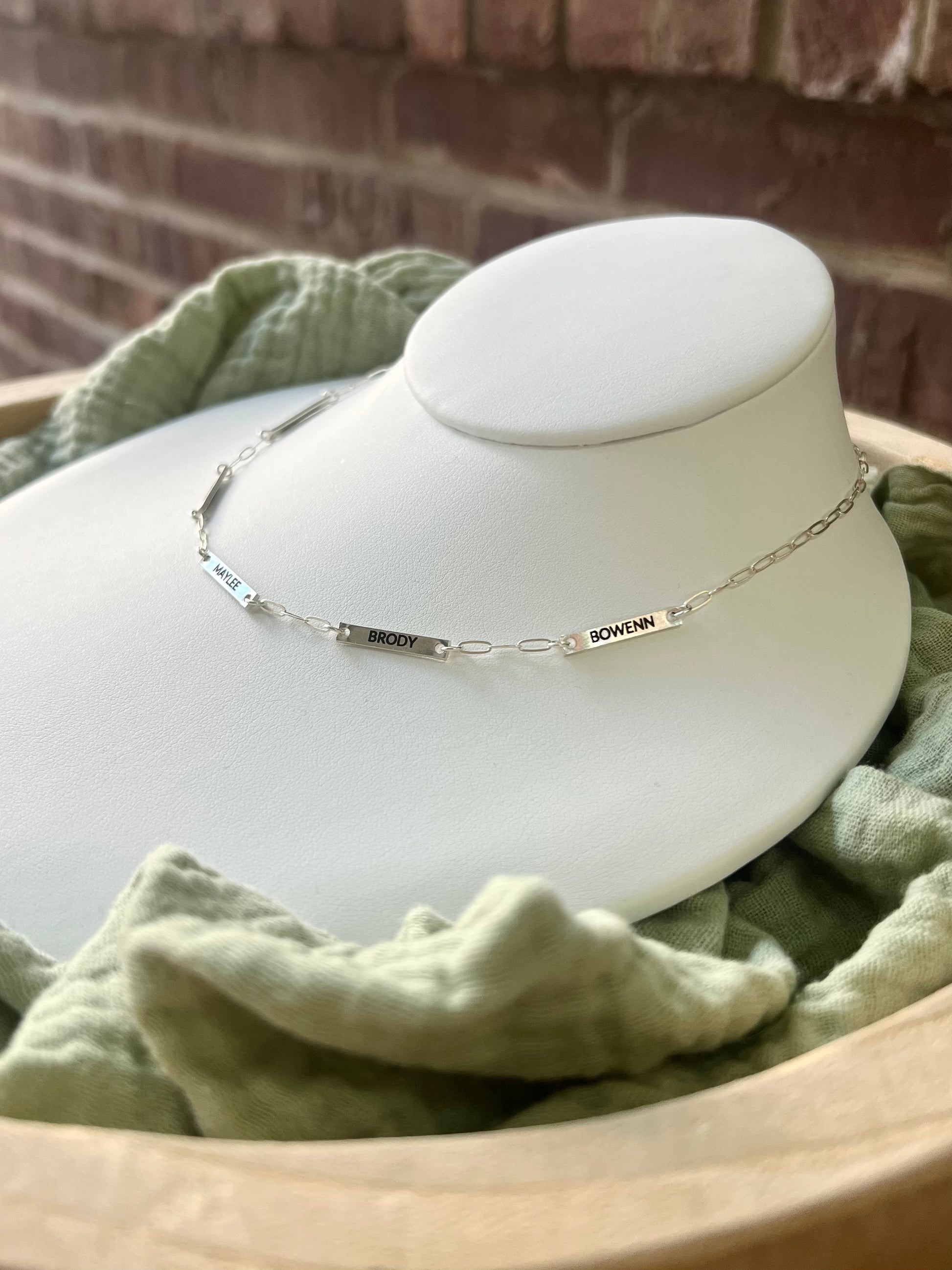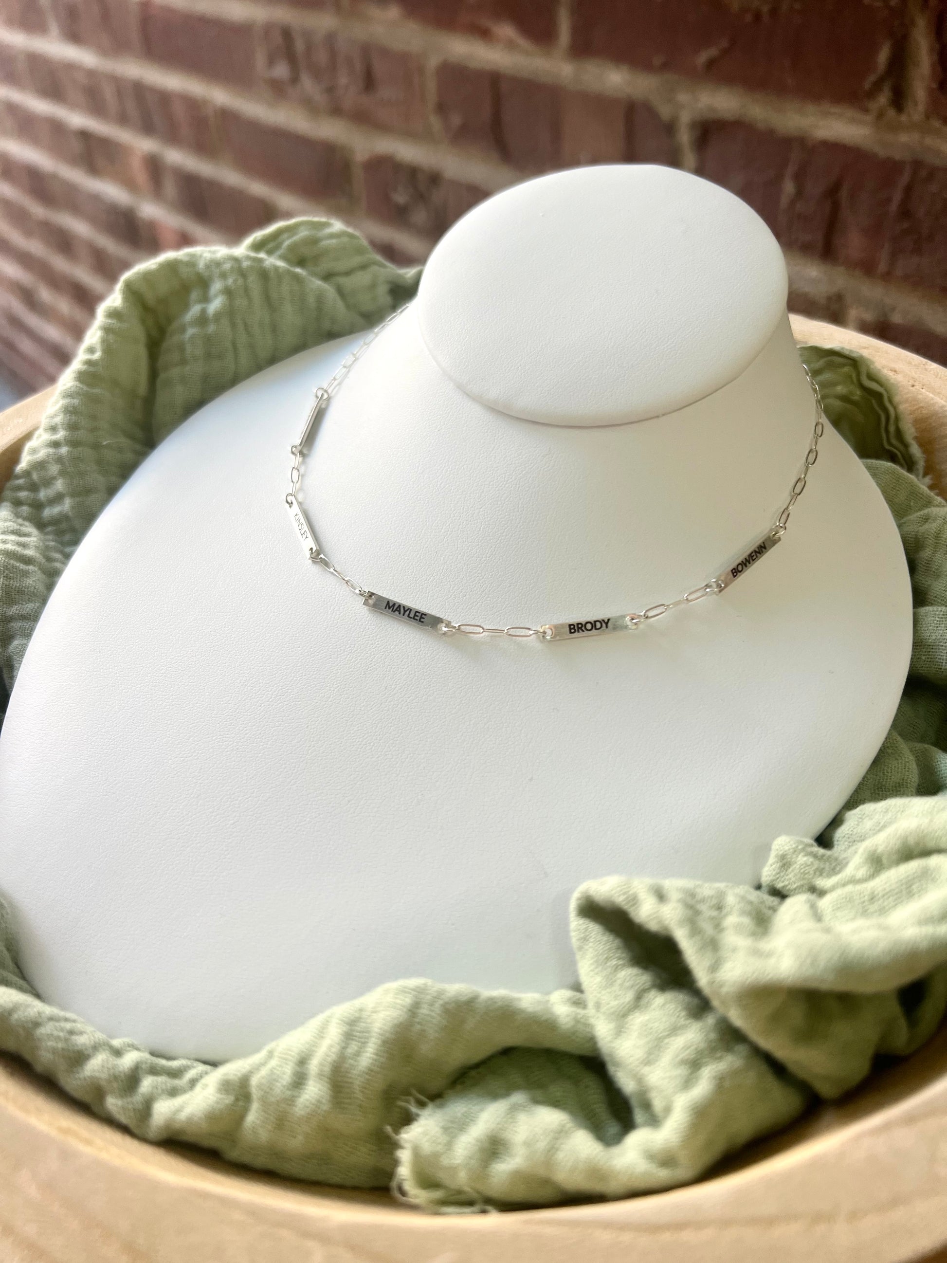 This minimalistic, personalized necklaces features up to 12 bars with the names of your choosing. Coming on our Amy Mini chain (2mm) and hand cut bars (1” wide) it creates a delicate piece to wear every day.