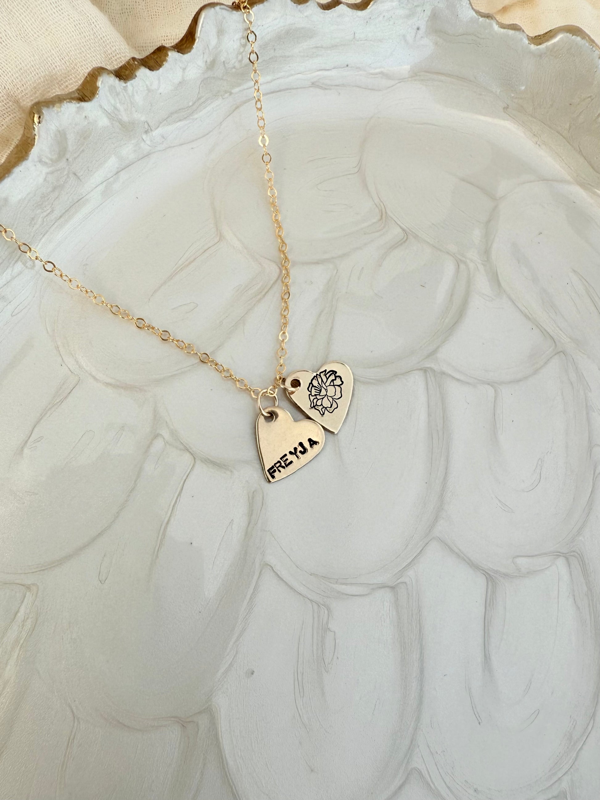 A heartfelt way to carry the ones you love. This necklace comes with two hand-stamped heart charms—one with the name of your choice and one with the birth flower for that special month.