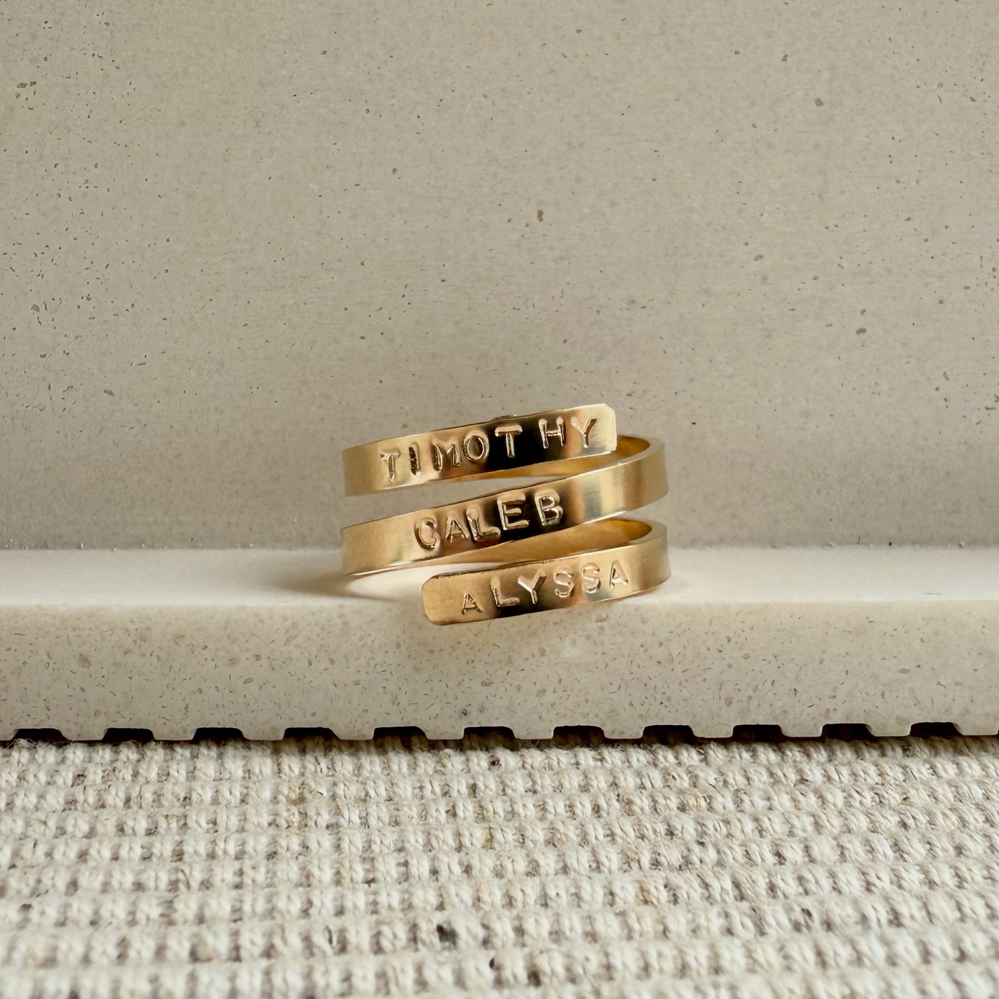 Three names, one meaningful piece. Our triple wrap name ring is hand stamped with a name on each layer of the wrap — perfect for kids’ names, siblings, partners, or any trio that holds your heart. The flat 3mm band wraps neatly around the finger for a bold yet comfortable everyday ring.