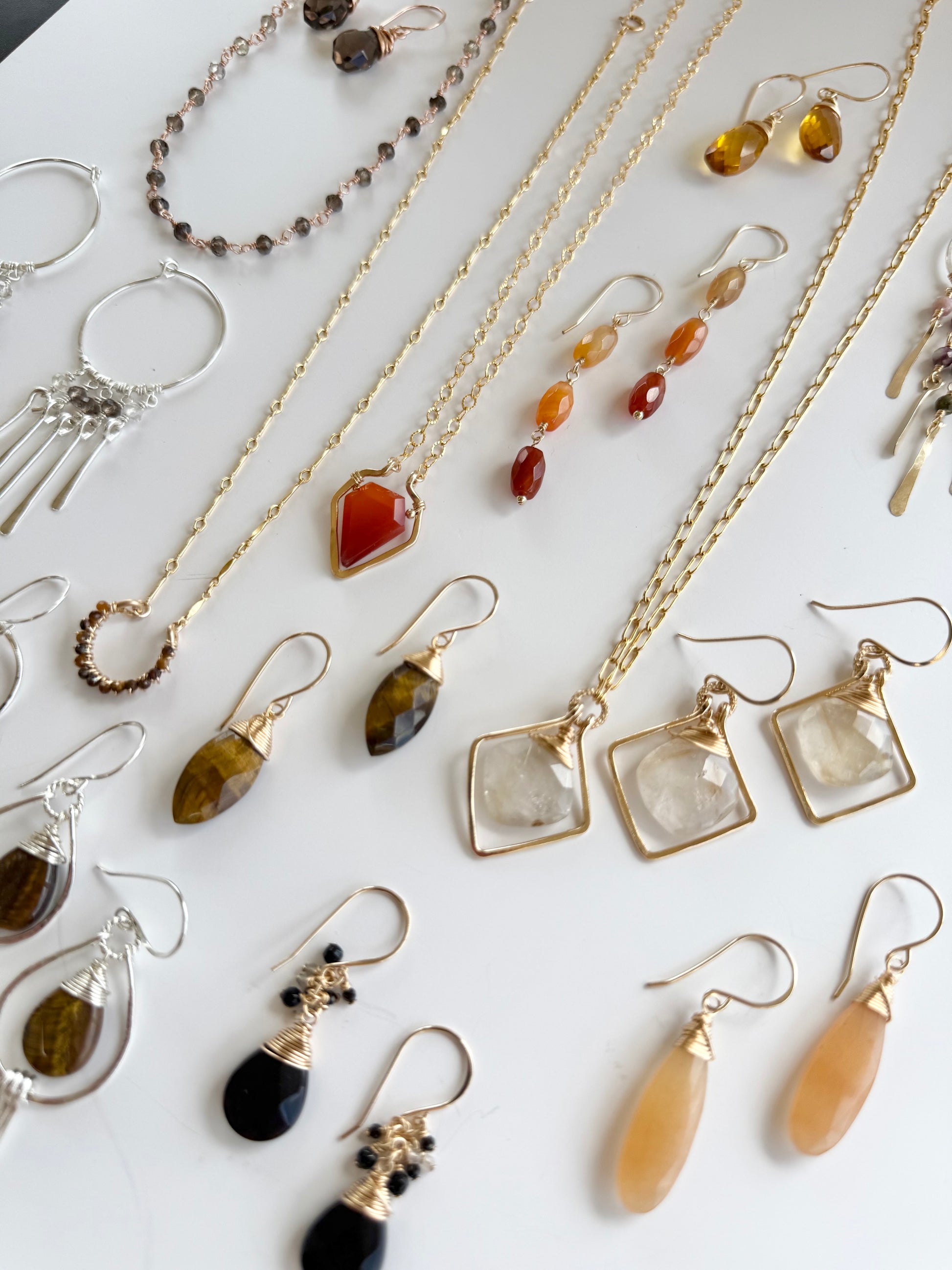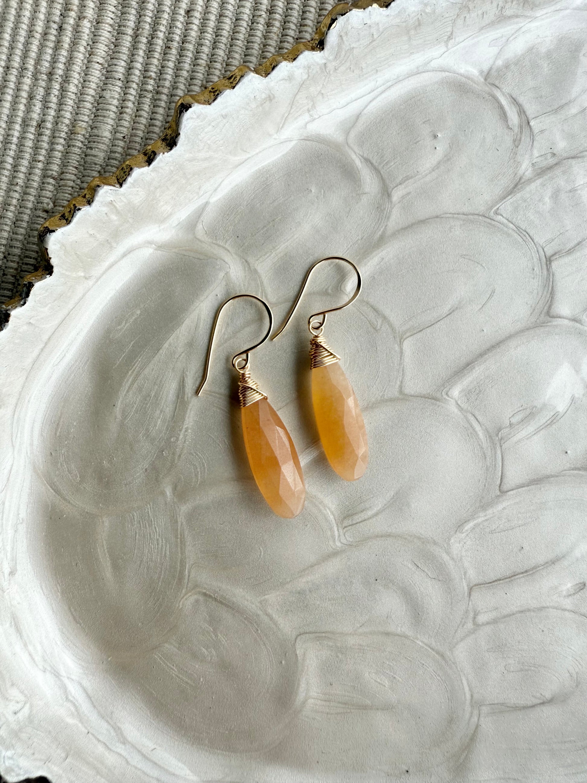 These earrings feature a large faceted peach moonstone wire-wrapped from a handcrafted traditional ear wire creating an elegant look. Only one pair available in 14k gold filled.