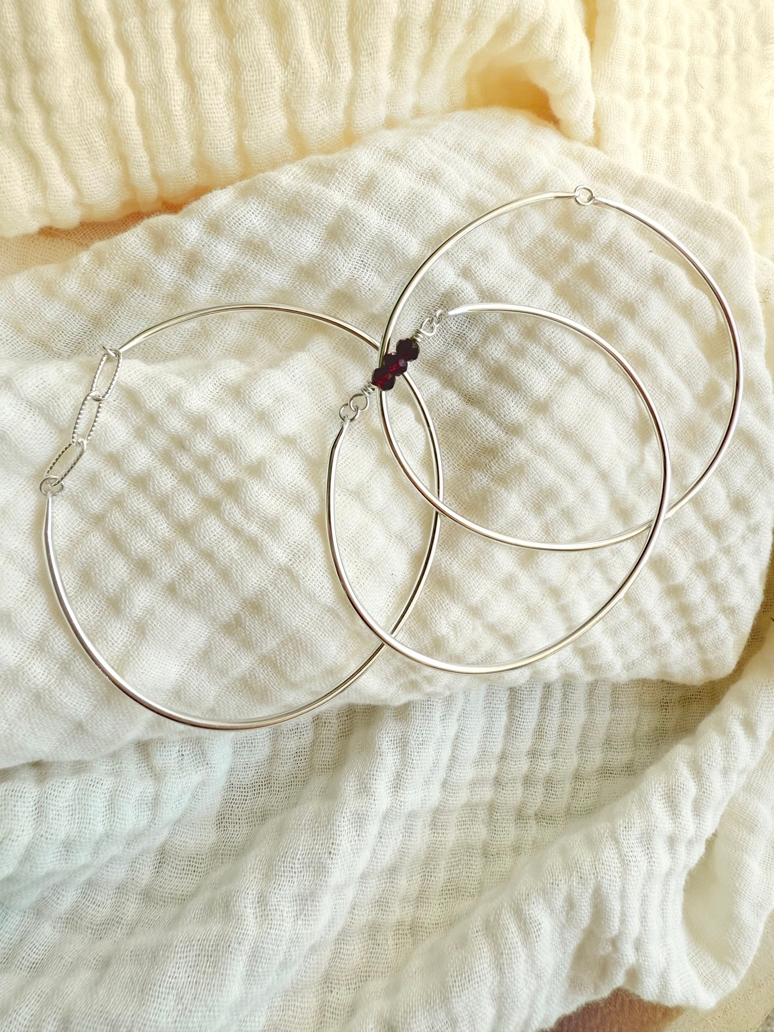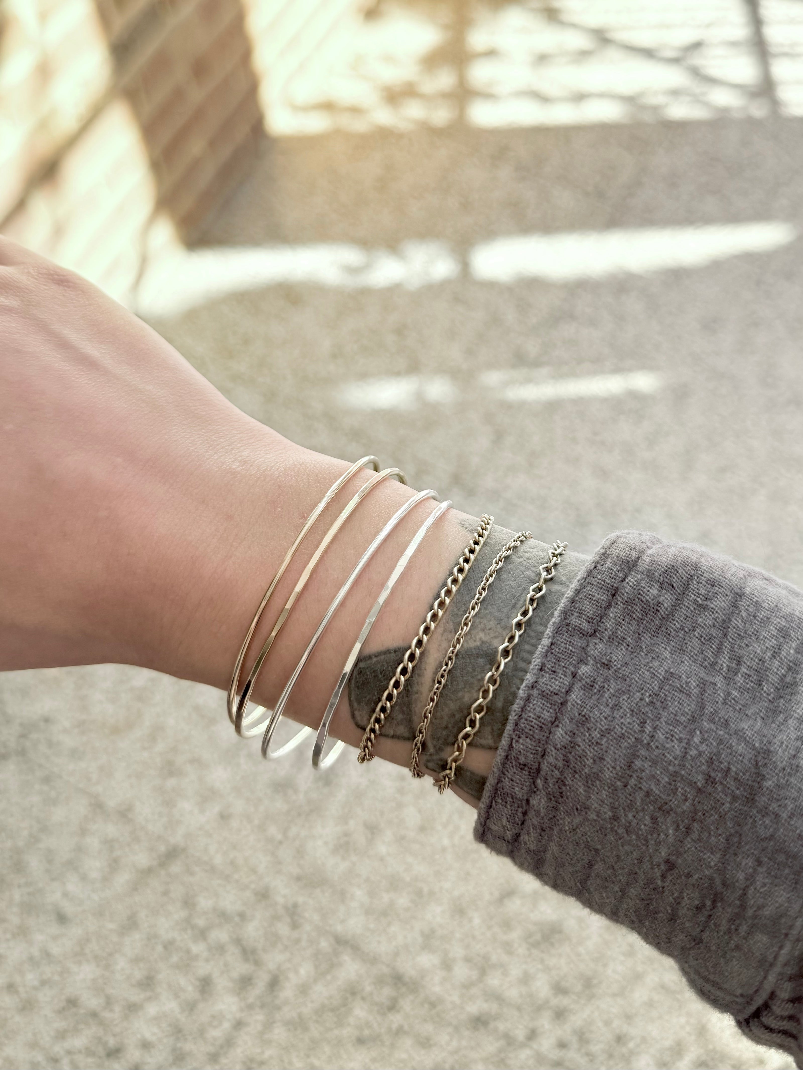 Designed for a comfortable fit with options for a smooth or hammered finish. Choose to wear your bangle plain, with gemstones, a hand stamped disc, or a piece of chain.