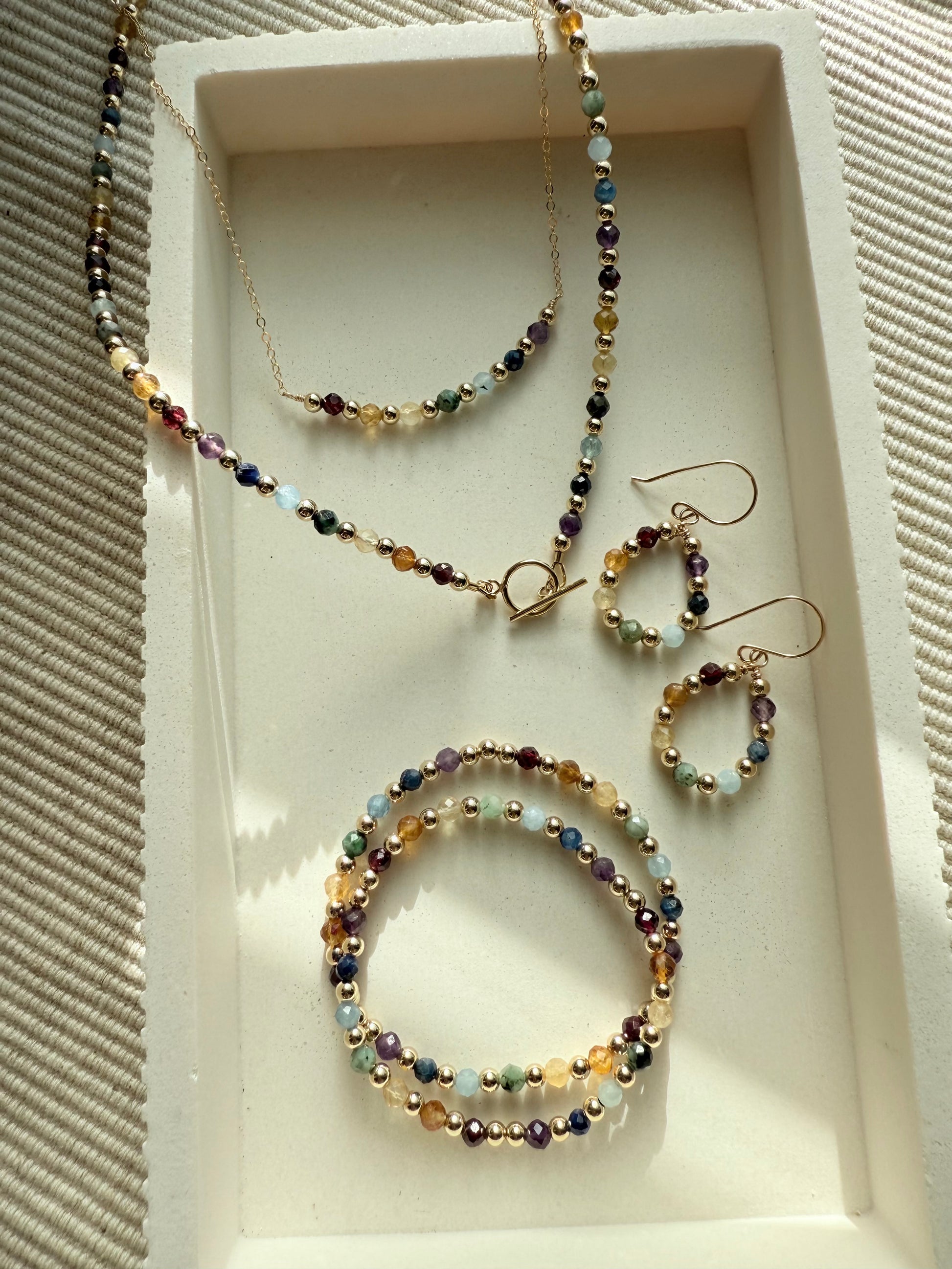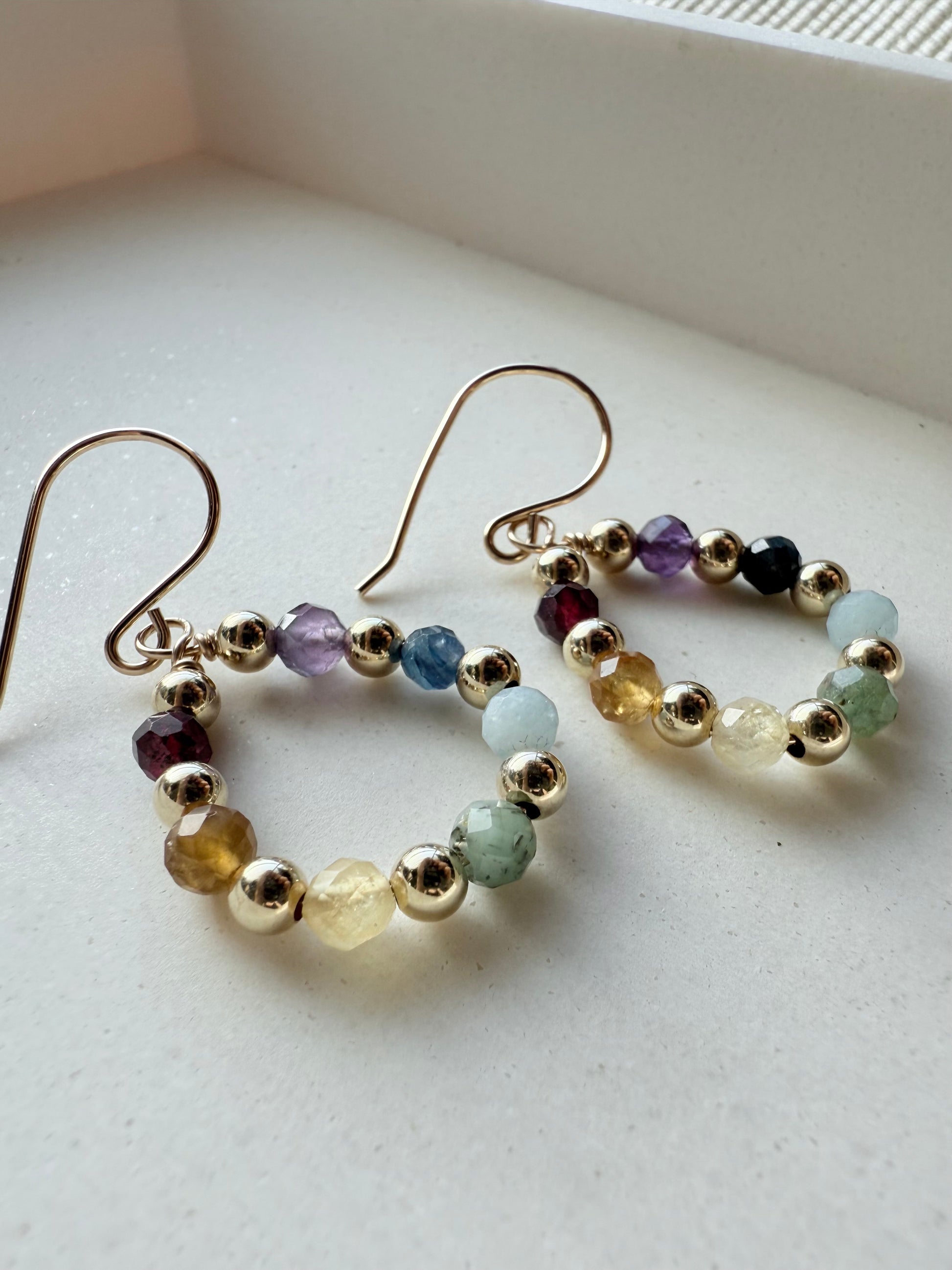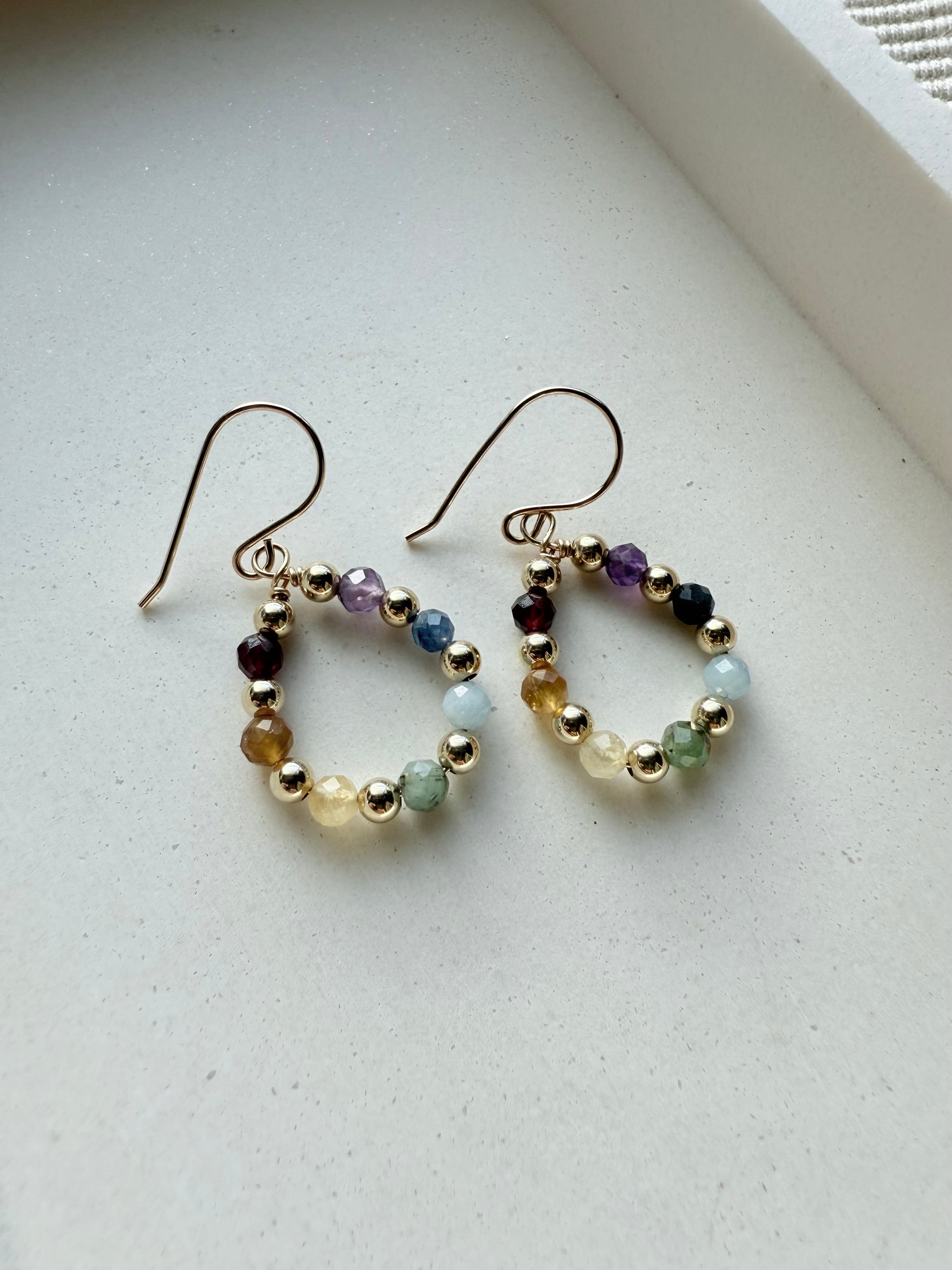These tear drop shaped earrings feature 4mm faceted genuine gemstones representing each color of the rainbow, paired with your choice of 14k gold filled or sterling silver 4mm accent beads for a timeless touch of shine.