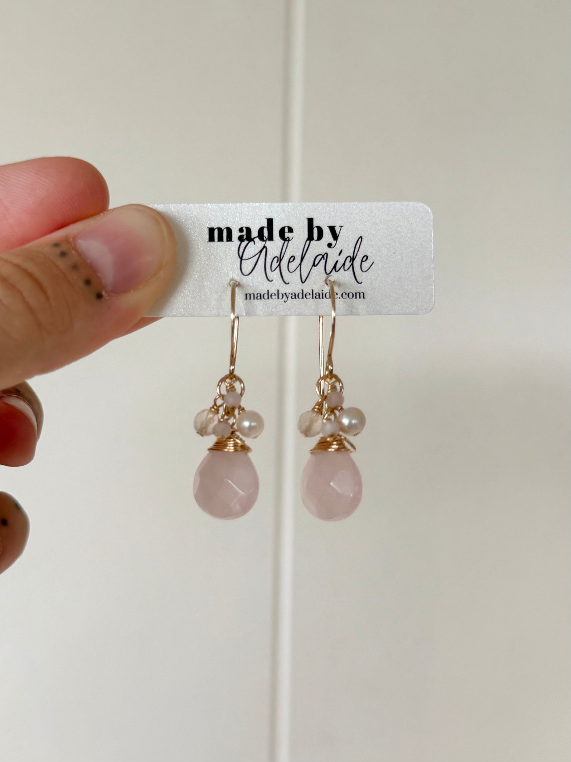 These earrings feature a large wire-wrapped faceted rose quartz stone that dangles beneath a cluster of smaller faceted rose quartz and moonstone beads, as well as freshwater Pearl creating a deep and elegant look.