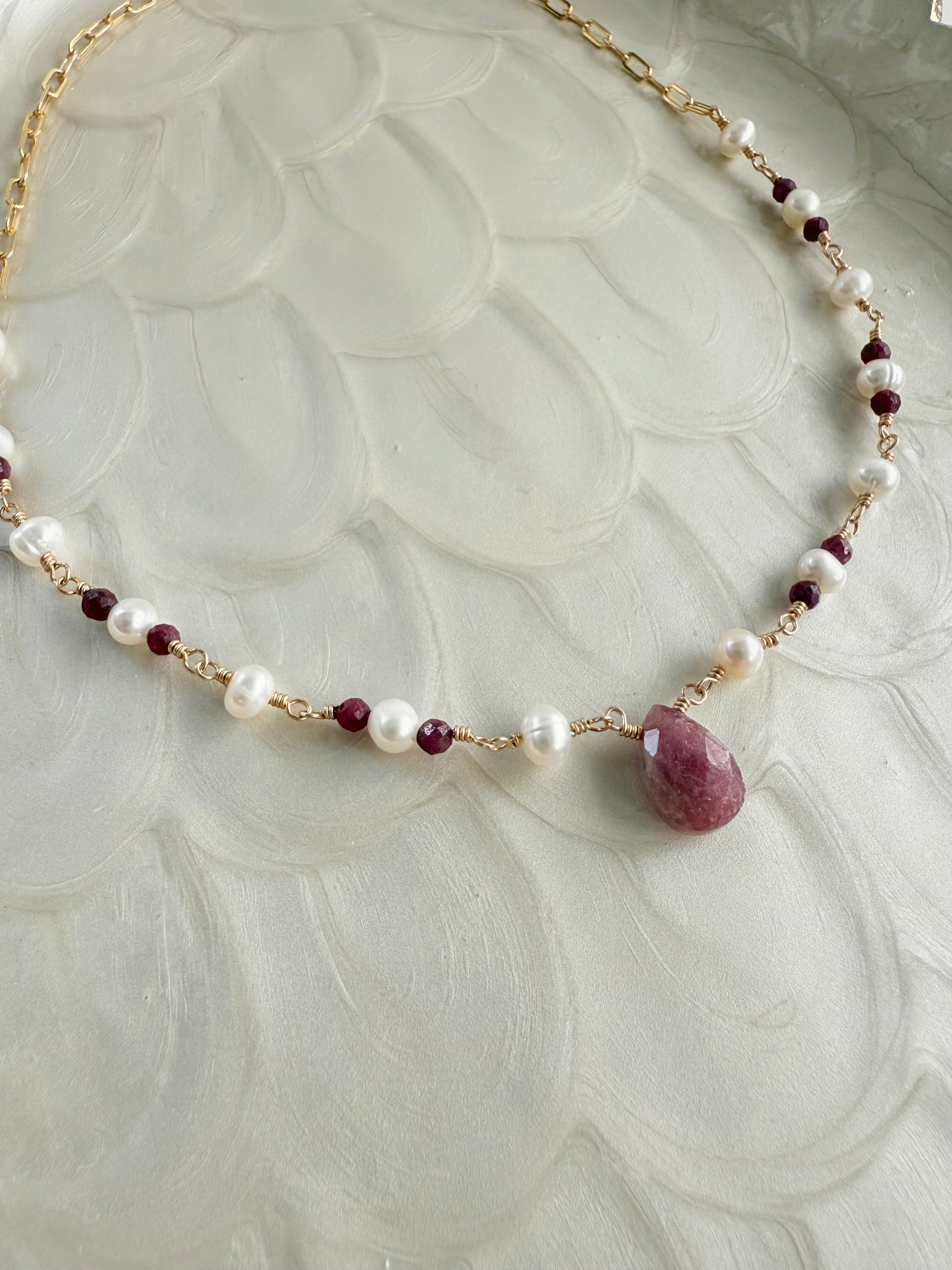 - Design Details: Dainty wire-wrapped beads with a bold faceted ruby pendant at the center and a paper clip chain