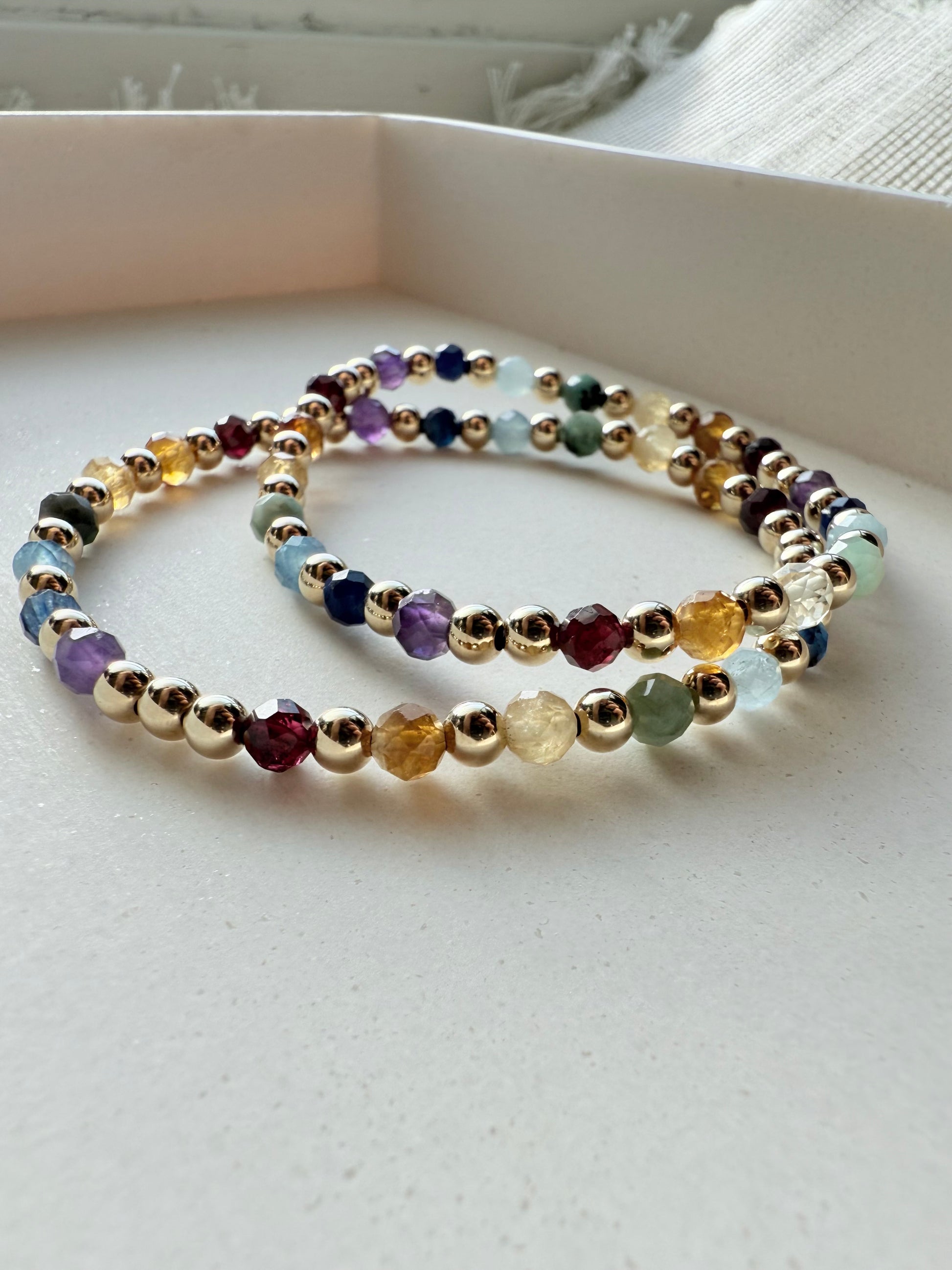 This meaningful bracelet features 4mm faceted genuine gemstones representing each color of the rainbow, paired with your choice of 14k gold filled or sterling silver 4mm accent beads for a timeless touch of shine.