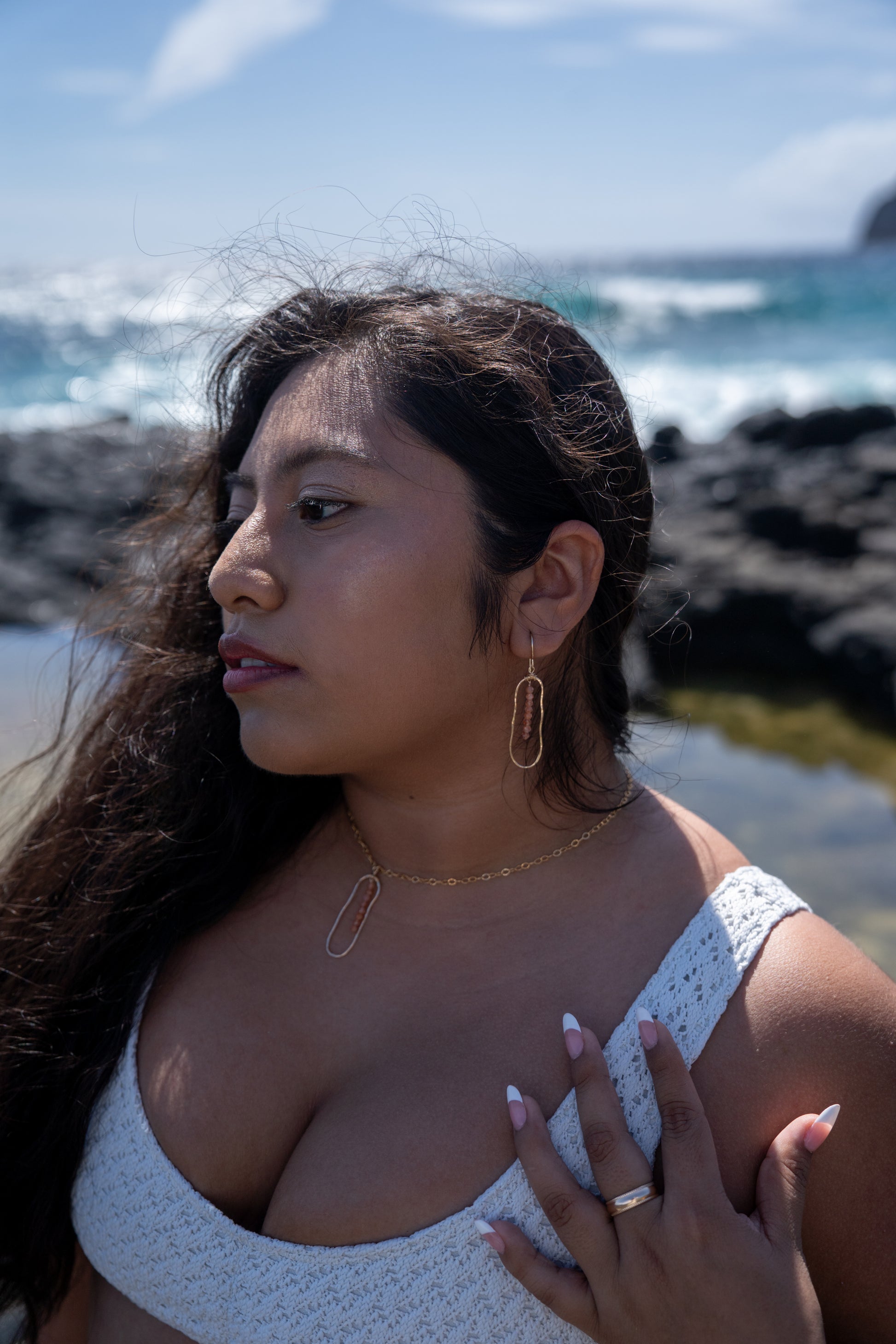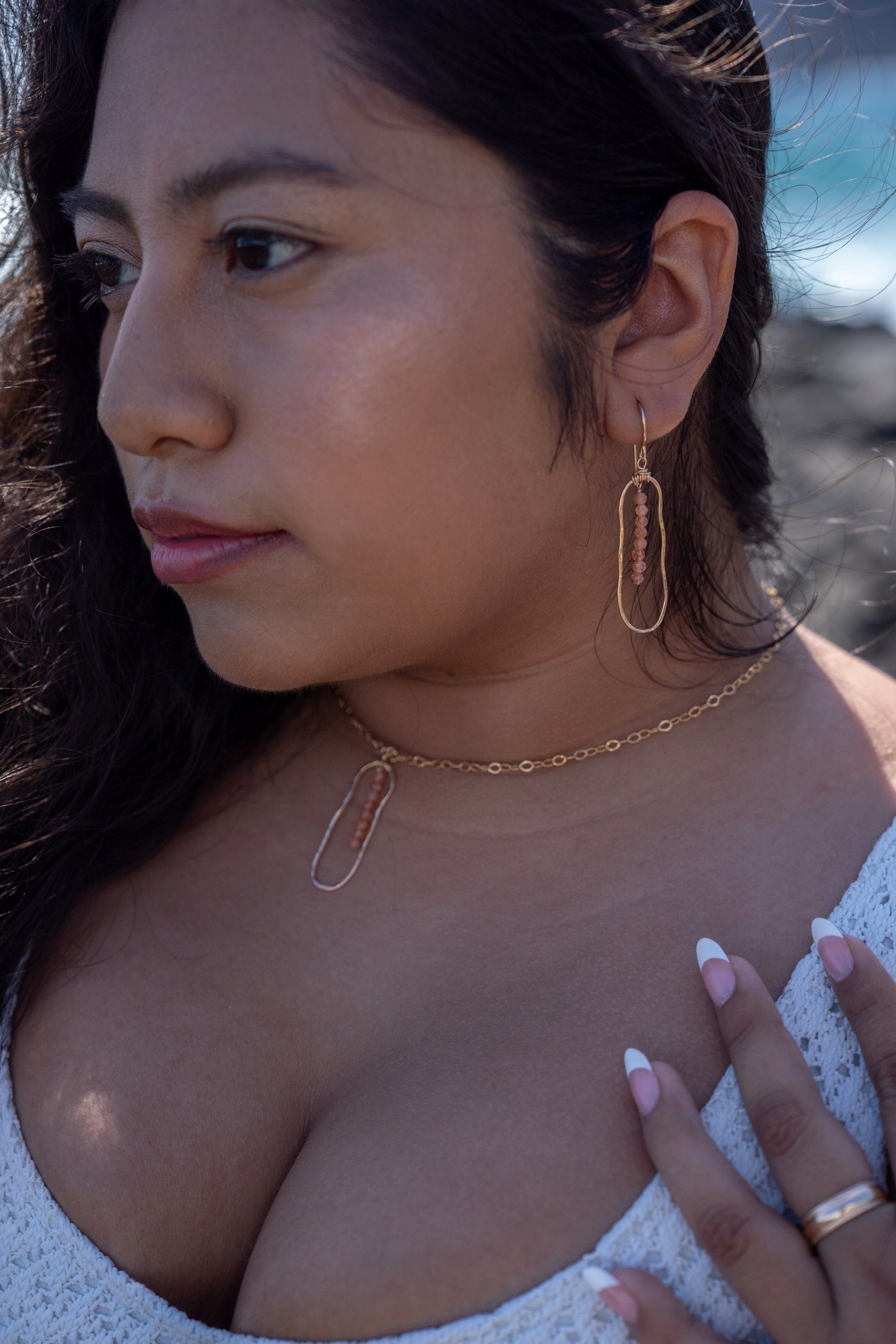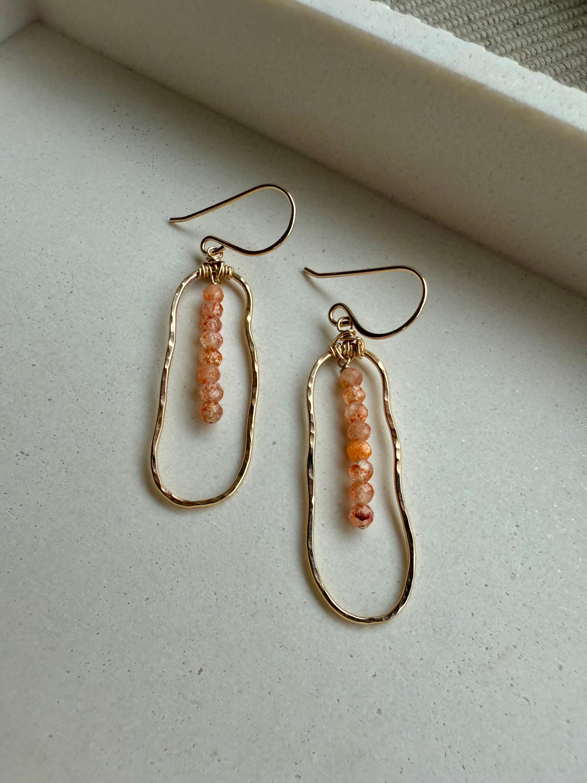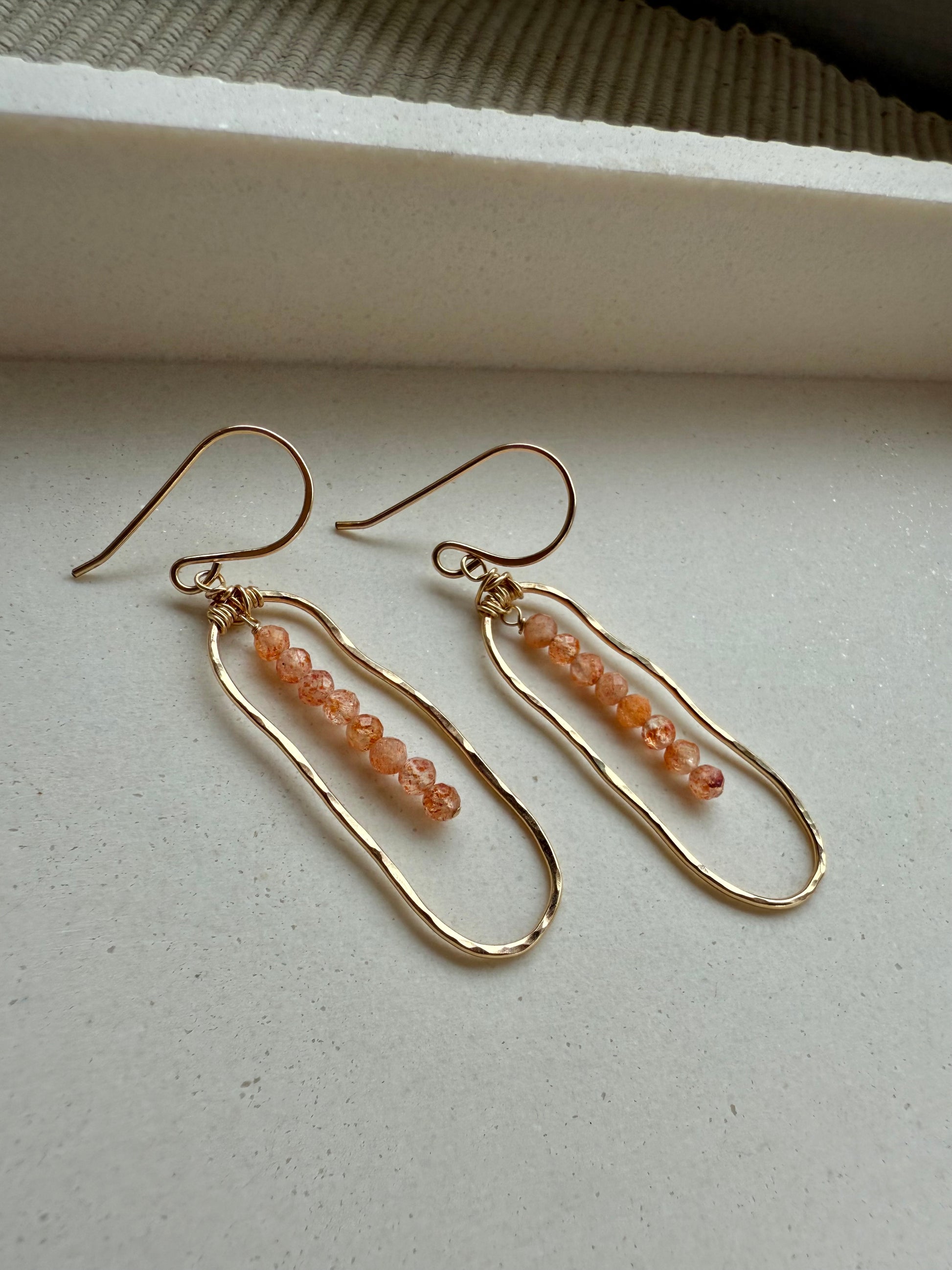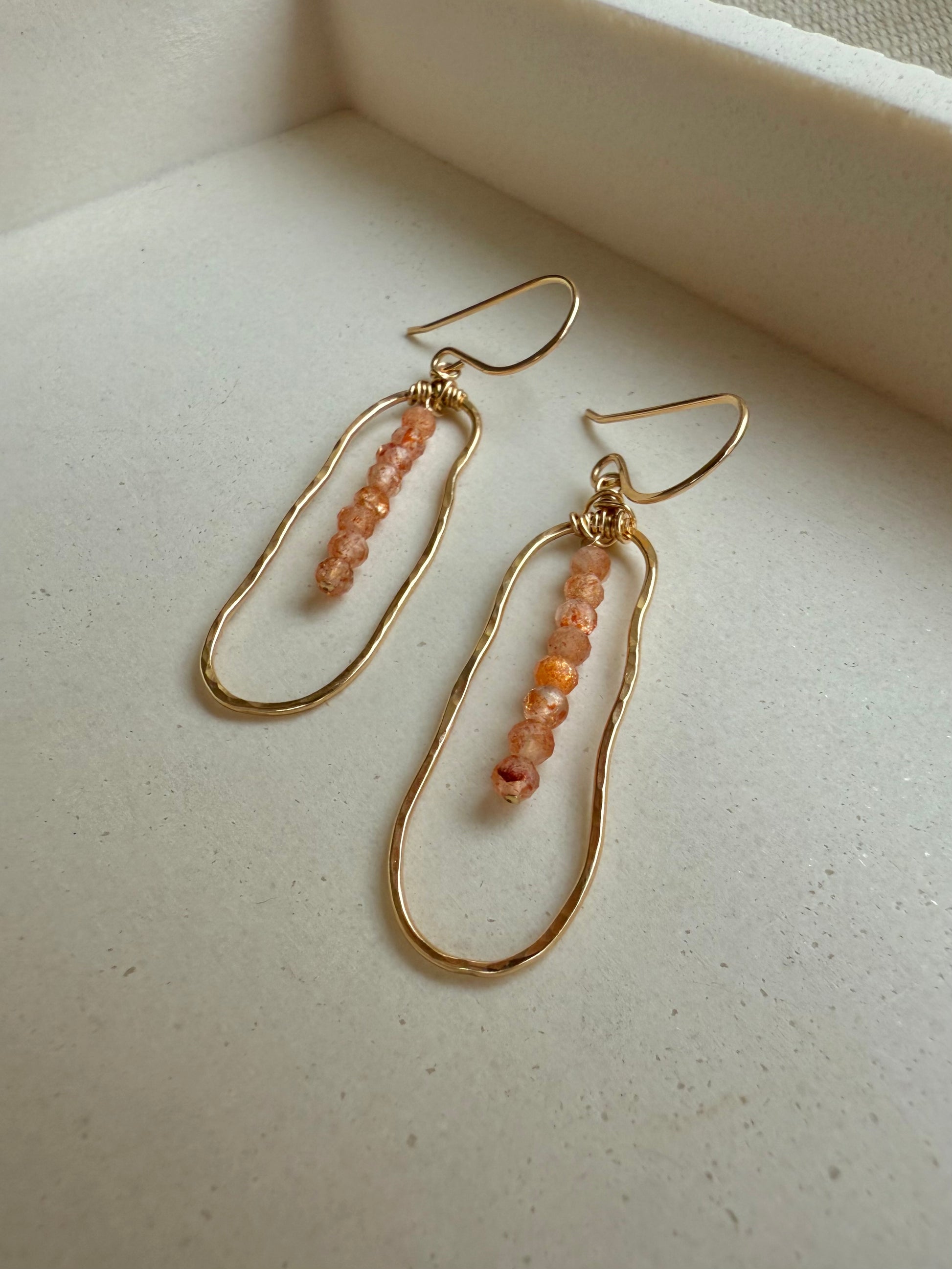 Radiating warmth and light, these hand-forged earrings feature faceted sunstone beads wire-wrapped inside organic, hammered gold-filled or sterling silver frames. The soft shimmer and rich golden-orange hue catch the light with every movement—just like sunlight on the sea.