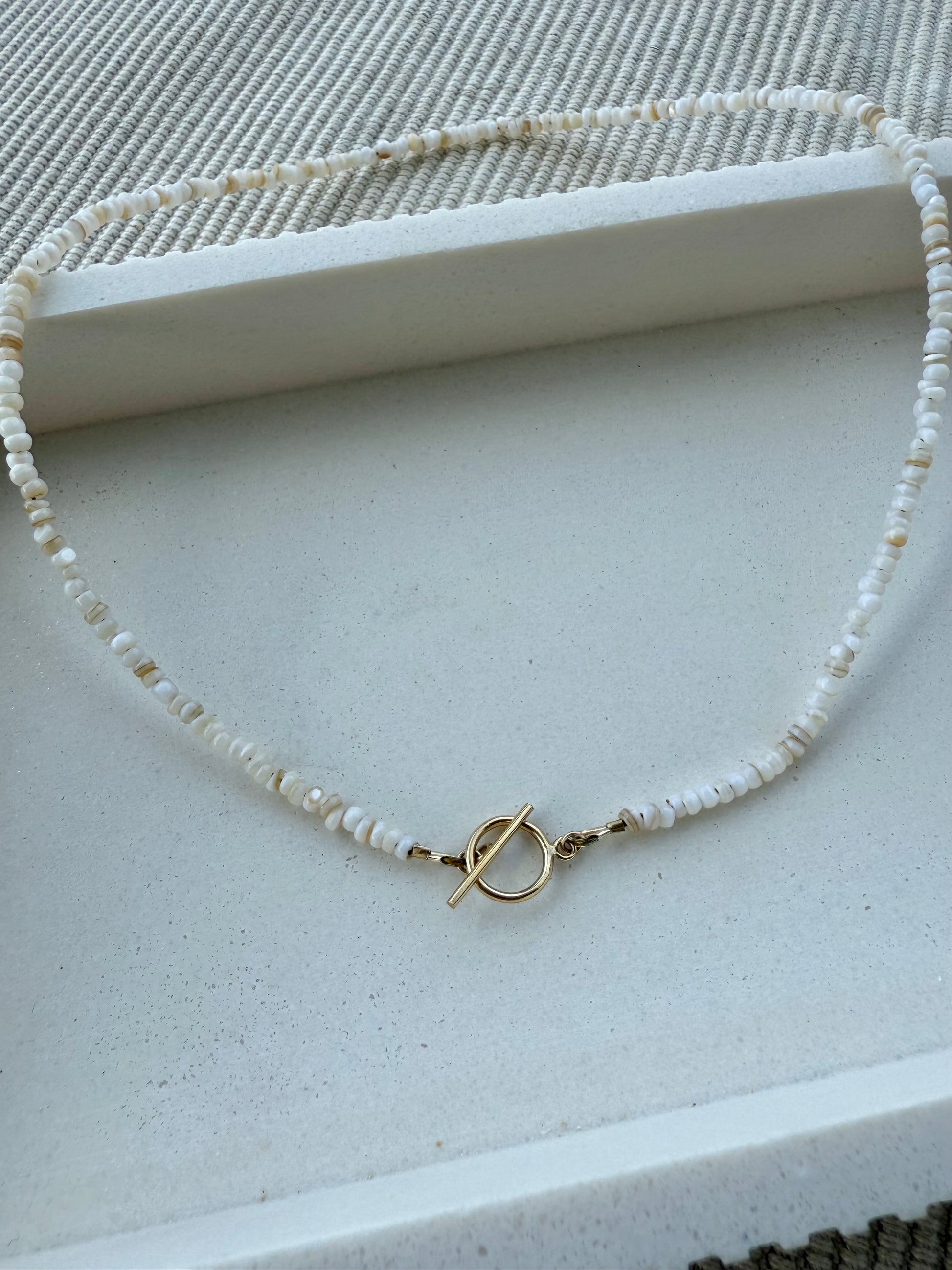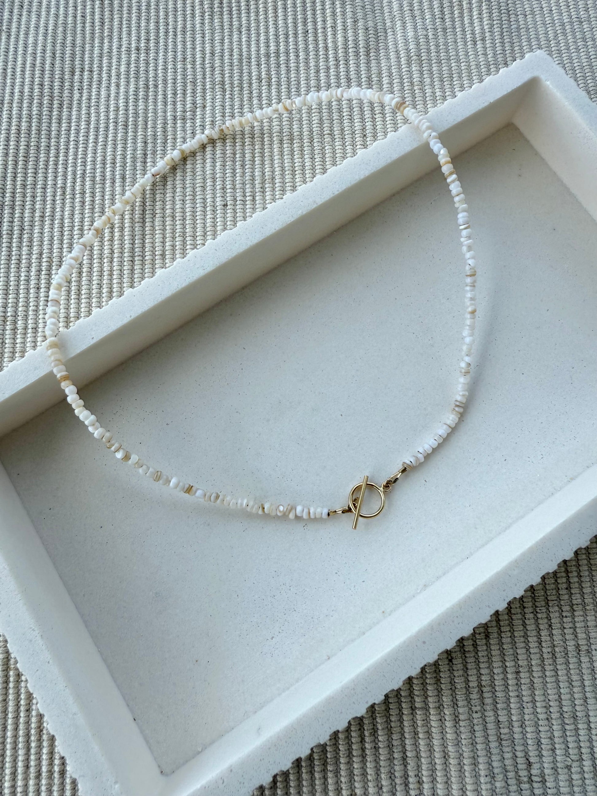 Delicate and effortlessly elegant, this beaded necklace features 3x2mm dyed beige freshwater shell beads with a soft, natural sheen. Each necklace is hand-beaded to order, making it a unique piece crafted just for you.