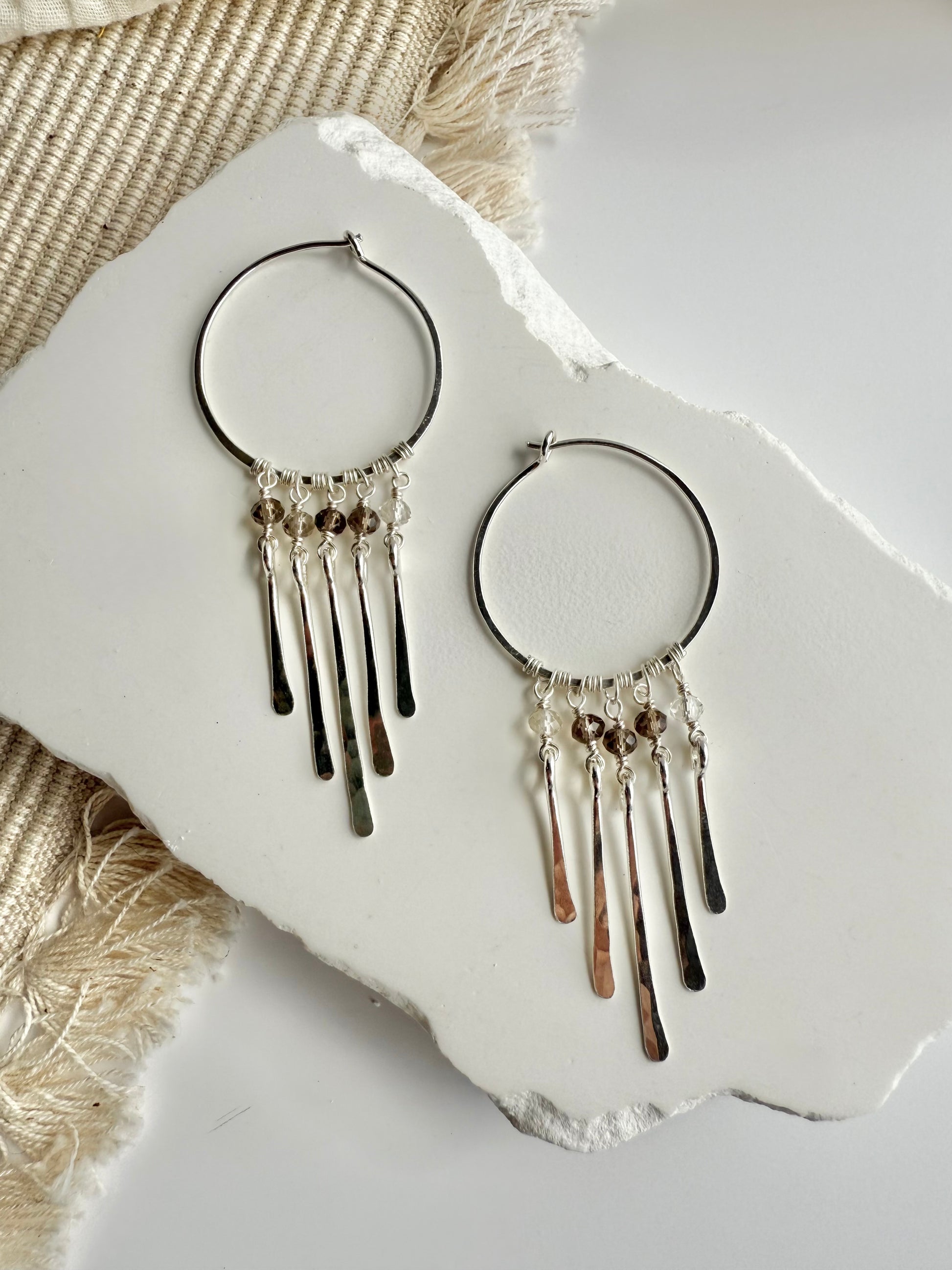 These hoop earrings showcase AAA grade faceted smoky quartz stones, carefully hand-selected with a subtle ombre effect. Set on hand-forged and hammered sterling silver hoops, they feature delicate fringes that create a stunning chandelier effect, catching the light with every movement.
