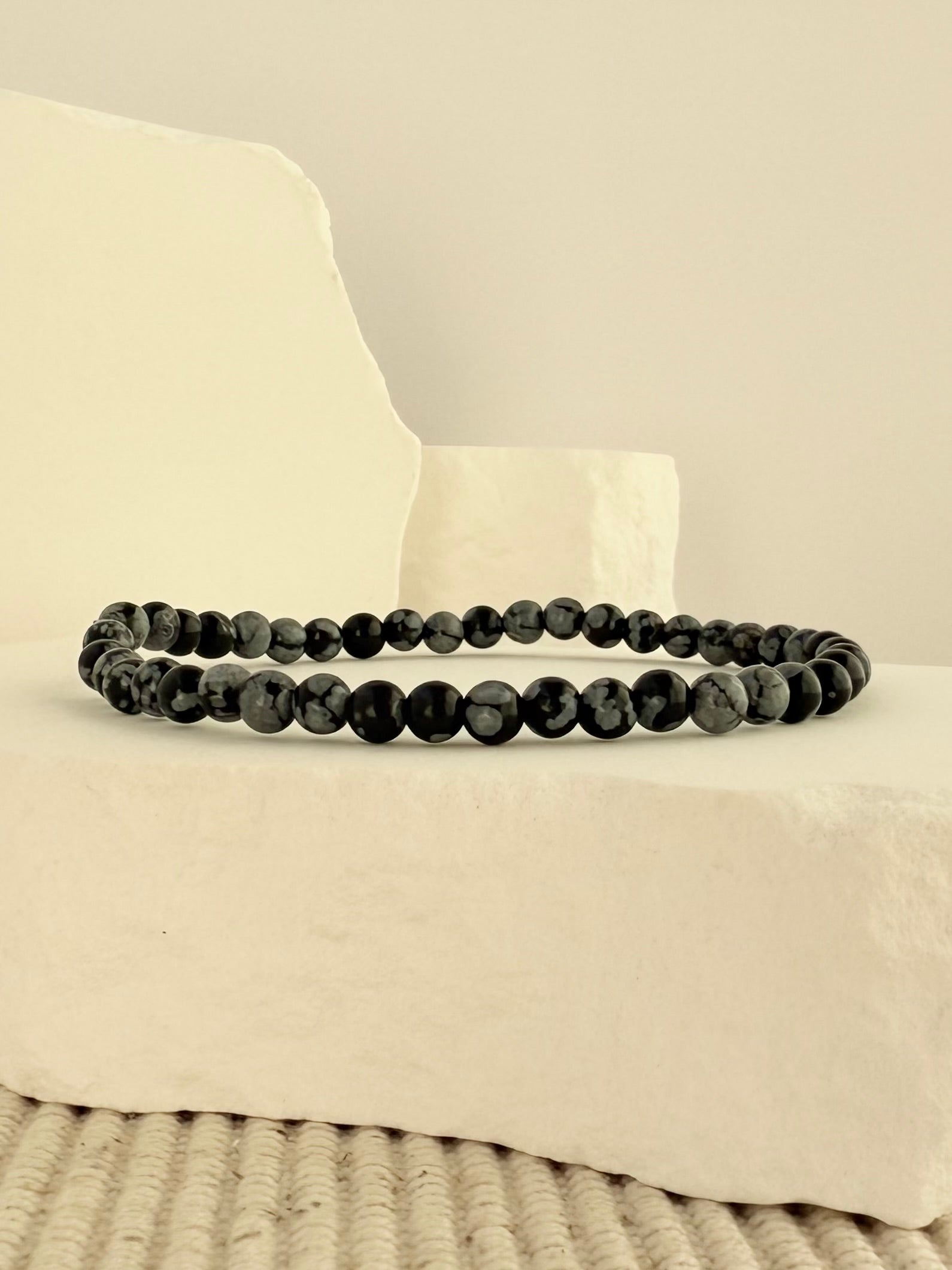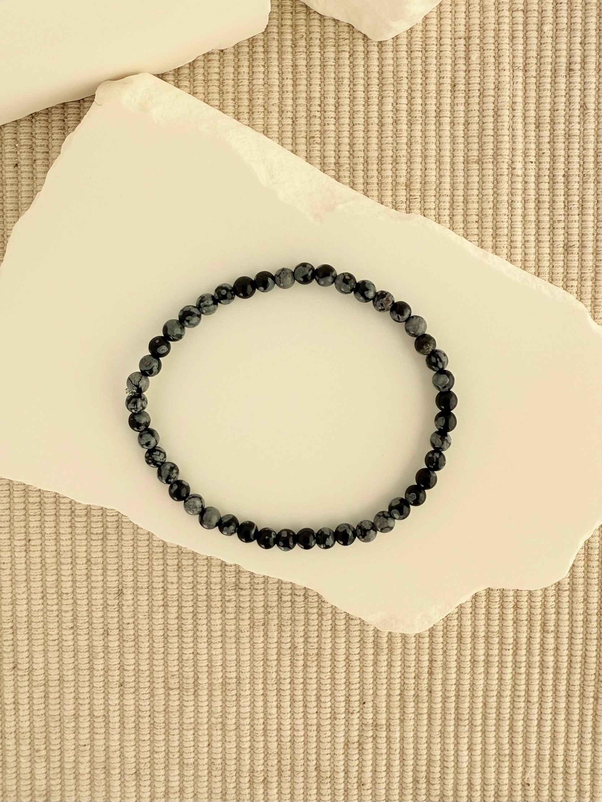 A sleek and grounding bracelet made with 4mm Snowflake Obsidian beads, hand-strung with care for a smooth, comfortable fit. Each stone features unique gray-white “snowflake” patterns against a deep black base, making every piece one-of-a-kind. Perfect worn alone or stacked with your favorites for a bold yet neutral accent.