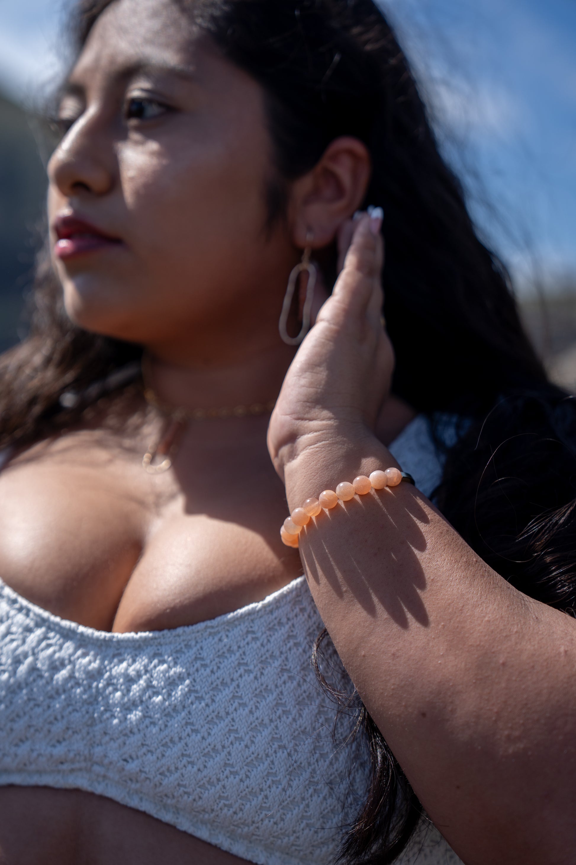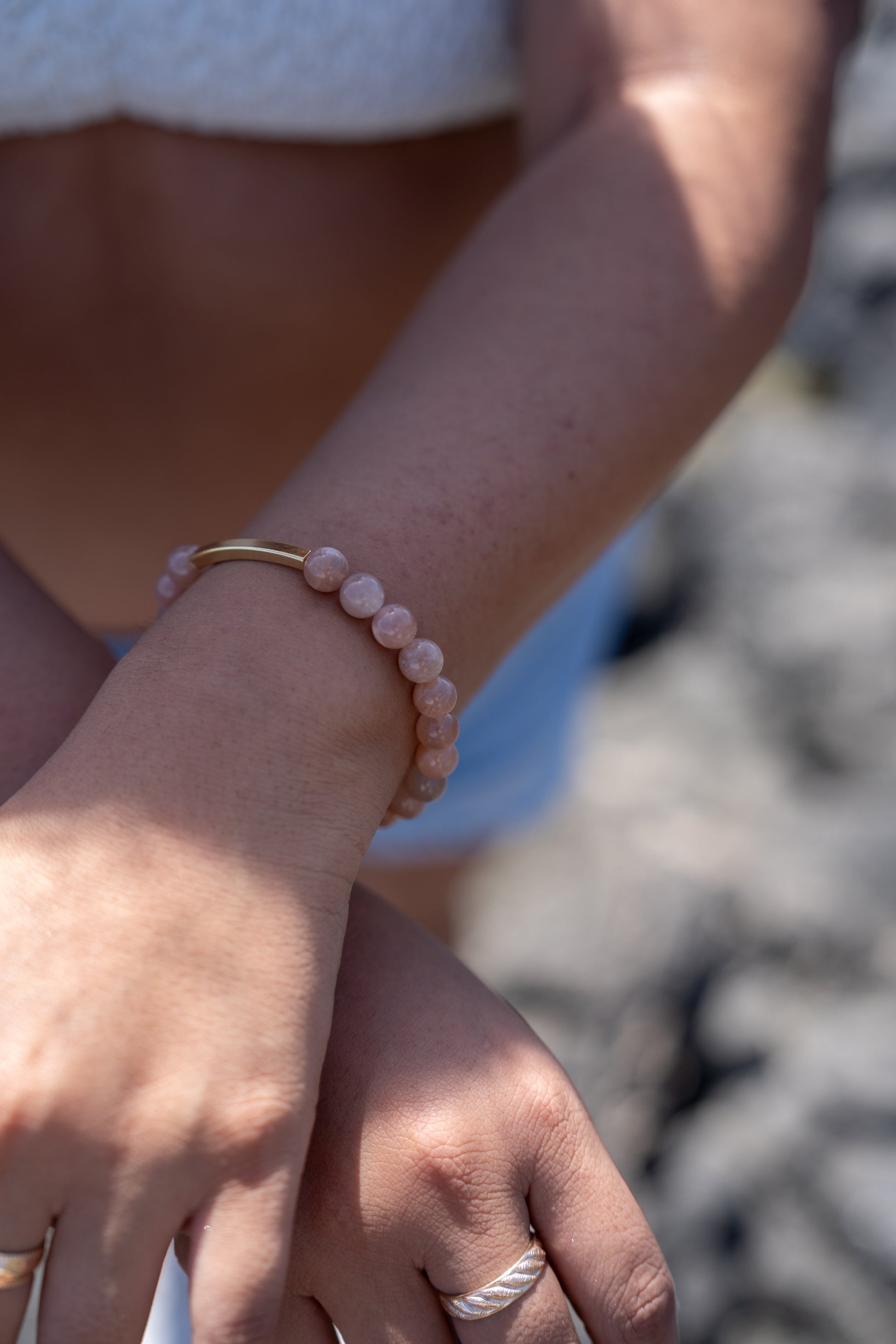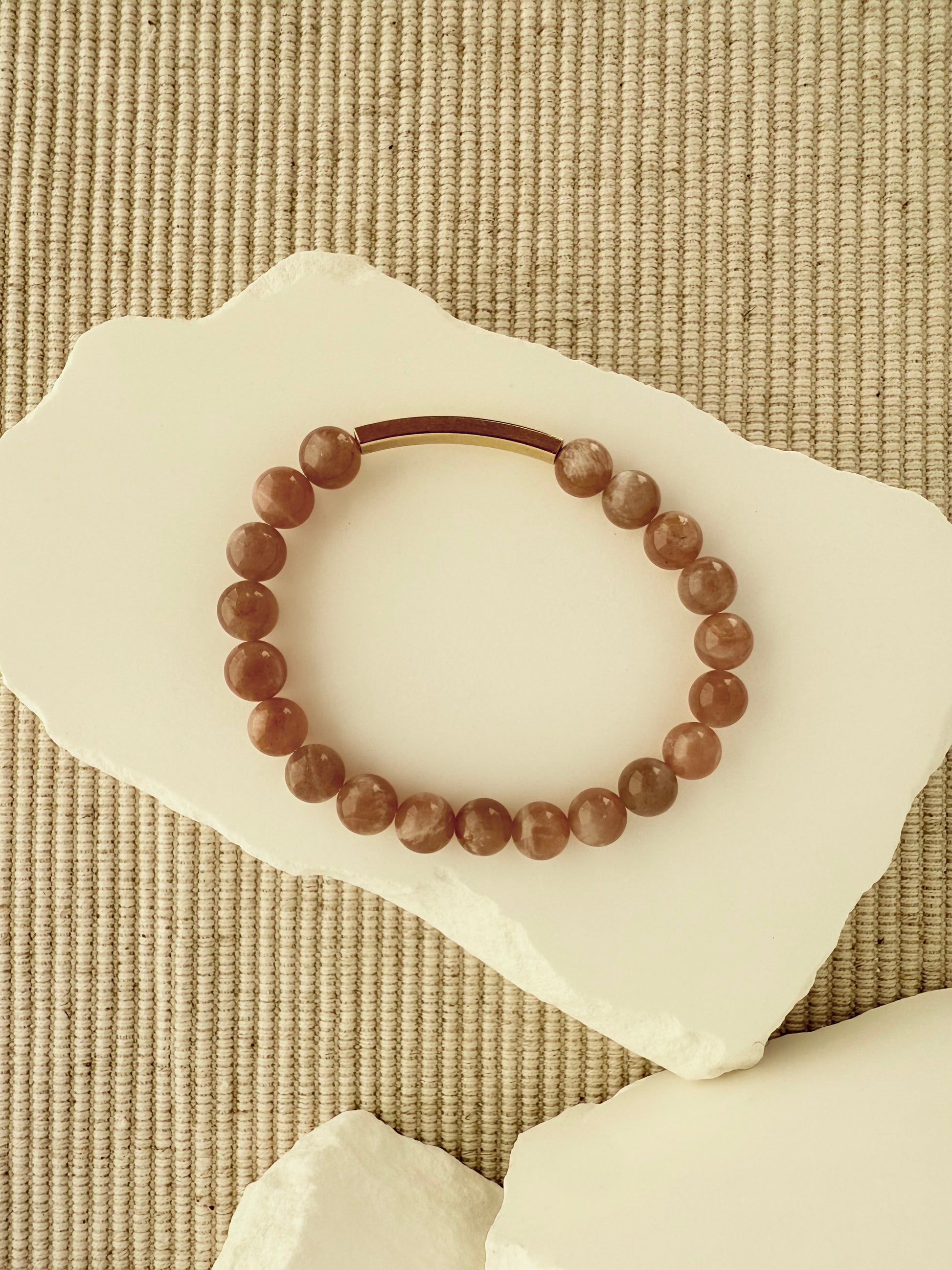 This radiant bracelet features 8mm Sunstone beads paired with a sleek gold-plated stainless steel bar for a modern, sun-kissed look. With warm peachy tones and natural shimmer, it adds the perfect glow to your stack—or shines all on its own.