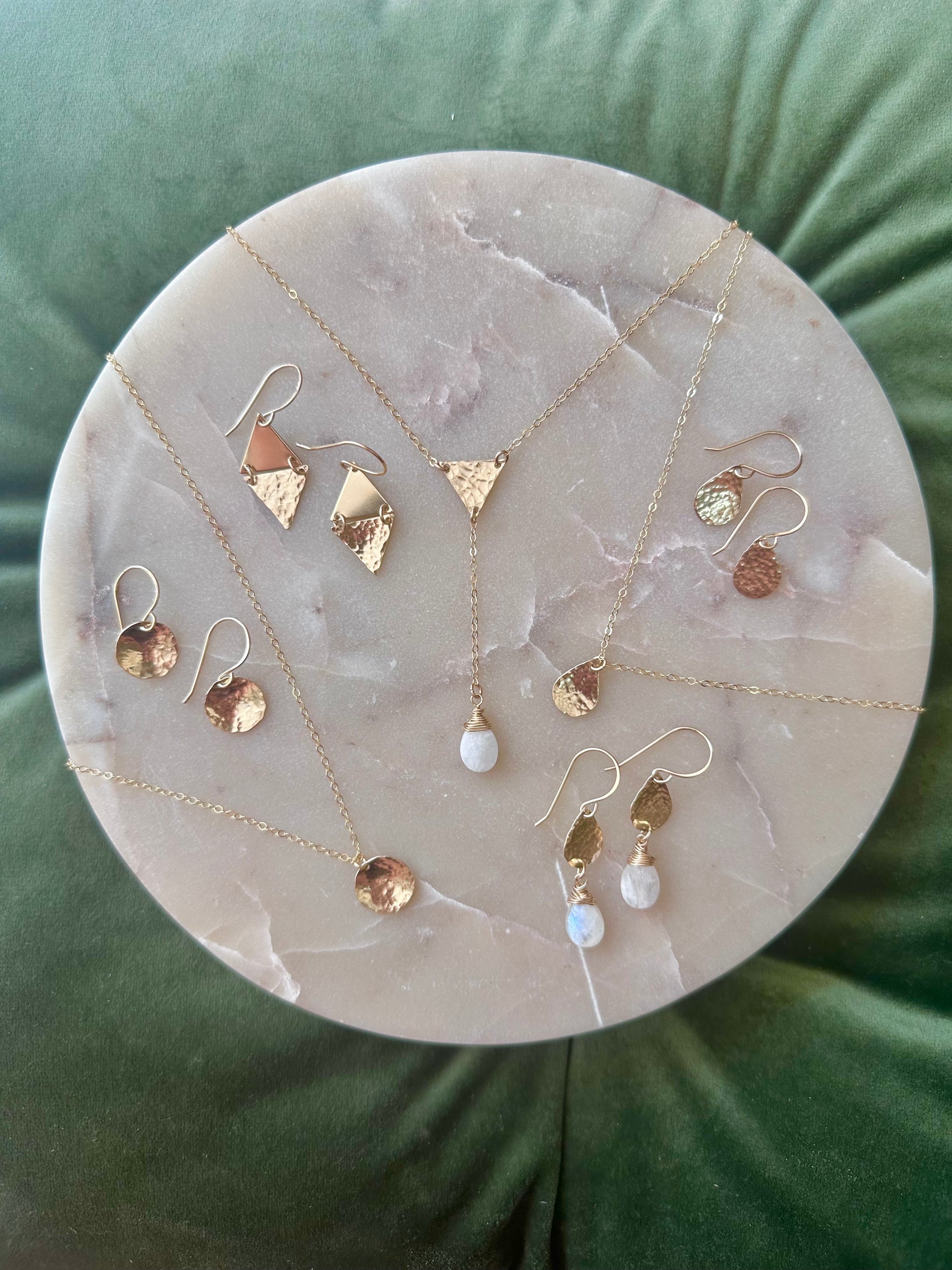 These earrings feature a small tear drop. I cut every tear drop & hammer them to add uniqueness & to catch the light.
