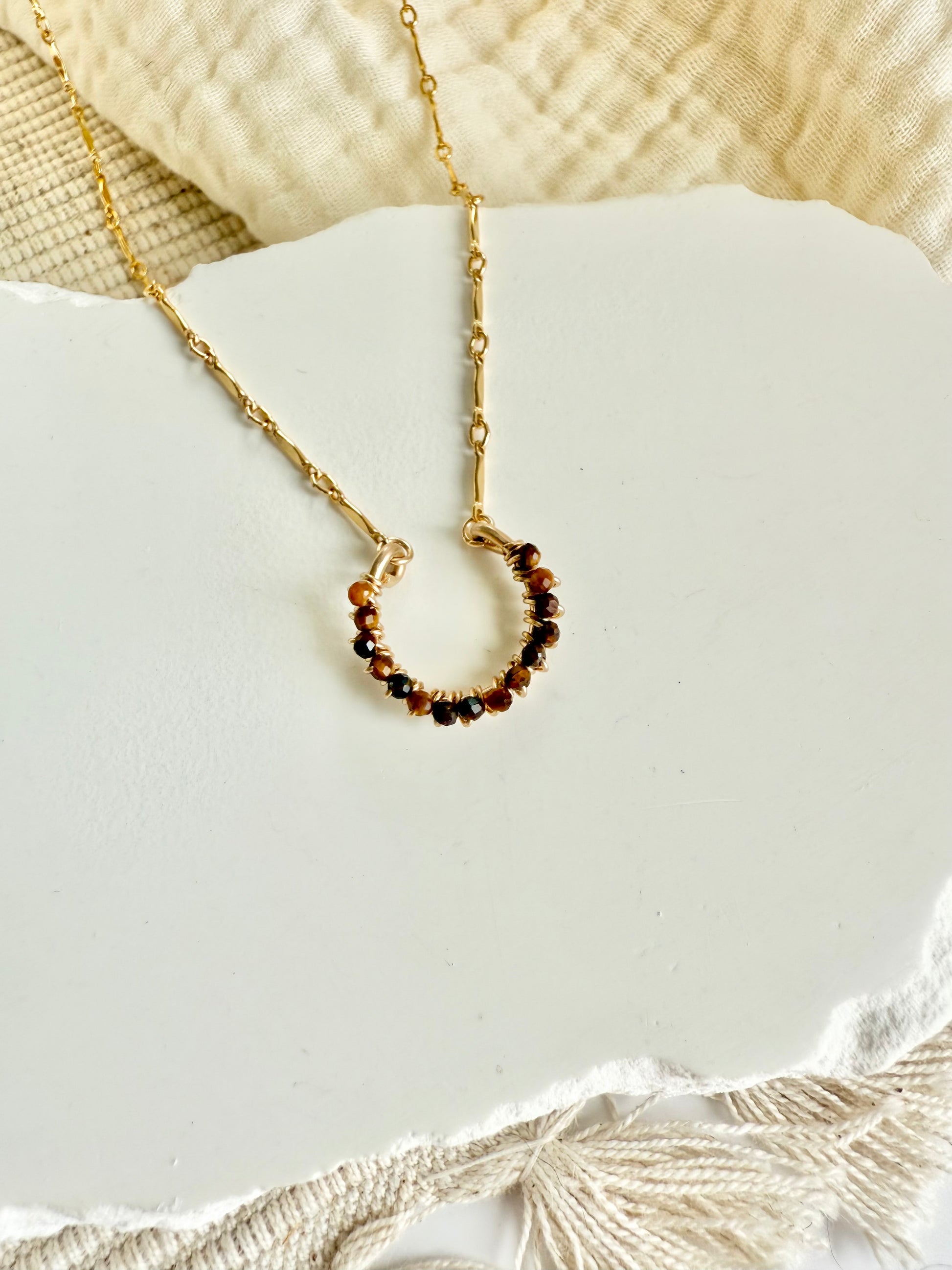 This necklace showcases premium faceted Tiger's Eye beads carefully wire-wrapped onto a hand-forged horseshoe pendant, hanging from our Madonna chain.