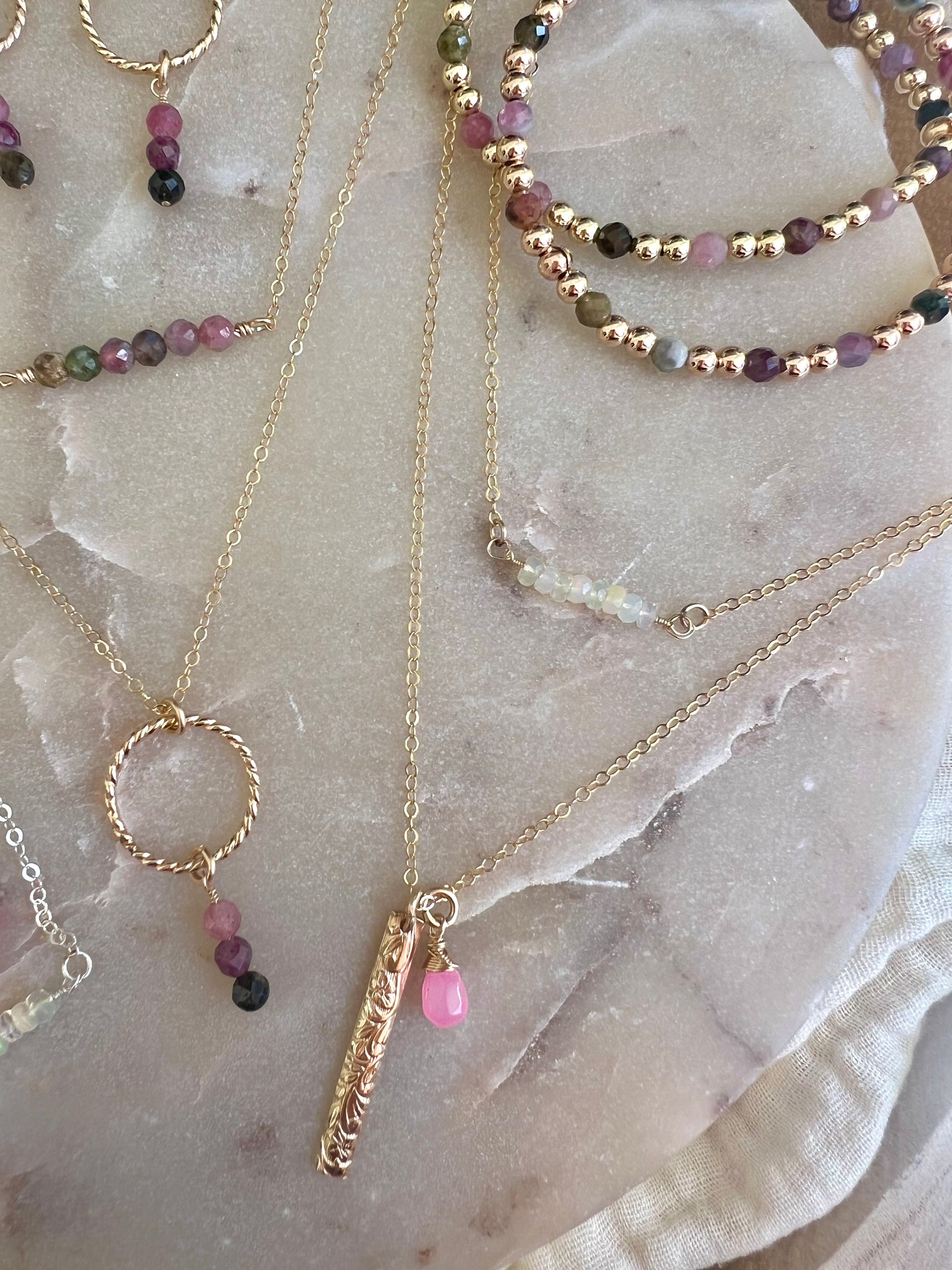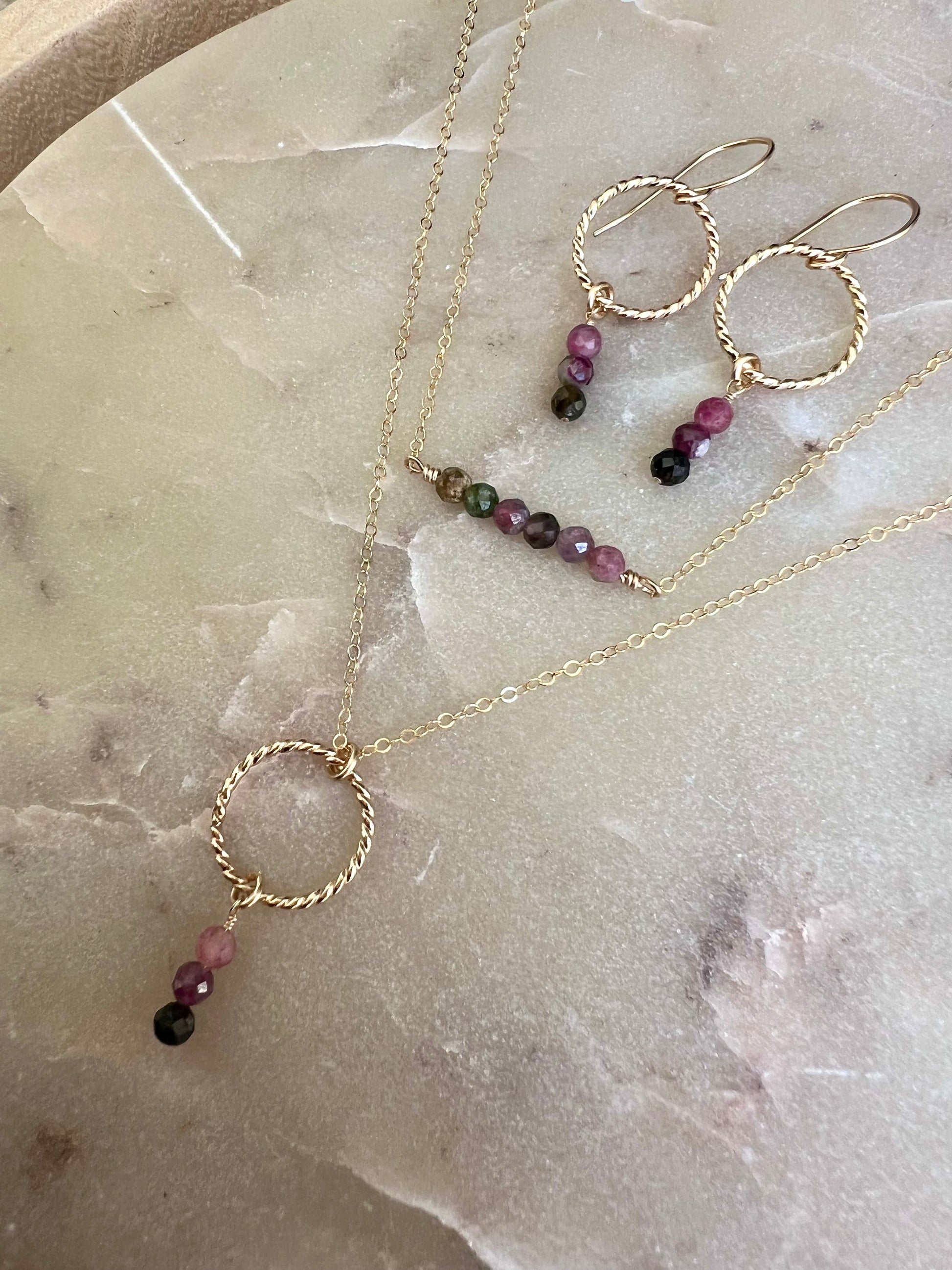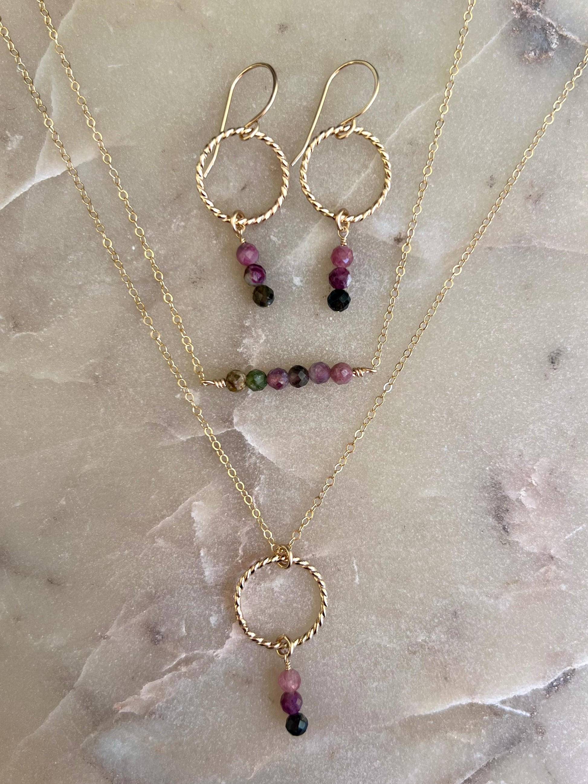 This necklace features high grade faceted tourmaline on our handmade twist ring.